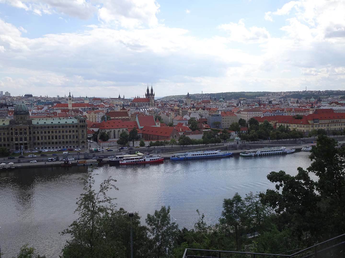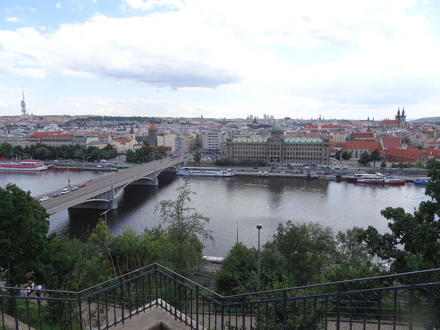 Heute Morgen war es ungewöhnlich kühl und wir kamen gut voran. Eine Routenalternative, die, ohne der Labeschleife zu folgen, direkt zur Moldau geführt hätte, verwarfen wir. Stattdessen hofften wir – nicht zu Unrecht, wie sich zeigte – dass der längere Weg entlang der Flüsse wieder landschaftlich reizvoll sei. Auf dem heute befahrenen Abschnitt liegen Staustufen mit Schleusen und z. T. Wasserkraftwerken. Etwa 23 km vor unserem Ziel zwingt das bis zum Wasser der Moldau reichende Steilufer den Radweg über die im Höhenprofil deutlich erkennbare Erhebung. Die Abfahrt von der zweiten im Höhenprofil sichtbaren Erhebung zur über die Moldau in die Prager Altstadt führende Tschech Brücke war sehr steil und wir vermieden es, scharf bremsen zu müssen. Nach Überqueren der Moldau befanden wir uns mitten in der Prager Altstadt. Voll mit Touristen ist sie zu einem großen Teil für den Autoverkehr gesperrt, sodass wir unsere Räder eine längere Strecke schieben mussten. Trotz des Gewirrs aus Einbahnstraßen erreichten wir problemlos unser Apartment. Am Abend kehrten wir zu Diez‘ großer Freude in ein in der Nähe unserer Unterkunft liegendes indisches Lokal ein und ließen dort den Tag mit einem köstlichen Mahl und dem wohlverdienten böhmischen Fassbier ausklingen.
