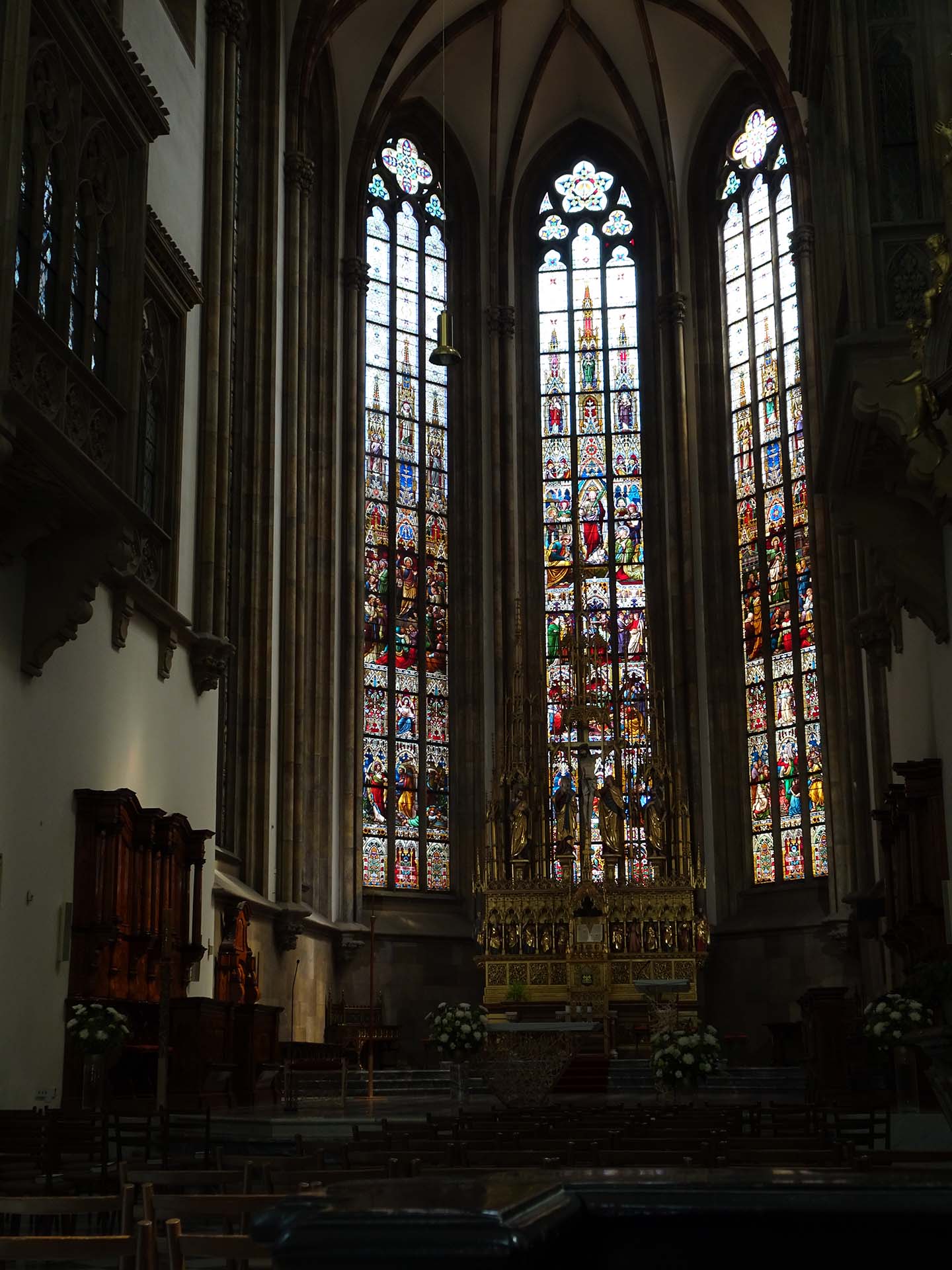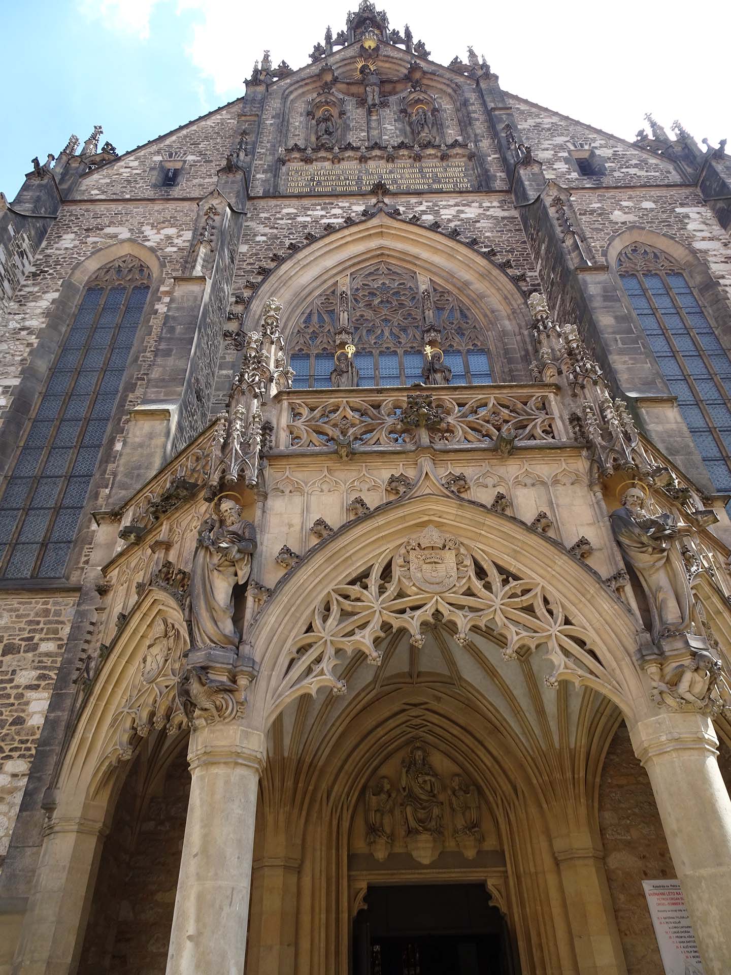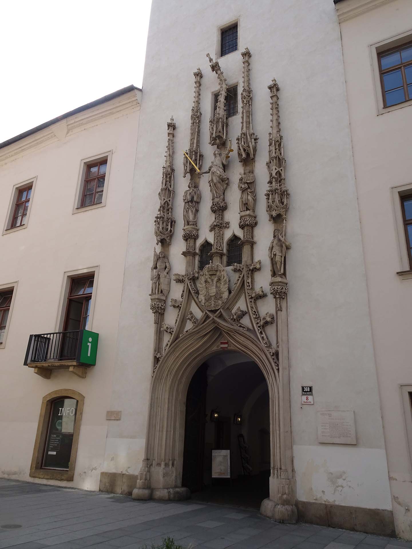 An der anschließend besichtigte Kathedrale St. Peter und Paul fiel uns besonders die bezogen auf die Länge große Breite des Kirchenschiffs auf. Wie in Prag finden sich auch in Brünn zahlreiche Gebäude mit schönen Fassaden, wenn auch nicht in der Anzahl und Dichte wie in der Hauptstadt. Dafür gibt es hier weniger Touristen und die, die hier sind, scheinen den Schwerpunkt nicht so sehr auf den Konsum des guten und günstigen tschechischen Bieres zu legen.