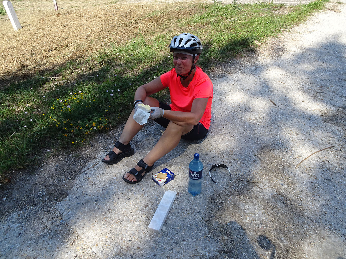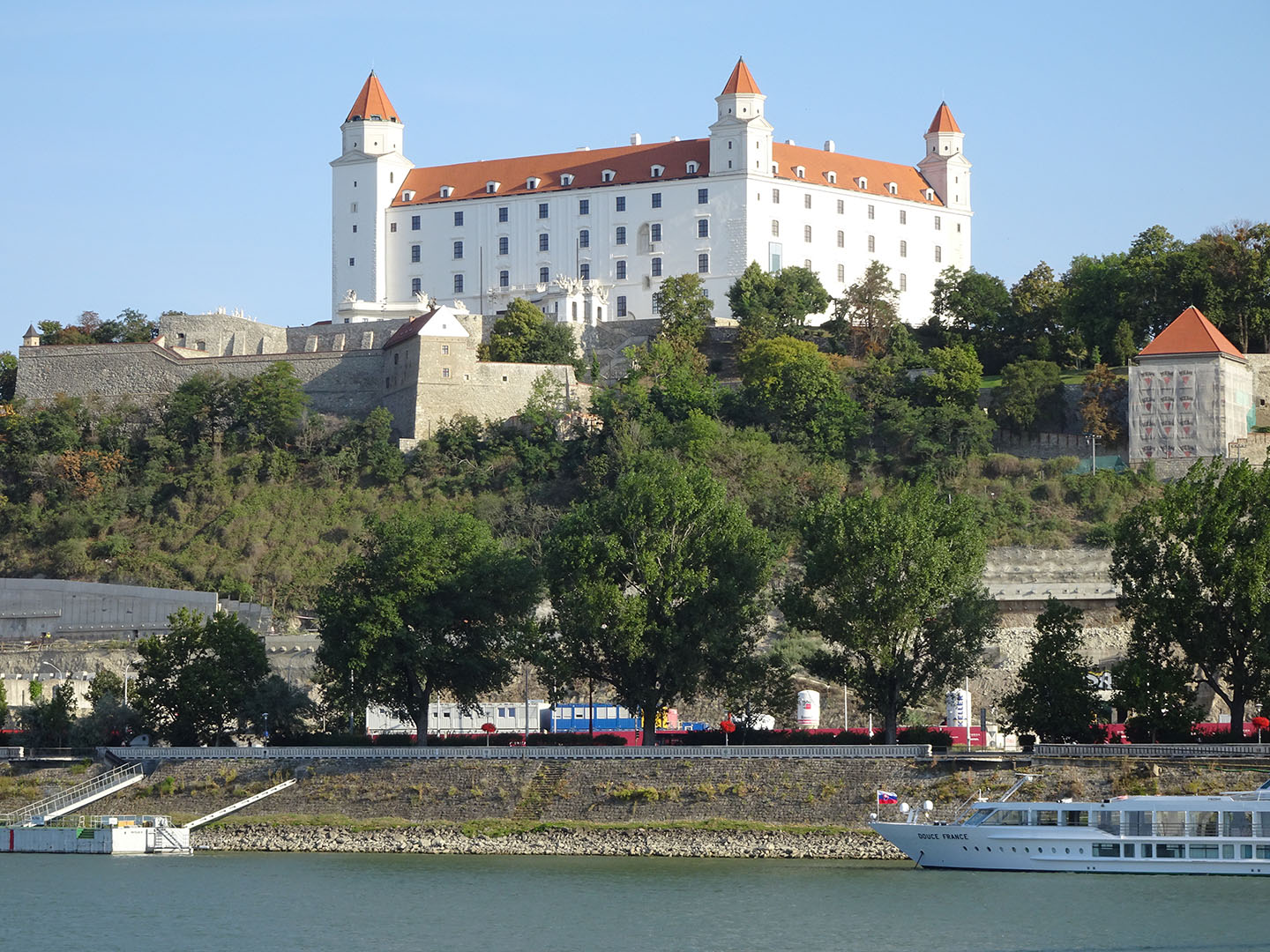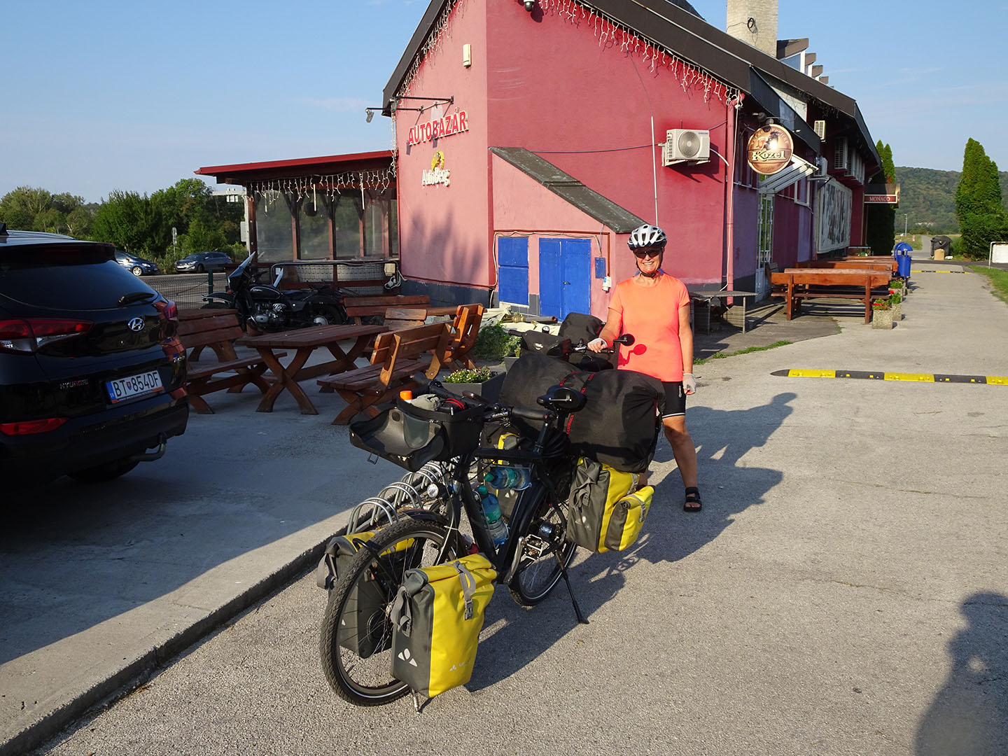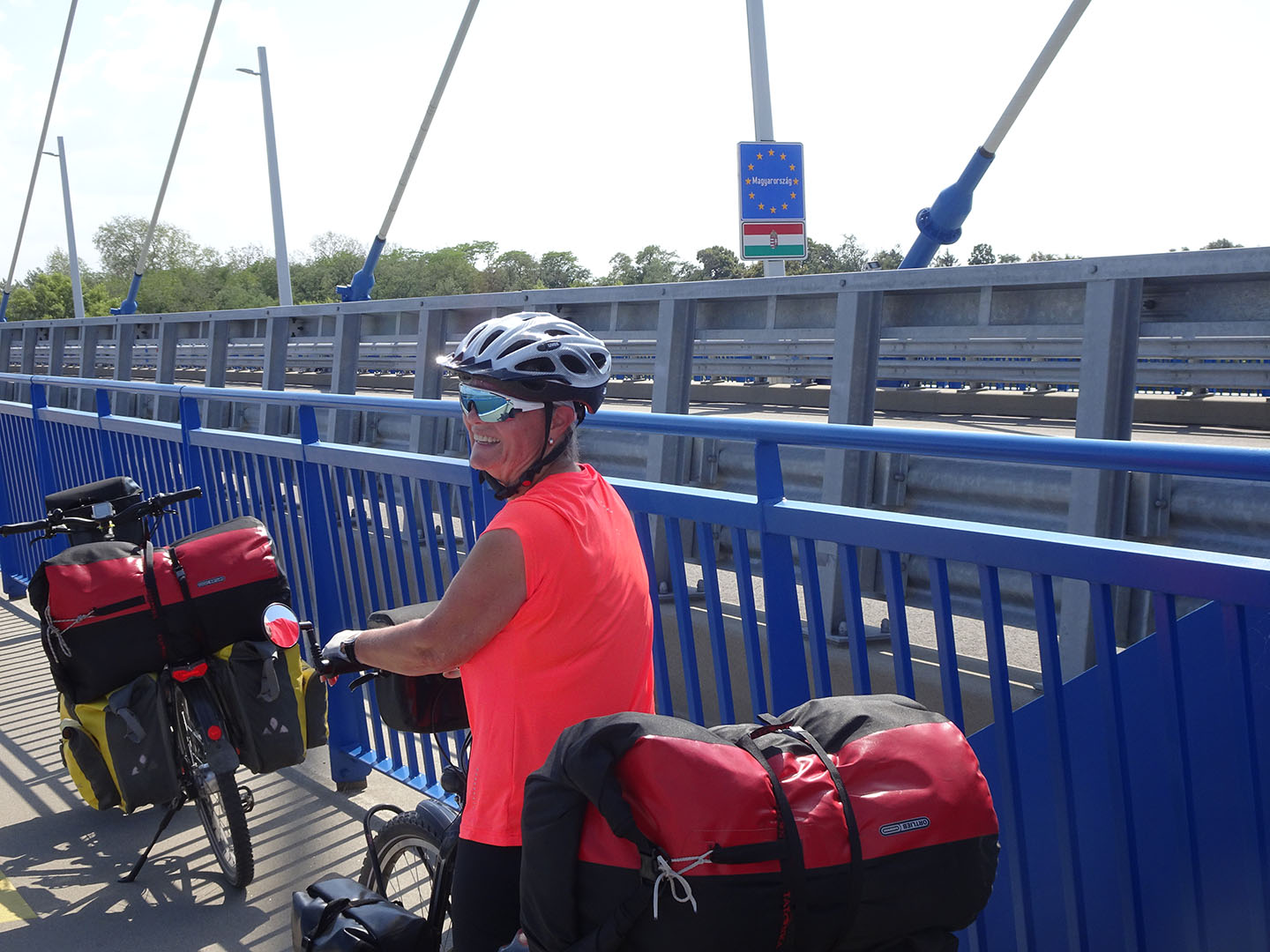 Nur noch wenige Kilometer fuhren wir heute in Österreich, dann passierten wir die Grenze zur Slowakei. Bei Bratislava überquerten wir die Donau und fuhren anschließend fast ausschließlich auf dem links der Donau verlaufenden Damm. Bei erneut uns unterstützendem Rückenwind kamen wir gut voran. Anders als auf vielen der vorangegangenen Etappen hatten wir diesmal keine Unterkunft reserviert, da wir bereits vermuteten, dass wir aufgrund des flachen Höhenprofils und der aktuell vorherrschenden Windrichtung wahrscheinlich weiter fahren könnten als die übliche Distanz.