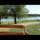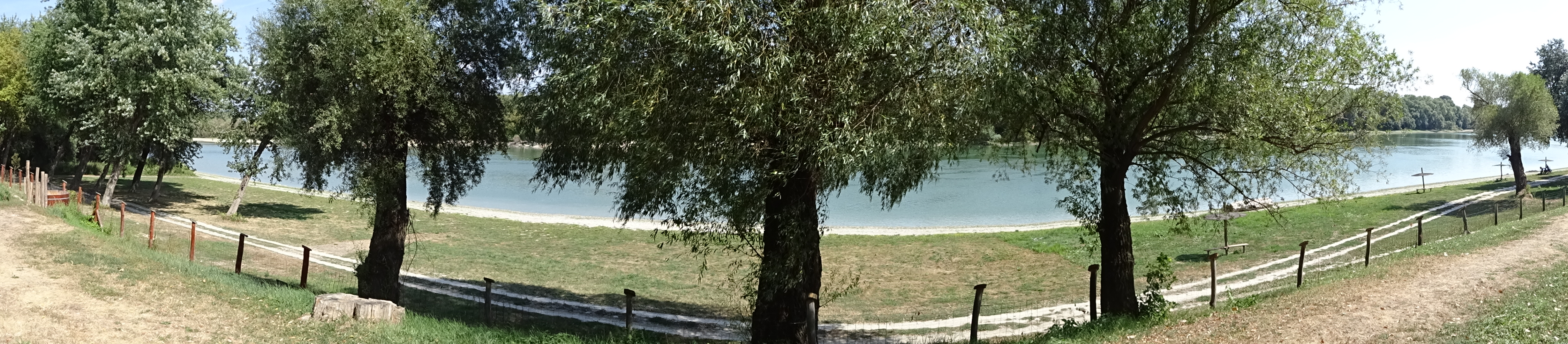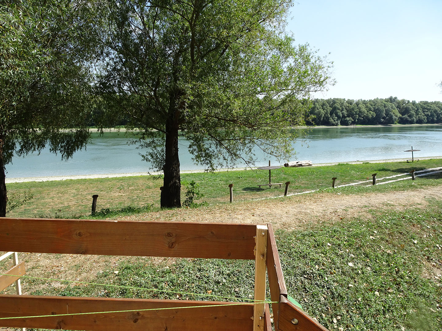 Nach der Nacht in dem einfachen Zimmer mit der Gemeinschaftsdusche und -toilette konnten wir umziehen. Man hatte uns einen Bungalow in Aussicht gestellt, den wir zwei Nächte hätten bewohnen können. Der Wetterbericht hatte für die nächsten mindestens sechs Tage unbeständiges und regnerisches Wetter angekündigt, sodass wir hofften, länger dort bleiben zu können. Beim Erkunden des Campingplatzes hatten wir verschiedene Unterkunftstypen gesehen, u. a. die direkt hinter dem Donaudeich gelegenen Häuser, die auf Pfählen so hoch aufgeständert sind, dass sie auf dem Niveau der Deichkrone liegen und die Bewohner ungehinderten Blick von ihrer Terrasse auf die Donau haben. Auch wenn wir uns nicht vorstellen konnten, dass dies der Typ ist, der für die uns genannten 37 € pro Nacht zu haben ist, träumten wir davon, dort einziehen zu können. Zu unserer Freude und Überraschung erhielten wir den Schlüssel für genau eines dieser Pfahlhäuser. Wir versorgten uns im nahegelegenen Supermarkt mit lokalem Wein, den uns eine Einheimische auf Nachfrage empfohlen hatte, Käse sowie Baguette und gaben uns so versorgt dem berauschenden Blick von unserer Terrasse auf die Donau und das unverbaute gegenüberliegende Flussufer hin.