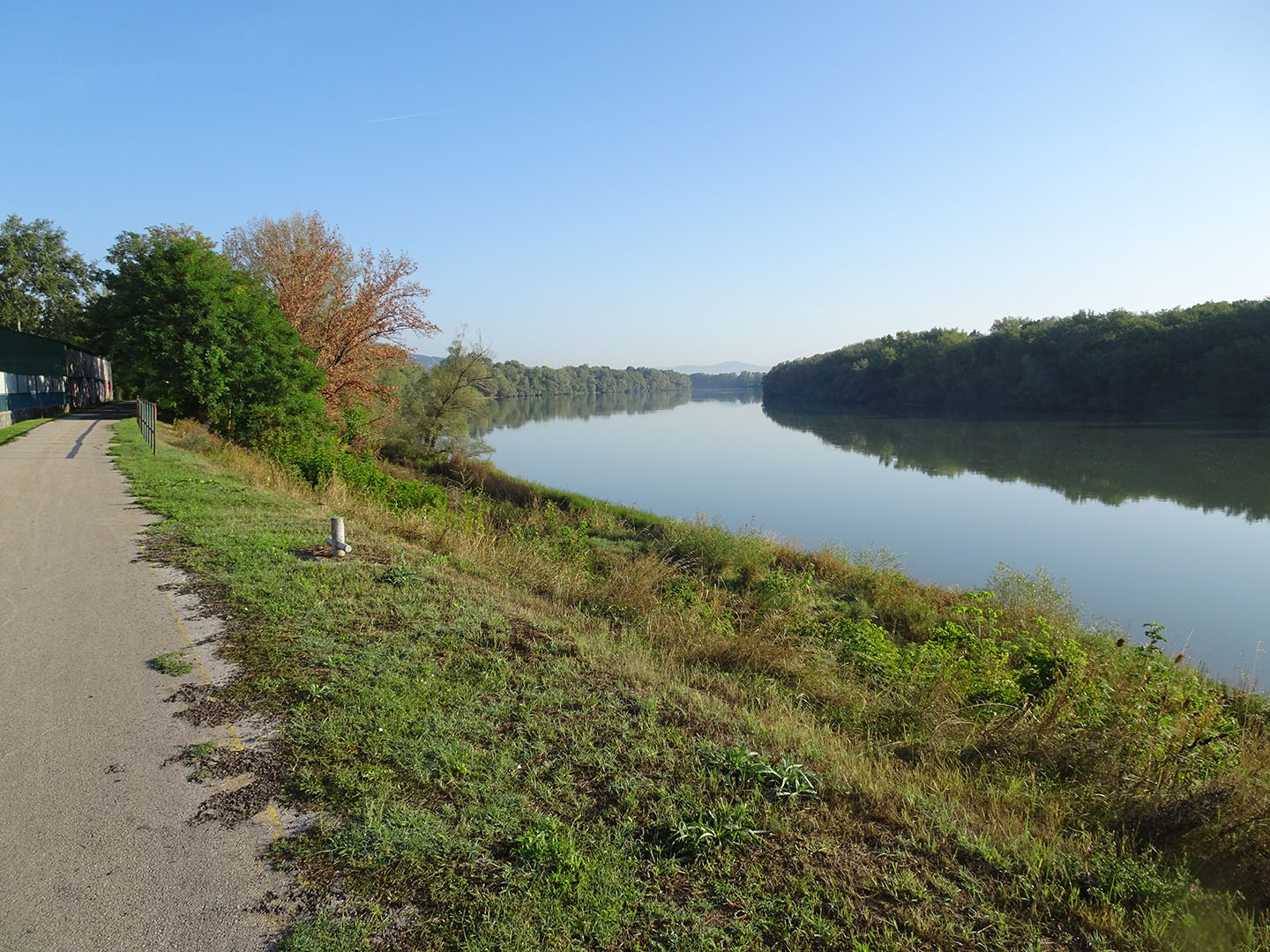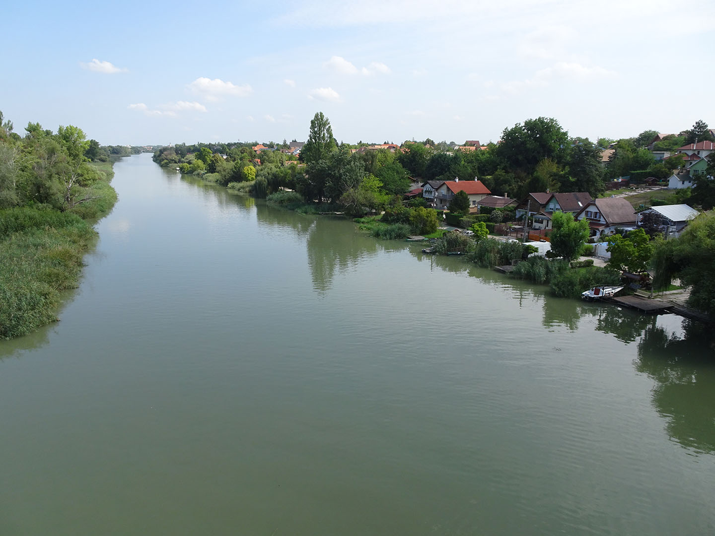 Obwohl wir den Bungalow mit dem schönen Blick auf den Donauarm hatten, wurde es Zeit für die Weiterfahrt, sodass wir den ersten Tag ohne Regenprognose für die Weiterfahrt nutzten. Bis hinter Budapest fuhren wir fast ausschließlich auf guten Radwegen. Dann wurden der Belag des „EuroVelo 6“ schlecht. Wir hatten fast den Eindruck, dass der Weg inzwischen wegen des schlechten Zustands verlegt wurde. Falls dem so ist, hat sich das jedoch weder in den aktuell zum Download angebotenen Tracks noch in der Beschilderung niedergeschlagen. Teilweise konnten wir wegen der vielen durch Baumwurzeln verursachten Schäden nur sehr langsam fahren, teils fuhren wir auf unbefestigten Wegen in schmalen Rinnen oder in Spuren, die Traktoren in den Feldern hinterlassen hatten. Den Einheimischen scheint der Zustand bekannt zu sein, denn uns begegneten auf diesen Streckenabschnitten keine Radfahrer. Das Ufer der Donauarme ist größtenteils mit kleinen Häusern bebaut, die direkten Zugang zur Donau haben. Dadurch war uns oft der Blick auf die Donau versperrt.