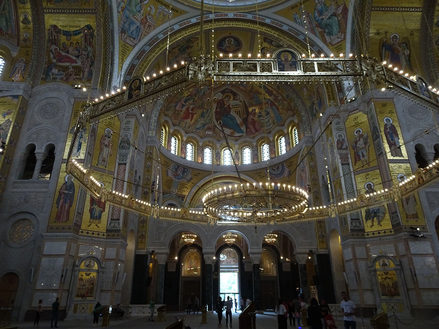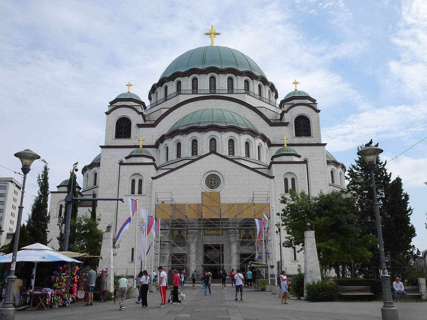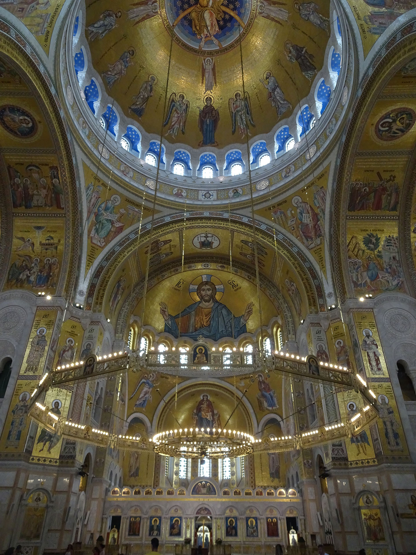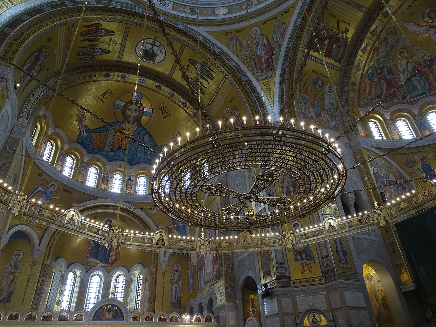 Nach zwei Ruhetagen, an denen es zeitweise geregnet hatte und wir Wäsche gewaschen und die Ketten unserer Räder geölt hatten, fuhren wir gestern mit dem Bus in die serbische Hauptstadt Belgrad. Die Verbindungen aus der kleinen Stadt Pančevo sind gut und in ca. 25 Minuten erreichten wir den zentralen Busbahnhof in Belgrad. Wir besichtigten den Dom des Heiligen Sava und die Festung. Den Dom erreichten wir zu Fuß. Zurzeit finden keine Gottesdienste statt, da im Innenraum noch gearbeitet wird. Mit dem Bau wurde 1935 begonnen und er wurde erst 2017 beendet. Die Oberfläche des Innenraums mit der zentralen großen und mehreren kleinen Kuppeln ist beinahe flächendeckend mit Mosaiken versehen, deren nicht figürliche Anteile überwiegend in goldener Farbe gehalten sind. Es sollen ca. 5 Millionen Mosaiksteine, teilweise aus Halbedelsteinen und Muranoglas, verwendet worden sein. Andere Wandanteile sind mit interessant gemusterten Marmorplatten verkleidet, sodass der Dom einen sehr prachtvollen Eindruck macht. Das Beeindruckende ist seine Größe. Es soll eines der größten orthodoxen Bauwerke der Welt sein.
