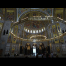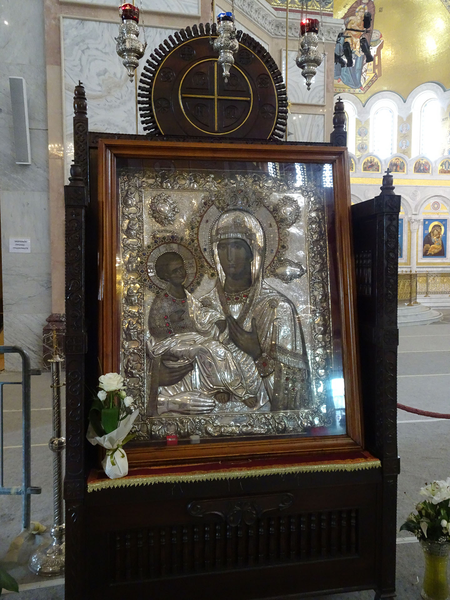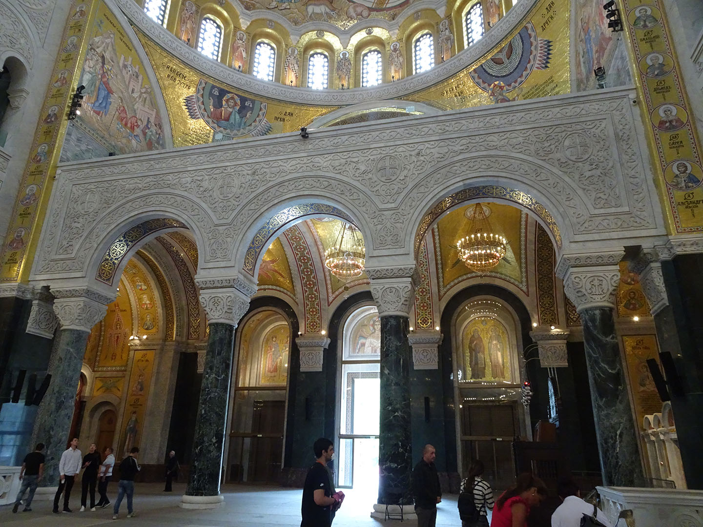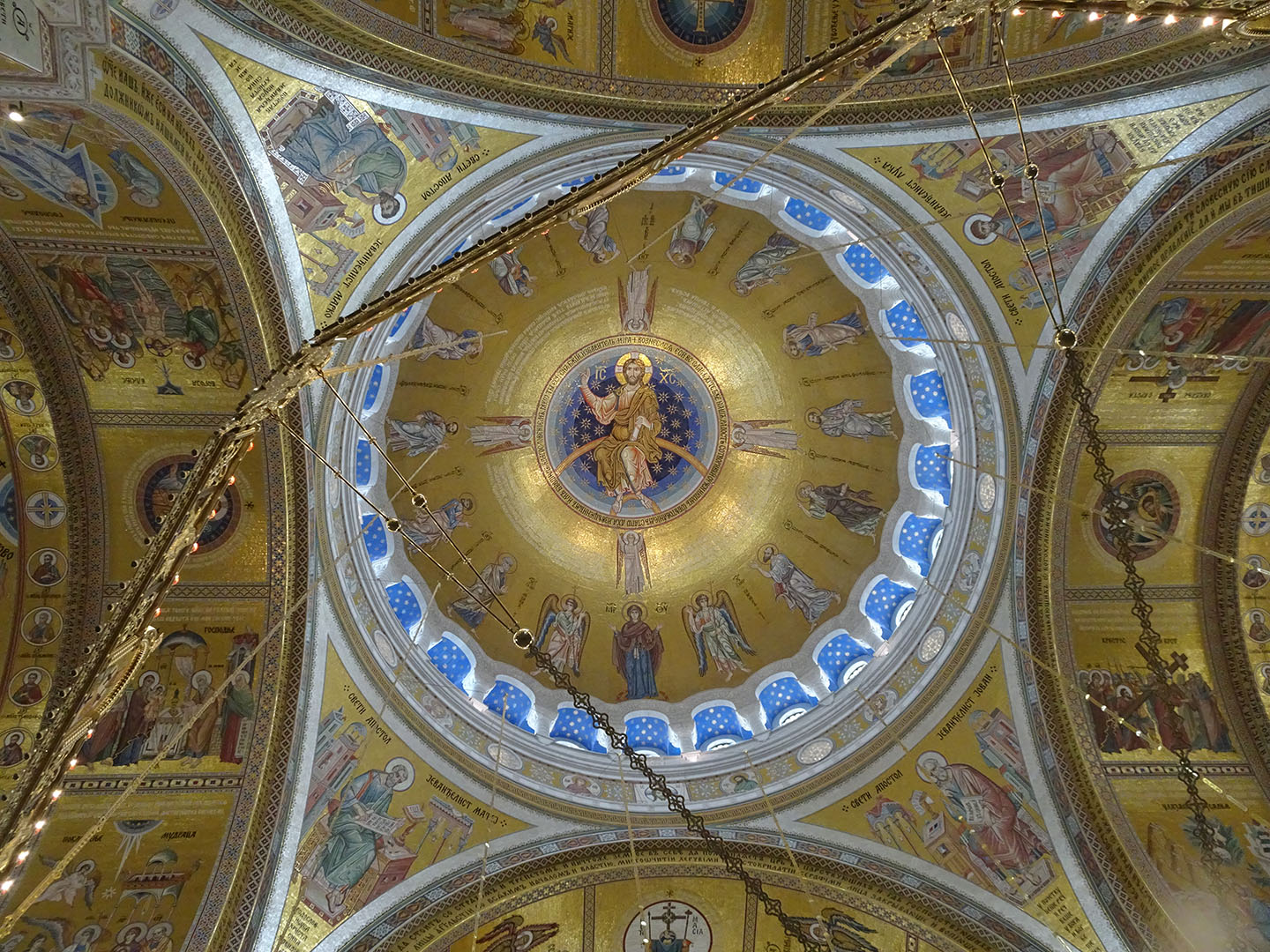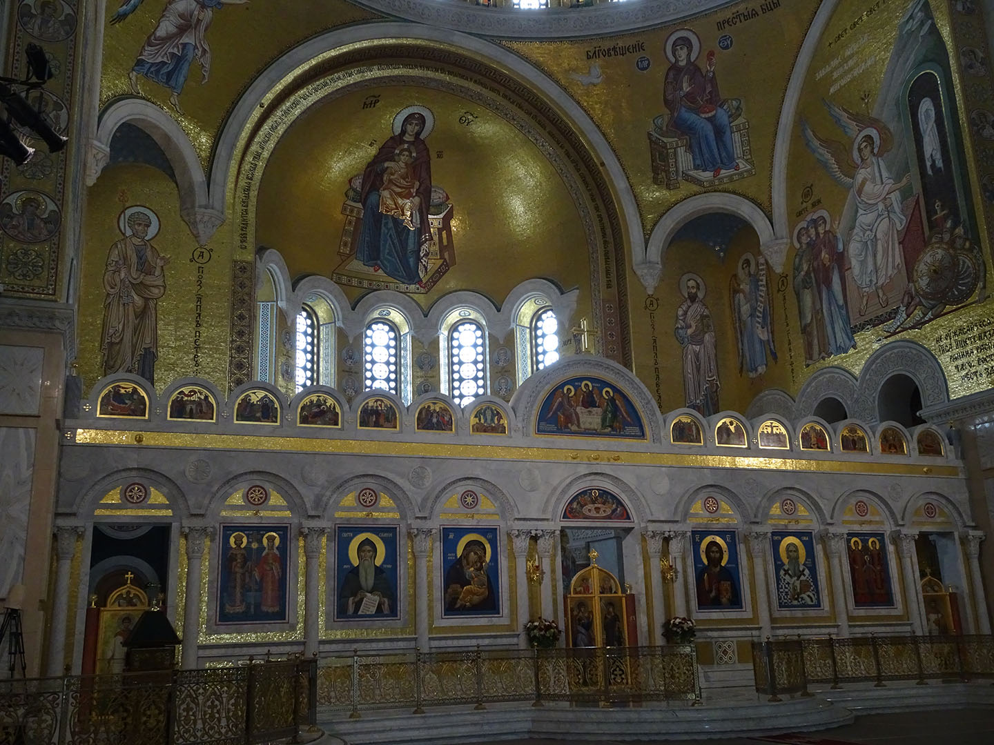 Nach zwei Ruhetagen, an denen es zeitweise geregnet hatte und wir Wäsche gewaschen und die Ketten unserer Räder geölt hatten, fuhren wir gestern mit dem Bus in die serbische Hauptstadt Belgrad. Die Verbindungen aus der kleinen Stadt Pančevo sind gut und in ca. 25 Minuten erreichten wir den zentralen Busbahnhof in Belgrad. Wir besichtigten den Dom des Heiligen Sava und die Festung. Den Dom erreichten wir zu Fuß. Zurzeit finden keine Gottesdienste statt, da im Innenraum noch gearbeitet wird. Mit dem Bau wurde 1935 begonnen und er wurde erst 2017 beendet. Die Oberfläche des Innenraums mit der zentralen großen und mehreren kleinen Kuppeln ist beinahe flächendeckend mit Mosaiken versehen, deren nicht figürliche Anteile überwiegend in goldener Farbe gehalten sind. Es sollen ca. 5 Millionen Mosaiksteine, teilweise aus Halbedelsteinen und Muranoglas, verwendet worden sein. Andere Wandanteile sind mit interessant gemusterten Marmorplatten verkleidet, sodass der Dom einen sehr prachtvollen Eindruck macht. Das Beeindruckende ist seine Größe. Es soll eines der größten orthodoxen Bauwerke der Welt sein.