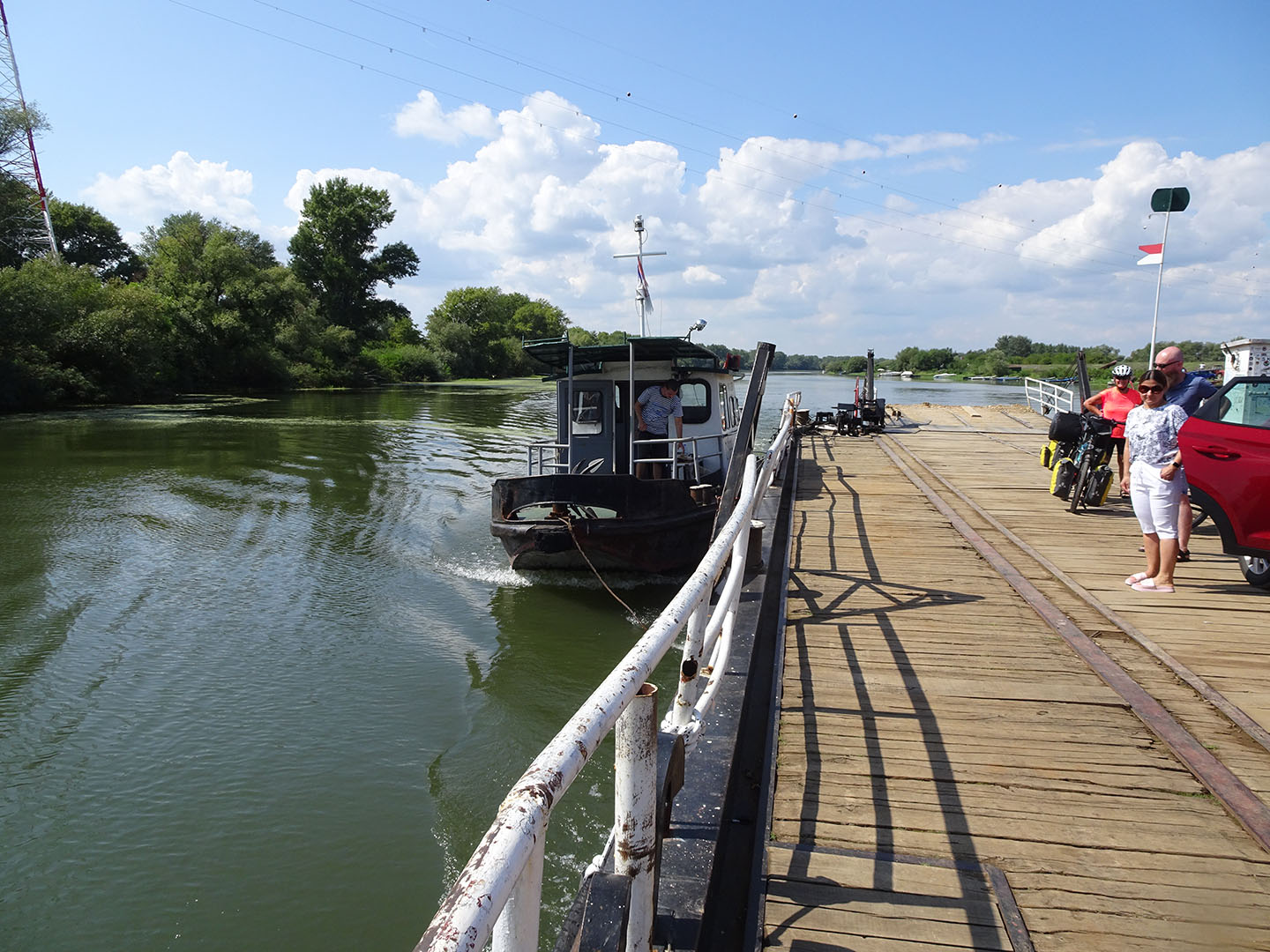 Der Fluss ist hier sehr breit und der Anleger am anderen Ufer nicht direkt gegenüber. So dauerte die Überfahrt etwa 20 Minuten. Am anderen Ufer erwartete uns ein steiler Anstieg, den Dagmar nur schiebend bewältigen konnte. Die Anhöhe gewährte uns einen schönen Ausblick auf die Donau und das Umland. Wir kamen nach etwa 20 weiteren Kilometern auf dem Deich bei unserer vorgebuchten Unterkunft an. Das hübsche kleine Ferienhaus liegt direkt am Fluss und von der kleinen Terrasse blickt man auf die rumänische Hügelkette am anderen Ufer. Wir genossen bei schönstem Wetter unseren Ruhetag und werden morgen voraussichtlich Serbien verlassen und auf der anderen Donauseite in Rumänien weiterfahren.