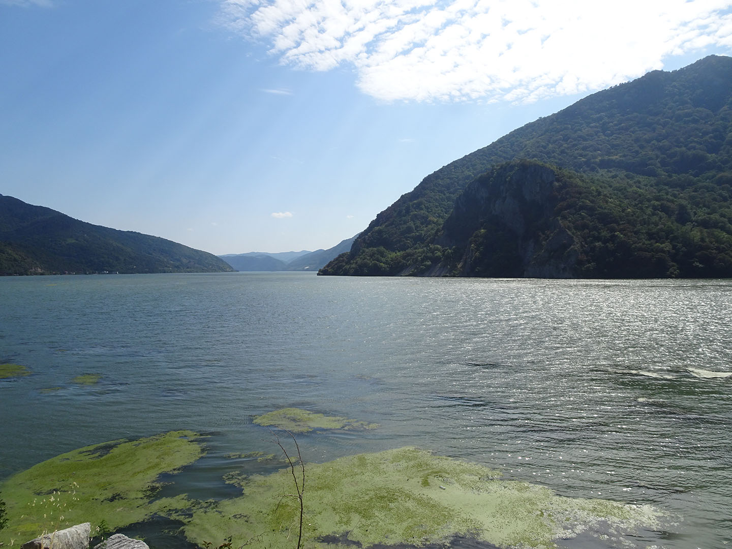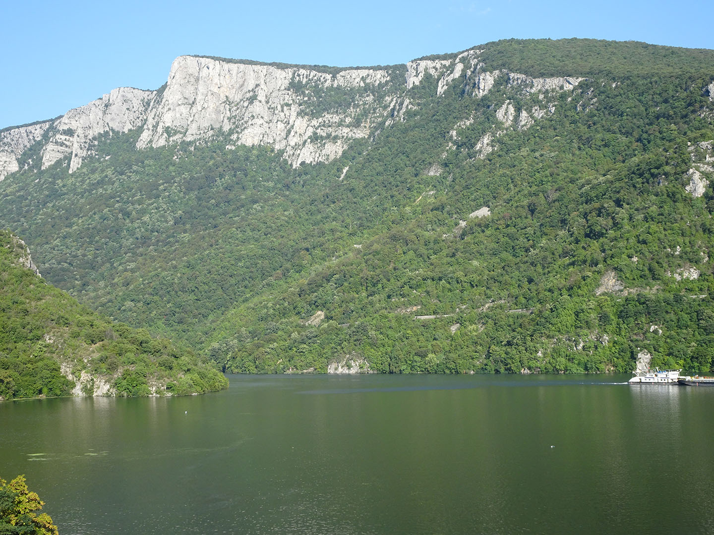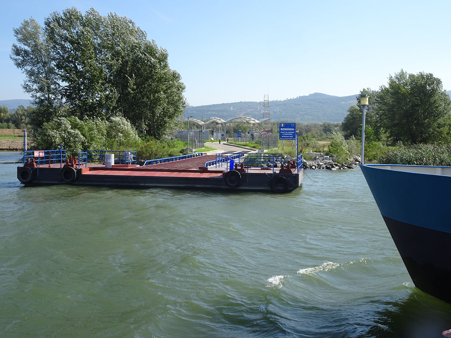 Die Fahrt von unsere Unterkunft donauabwärts hätte sich entweder rechts oder – nach der Querung des Flusses mit einer Fähre – links der Donau fortsetzen lassen. Auf dem Abschnitt bis zur nächsten Brücke über die Donau wären jedoch auf der serbischen Seite etwa 700 Höhenmeter mehr zu bewältigen gewesen. Daher lohnte es, sich die Option mit der Fähre etwas genauer anzusehen. Die einschlägigen Informationskanäle, rome2rio und Google Maps, kannten die Fähre überhaupt nicht. Nur auf mapy war die Fährverbindung eingezeichnet. In einem im Internet gefundenen Artikel einer in Rumänien erscheinenden deutschsprachigen Zeitung wurde berichtet, dass die Verbindung in diesem Jahr nach langer Pause wieder aufgenommen wurde. Ein Fahrplan oder wenigstens der Hinweis, dass die Fähre auch derzeit noch verkehrt, war jedoch nicht zu finden. Also machte sich Diez gestern auf den Weg zum gut 15 km entfernten Fähranleger um Genaueres zu erfahren. Von den Grenzbeamten hörte er, dass die Fähre täglich dreimal nach Rumänien übersetzt. Heute fuhren wir mit einem großzügig bemessenen Zeitpolster los, um die Fähre um 9:15 Uhr (serbische Zeit) selbst bei einem kleineren technischen Problem noch erreichen zu können, da wir andernfalls bis zum Nachmittag auf die nächste Überfahrtmöglichkeit hätten warten müssen. Es war noch kühl und uns wehte ein kräftiger Ostwind entgegen, der erst am Nachmittag etwas abflaute. Außer uns wurde lediglich ein Fahrer und sein Auto auf der Fähre transportiert. Die Formalitäten beschränkten sich auf die Ausweiskontrolle. Jetzt sind wir wieder in der EU. Vom rumänischen Anleger, den die Fähre nach ca. 30 Minuten erreichte, fuhren wir auf einer guten Straße. Nach einigen Kilometern begannen die ersten sanften Hügel der Karpaten und die Straße verläuft dann direkt zwischen der Donau, die hier Danuba heißt, und den Bergen parallel zum Fluss. Es zeigte sich, dass wir mit der linken Donauseite die richtige Wahl getroffen hatten. Auf der anderen Flussseite mussten für die Straße zahlreiche Tunnel und Brücken gebaut werden und üblicherweise wird in solchen Fällen die Straße aus Kostengründen so schmal wie möglich gebaut. Demgegenüber gibt es auf dem von uns befahrenen Abschnitt keine Tunnel und wenige Brücken. Die Straße ist so breit, dass wir selbst bei sich auf unserer Höhe begegnenden Autos nicht in Bedrängnis kamen. Zudem herrschte nur sehr geringer Verkehr.