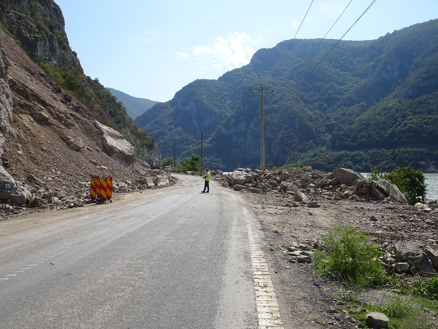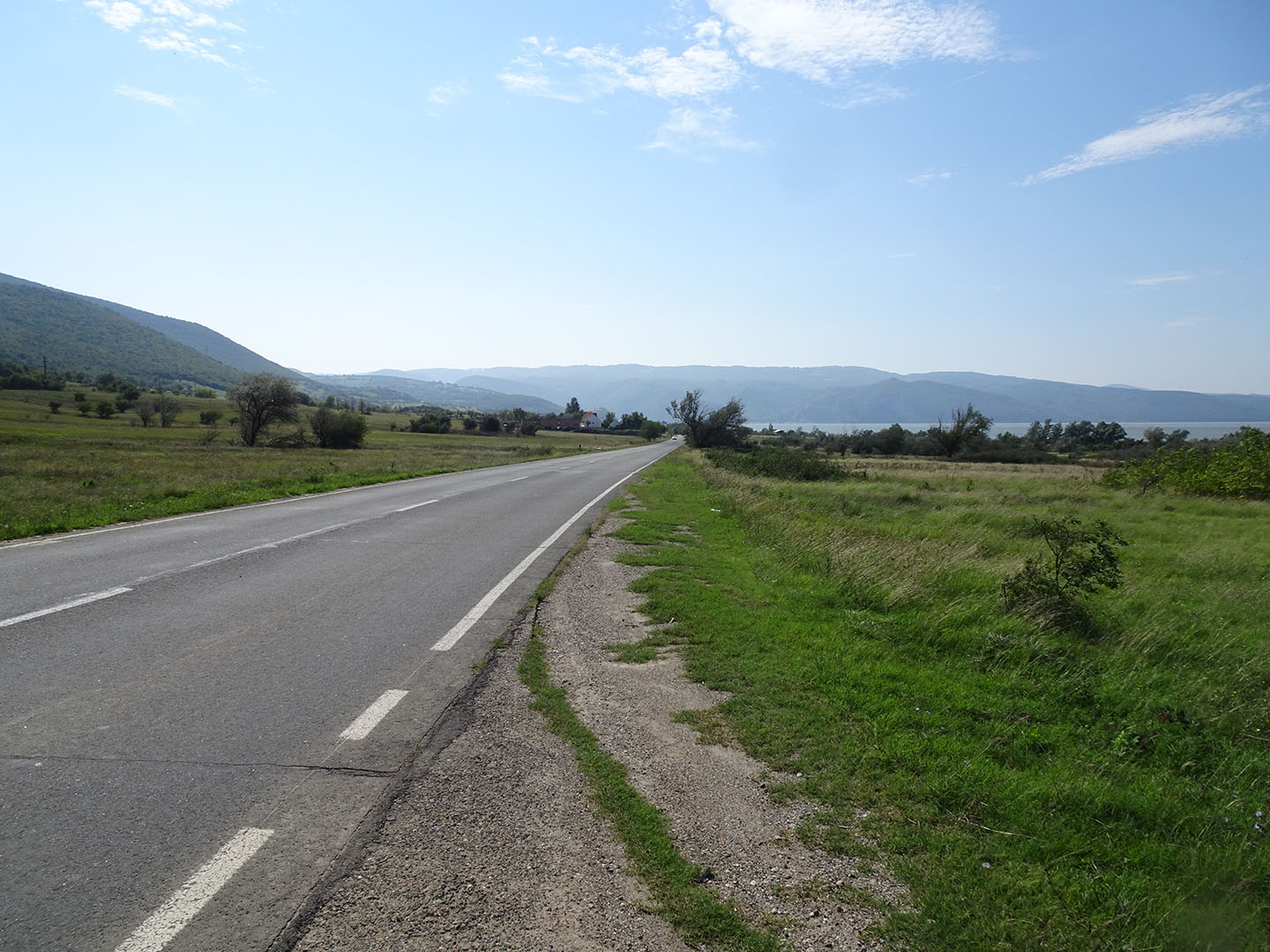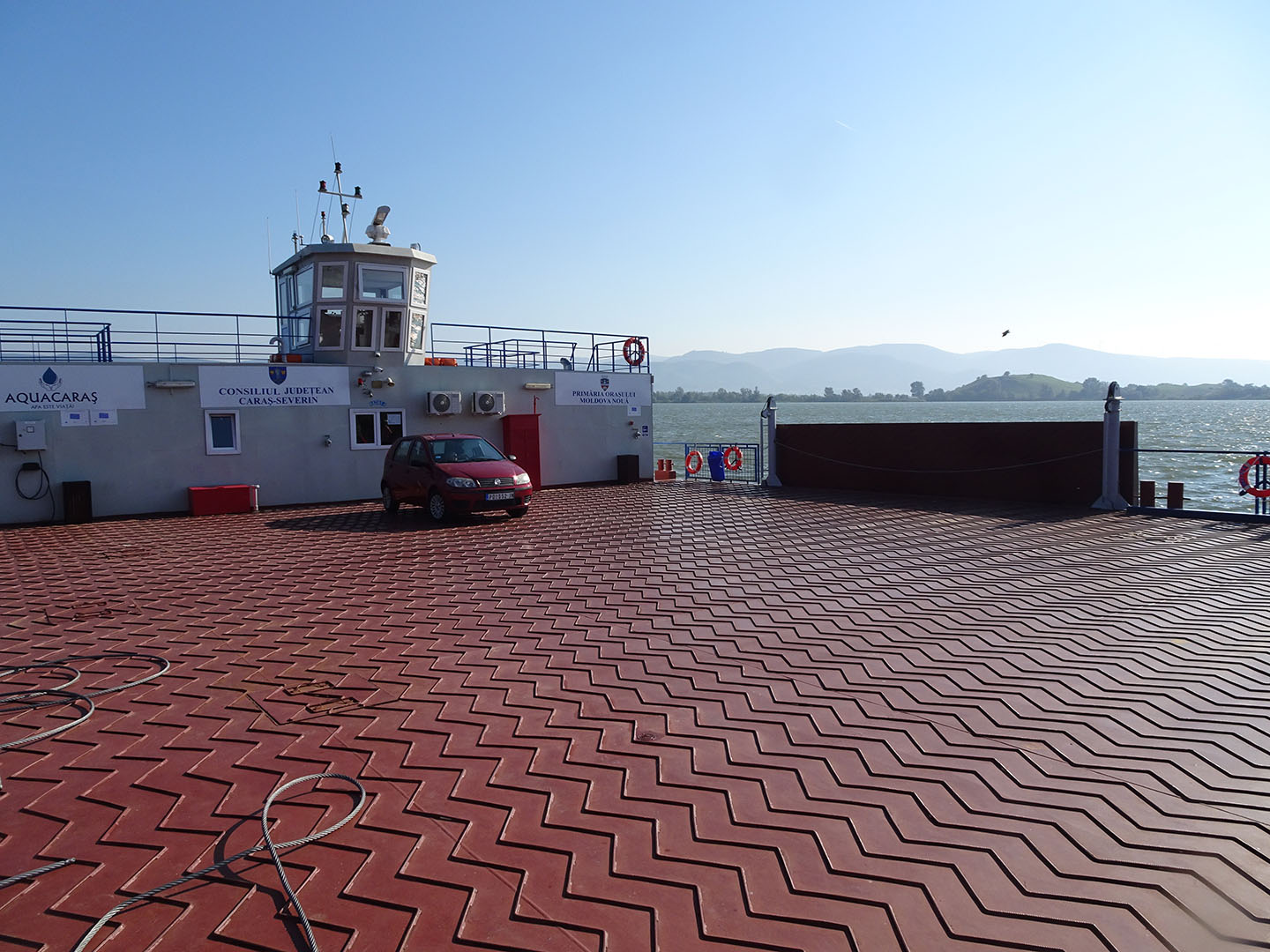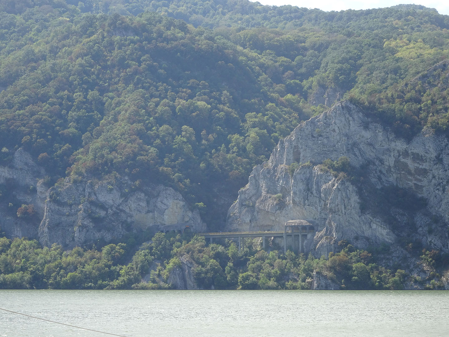 Die Fahrt von unsere Unterkunft donauabwärts hätte sich entweder rechts oder – nach der Querung des Flusses mit einer Fähre – links der Donau fortsetzen lassen. Auf dem Abschnitt bis zur nächsten Brücke über die Donau wären jedoch auf der serbischen Seite etwa 700 Höhenmeter mehr zu bewältigen gewesen. Daher lohnte es, sich die Option mit der Fähre etwas genauer anzusehen. Die einschlägigen Informationskanäle, rome2rio und Google Maps, kannten die Fähre überhaupt nicht. Nur auf mapy war die Fährverbindung eingezeichnet. In einem im Internet gefundenen Artikel einer in Rumänien erscheinenden deutschsprachigen Zeitung wurde berichtet, dass die Verbindung in diesem Jahr nach langer Pause wieder aufgenommen wurde. Ein Fahrplan oder wenigstens der Hinweis, dass die Fähre auch derzeit noch verkehrt, war jedoch nicht zu finden. Also machte sich Diez gestern auf den Weg zum gut 15 km entfernten Fähranleger um Genaueres zu erfahren. Von den Grenzbeamten hörte er, dass die Fähre täglich dreimal nach Rumänien übersetzt. Heute fuhren wir mit einem großzügig bemessenen Zeitpolster los, um die Fähre um 9:15 Uhr (serbische Zeit) selbst bei einem kleineren technischen Problem noch erreichen zu können, da wir andernfalls bis zum Nachmittag auf die nächste Überfahrtmöglichkeit hätten warten müssen. Es war noch kühl und uns wehte ein kräftiger Ostwind entgegen, der erst am Nachmittag etwas abflaute. Außer uns wurde lediglich ein Fahrer und sein Auto auf der Fähre transportiert. Die Formalitäten beschränkten sich auf die Ausweiskontrolle. Jetzt sind wir wieder in der EU. Vom rumänischen Anleger, den die Fähre nach ca. 30 Minuten erreichte, fuhren wir auf einer guten Straße. Nach einigen Kilometern begannen die ersten sanften Hügel der Karpaten und die Straße verläuft dann direkt zwischen der Donau, die hier Danuba heißt, und den Bergen parallel zum Fluss. Es zeigte sich, dass wir mit der linken Donauseite die richtige Wahl getroffen hatten. Auf der anderen Flussseite mussten für die Straße zahlreiche Tunnel und Brücken gebaut werden und üblicherweise wird in solchen Fällen die Straße aus Kostengründen so schmal wie möglich gebaut. Demgegenüber gibt es auf dem von uns befahrenen Abschnitt keine Tunnel und wenige Brücken. Die Straße ist so breit, dass wir selbst bei sich auf unserer Höhe begegnenden Autos nicht in Bedrängnis kamen. Zudem herrschte nur sehr geringer Verkehr.