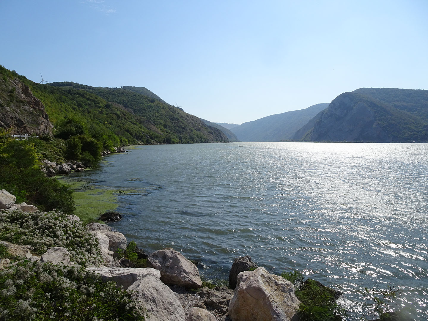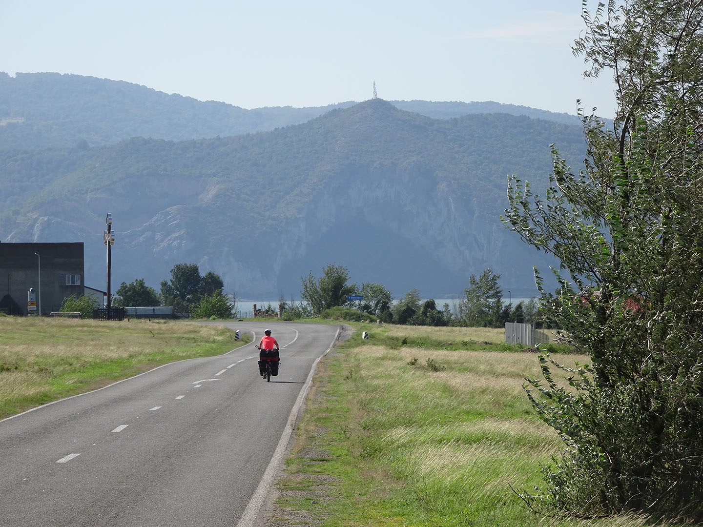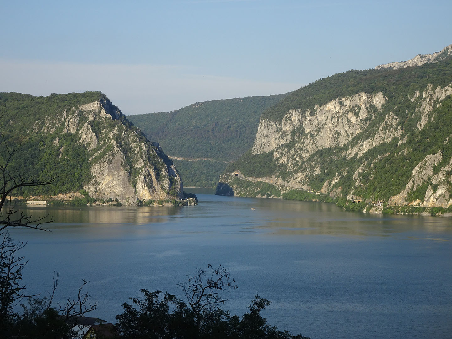 Immer hielten wir an, damit wir von dieser außergewöhnlichen Landschaft Fotos machen konnten. Mal wieder wurde uns bewusst, wie privilegiert wir sind, solche Orte mit dem Fahrrad bereisen zu können. Nach gut 90 km löst sich die Straße von der Donau, die hier ein felsiges Steilufer hat, und überquert weiter landeinwärts in einem sich über 4 km hinziehenden Anstieg einen Sattel, um auf der anderen Seite den Blick auf unseren Zielort freizugeben. Mit der Zeitverschiebung von einer Stunde in Rumänien kamen wir erst gegen 18:00 Uhr im traumhaft vor dem sogenannten Eisernen Tor gelegenen Dubova an. Das Eiserne Tor ist eine extreme Verengung des Flussbettes der Donau. Von der beinahe seeartigen Breite des Flusses verengt sie sich hier zwischen steilen Berghängen auf nur 200 m.