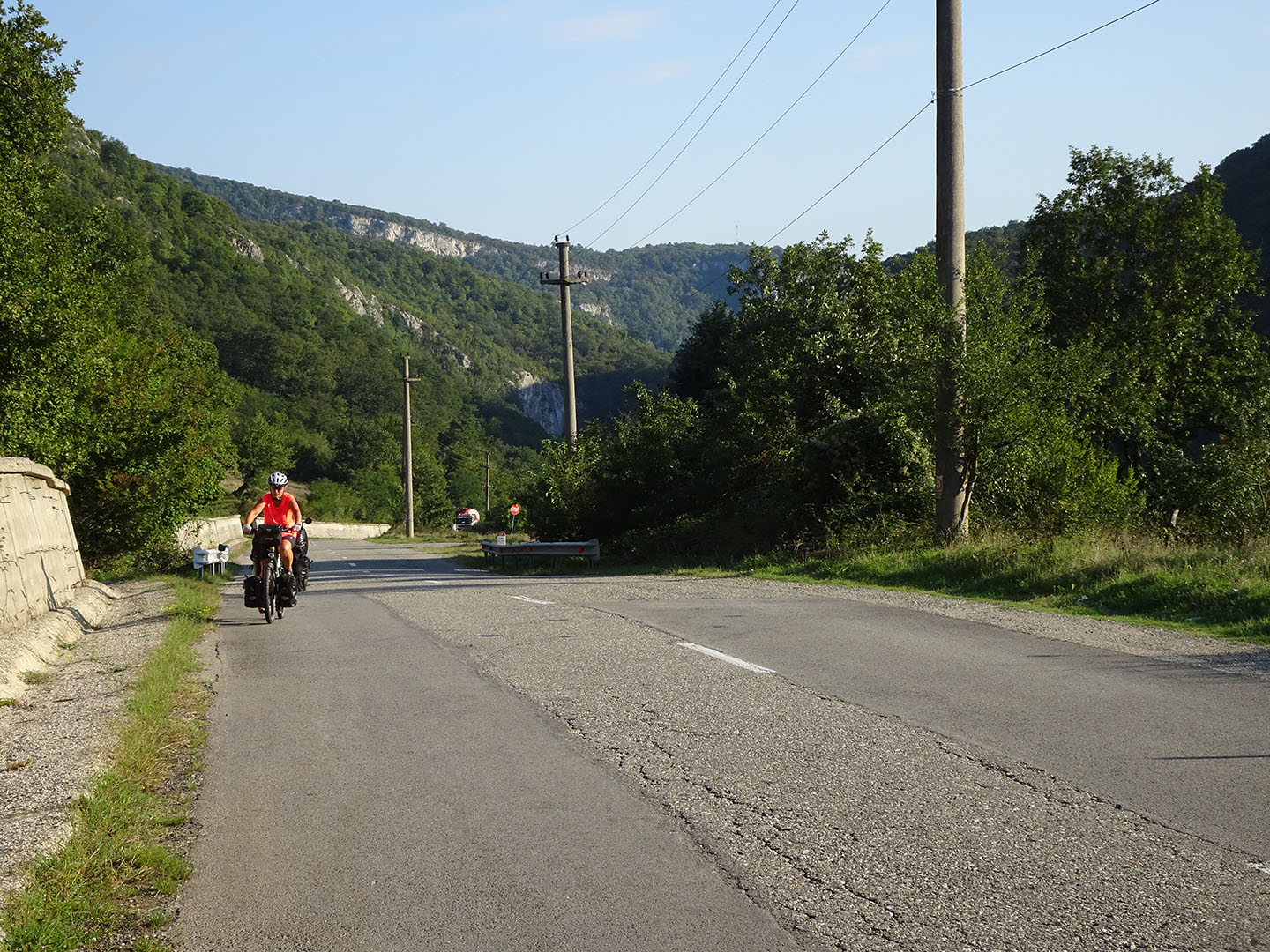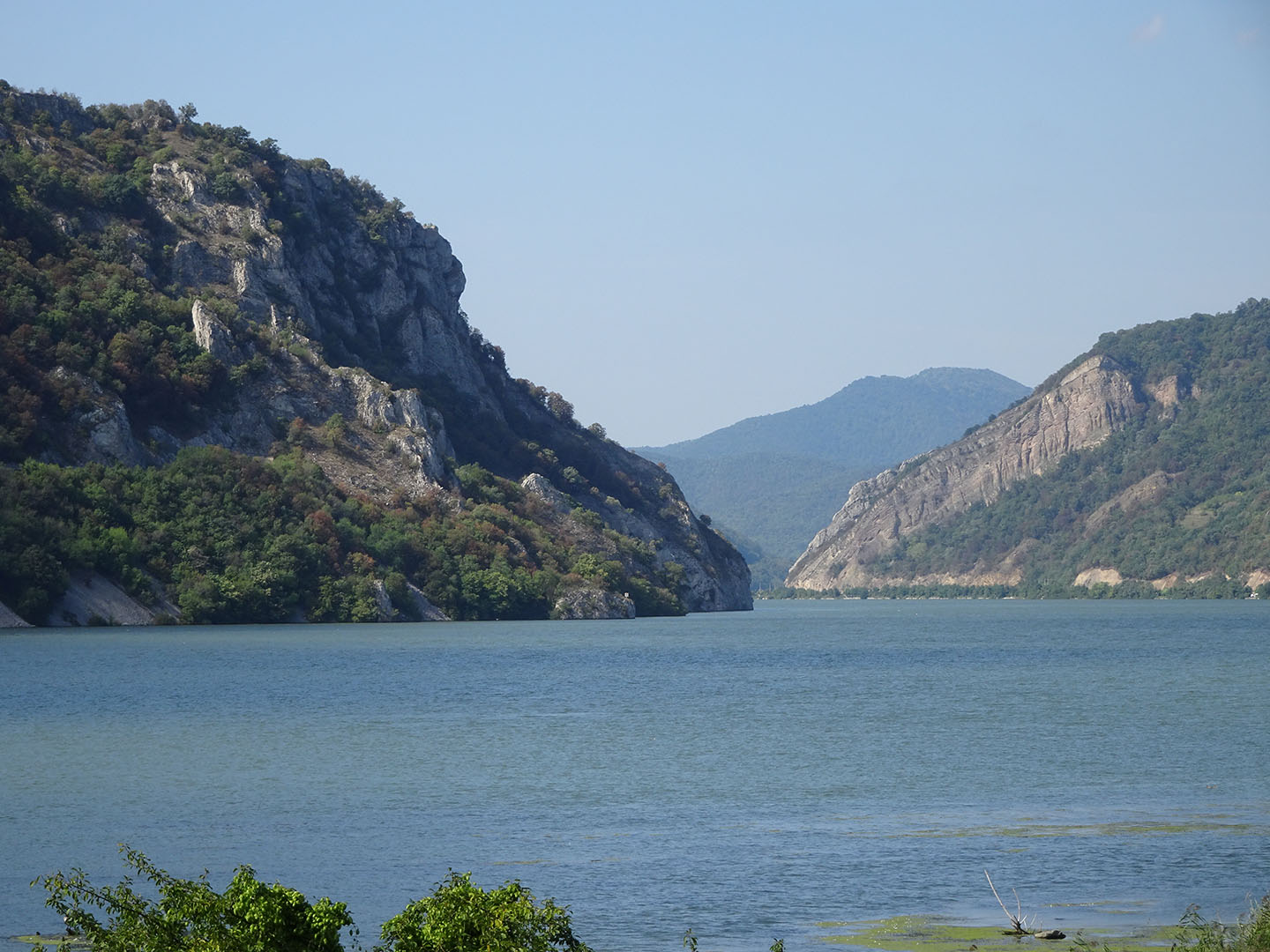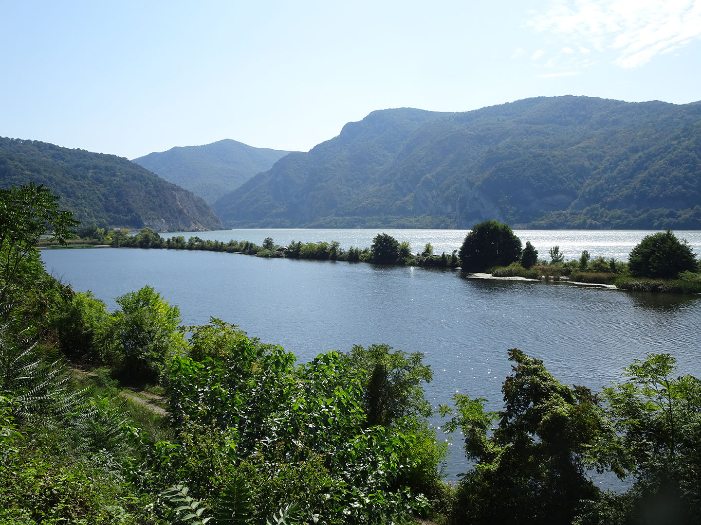 Immer hielten wir an, damit wir von dieser außergewöhnlichen Landschaft Fotos machen konnten. Mal wieder wurde uns bewusst, wie privilegiert wir sind, solche Orte mit dem Fahrrad bereisen zu können. Nach gut 90 km löst sich die Straße von der Donau, die hier ein felsiges Steilufer hat, und überquert weiter landeinwärts in einem sich über 4 km hinziehenden Anstieg einen Sattel, um auf der anderen Seite den Blick auf unseren Zielort freizugeben. Mit der Zeitverschiebung von einer Stunde in Rumänien kamen wir erst gegen 18:00 Uhr im traumhaft vor dem sogenannten Eisernen Tor gelegenen Dubova an. Das Eiserne Tor ist eine extreme Verengung des Flussbettes der Donau. Von der beinahe seeartigen Breite des Flusses verengt sie sich hier zwischen steilen Berghängen auf nur 200 m.