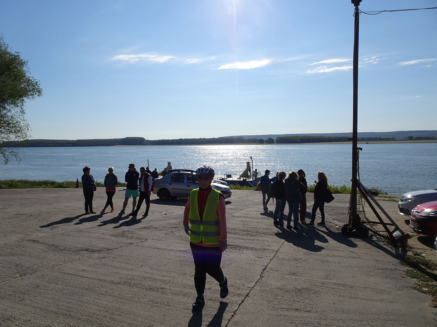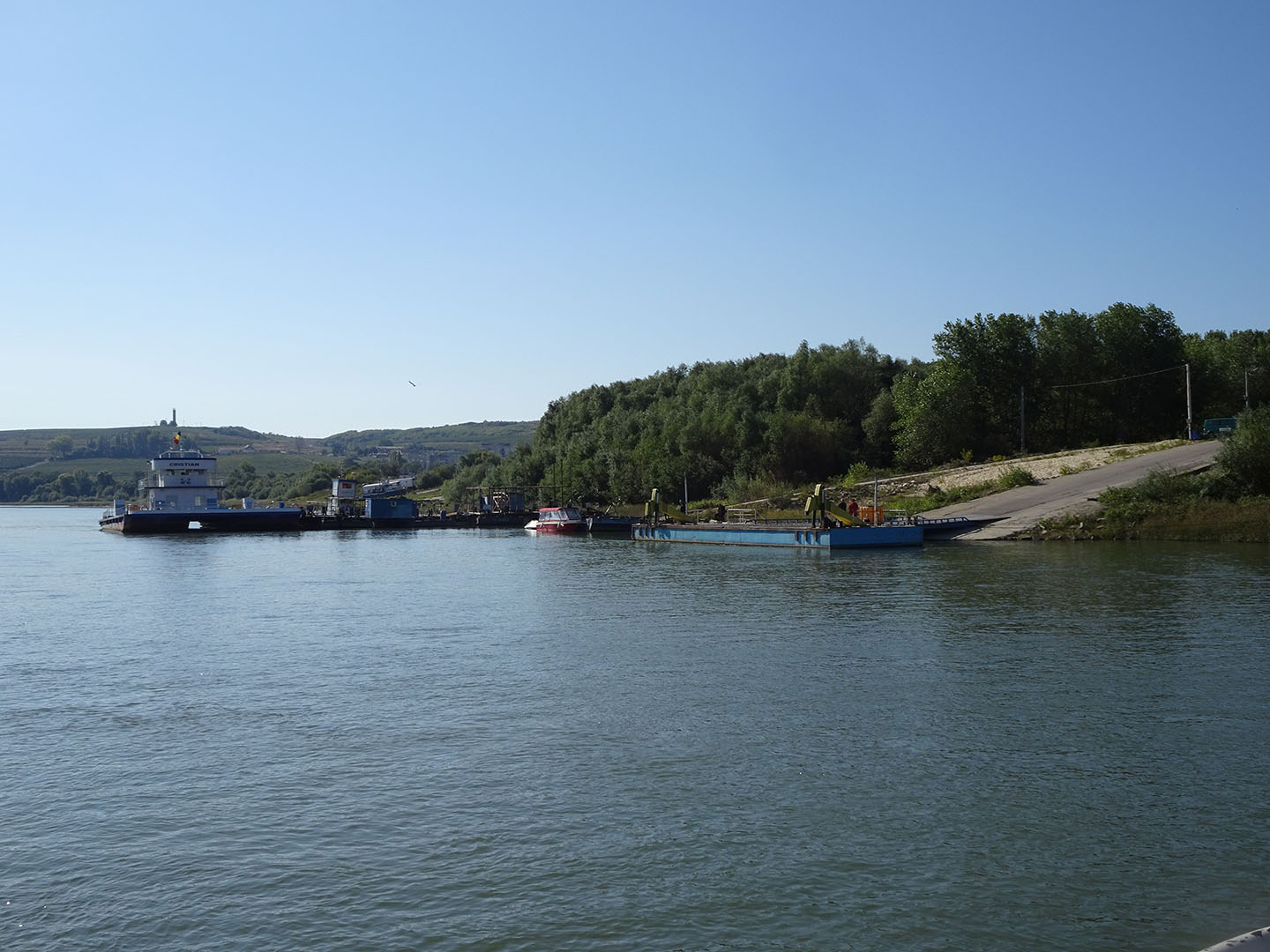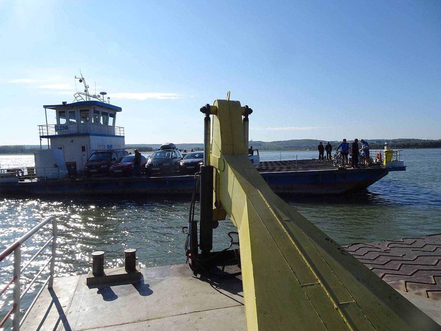 Trotz intensiver Internetrecherche war im Vorfeld weder herauszufinden, welche der drei in den elektronischen Karten verzeichneten Fährverbindungen aktuell betrieben wird, wo die Fähren auf der anderen Seite anlegen, auf welche Verbindung sich die teils vernichtenden Kommentare beziehen und erst recht nicht, wann sie fahren. Wir wählten den Anleger, der uns von mapy.cz vorgeschlagen wurde, fuhren an den bereits wartenden Autos zur Spitze der Schlange und waren mit einer Gruppe rumänischer Rennradfahrer die ersten, die sich nach dem letzten entladenen Auto auf der Fähre einen Platz suchten. Sowohl für Fußgänger als auch für Fahrräder ist die etwa 15-minütige Überfaht kostenlos.