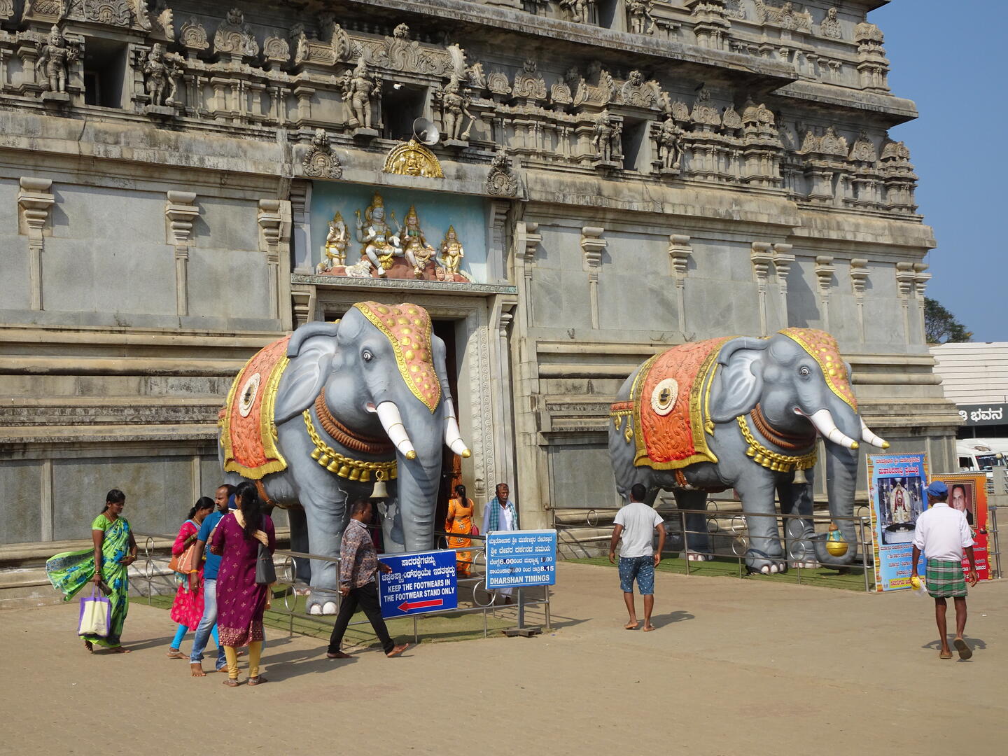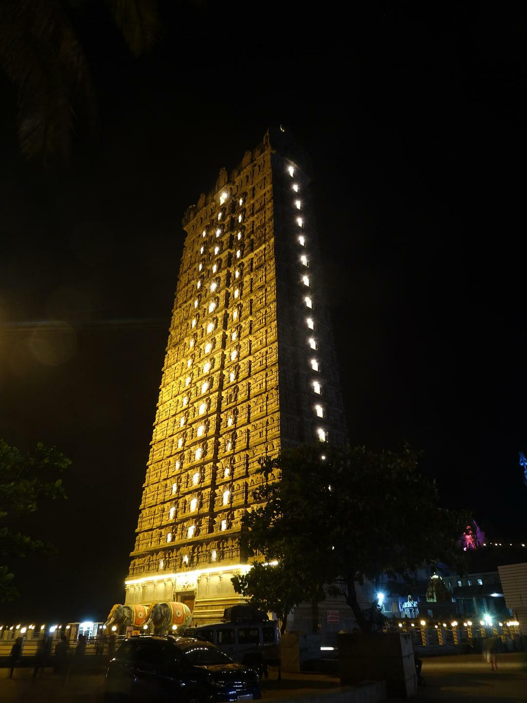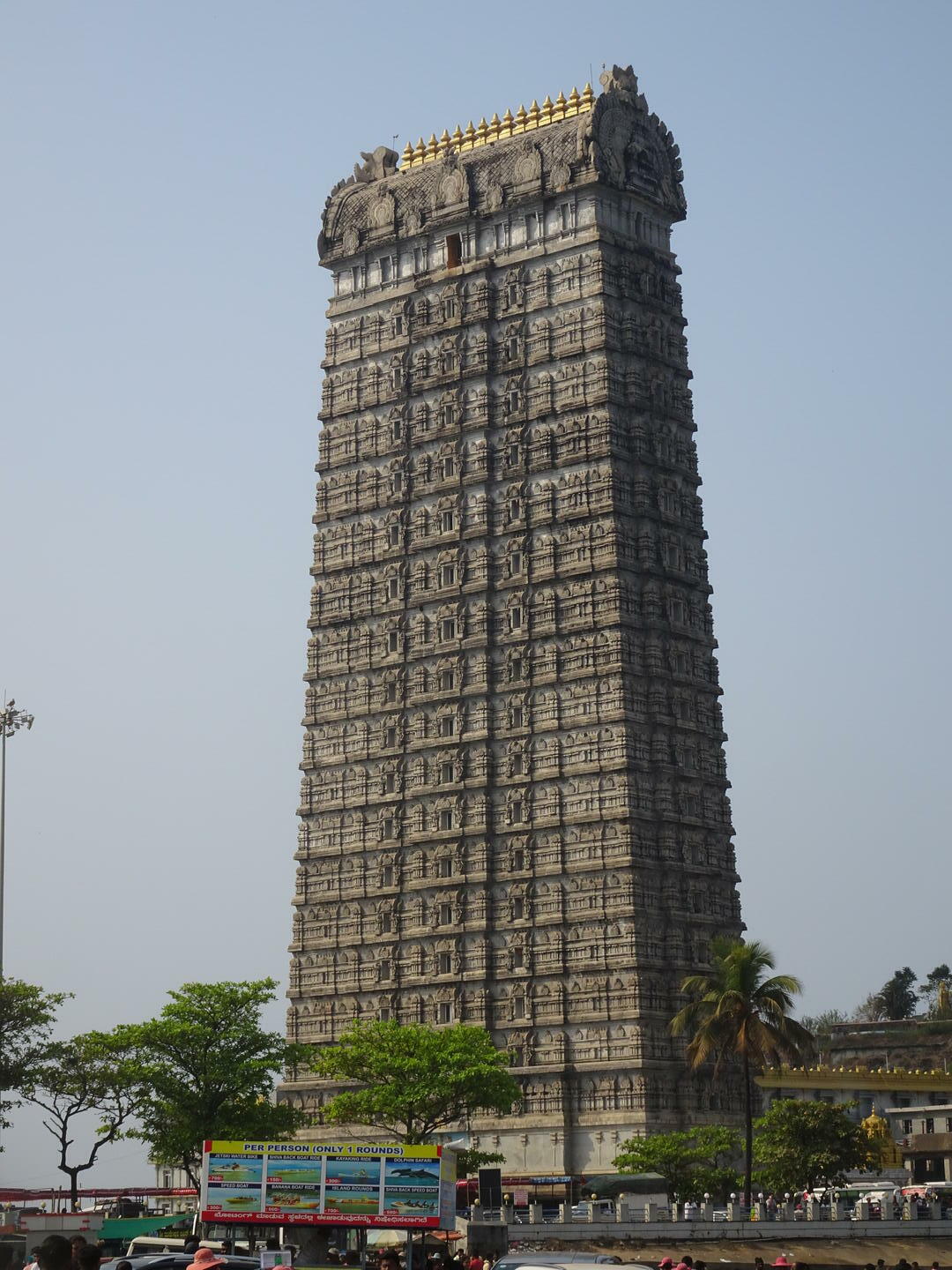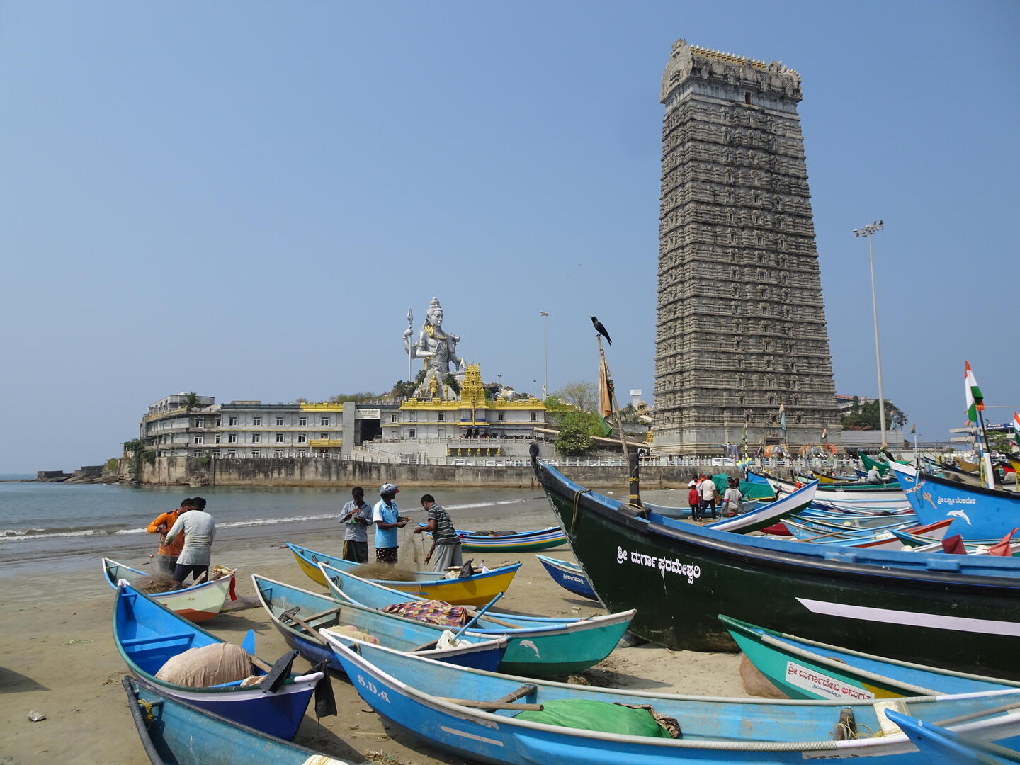 Nach dem Besuch der ca. 37 m hohen Shiva-Statue sowie des im Sockel der Statue angelegten Umgangs mit der Darstellung der Begebenheiten, die diesen Ort zu einem für Hindus heiligen machen, wollten wir den Gopuram besteigen. Noch vor fünf Jahren war dies nur über Treppen möglich und gefühlt 95 % der Inder gaben den Versuch bereits nach spätestens der dritten Etage keuchend auf. Aufgrund dieser Erfahrungen hat man jetzt wohl einen Aufzug installiert; mit der Folge, dass wir die Gopuramspitze diesmal mit anderen Besuchern teilen mussten. Der im Anschluss besuchte, in Teilen vergoldete alte Murdeshwar-Tempel hat wie alle hinduistischen Tempel diese besondere Atmosphäre, die die Gläubigen an die Anwesenheit der verehrten Gottheit glauben lässt.