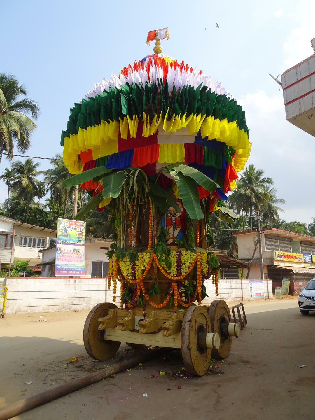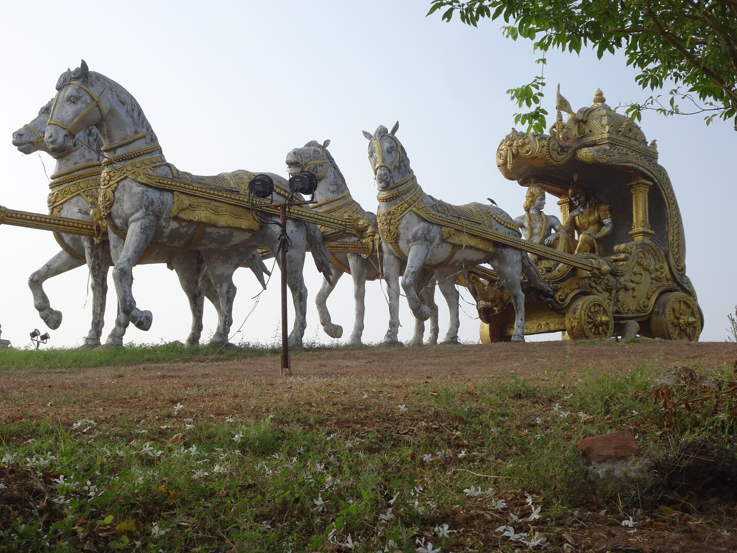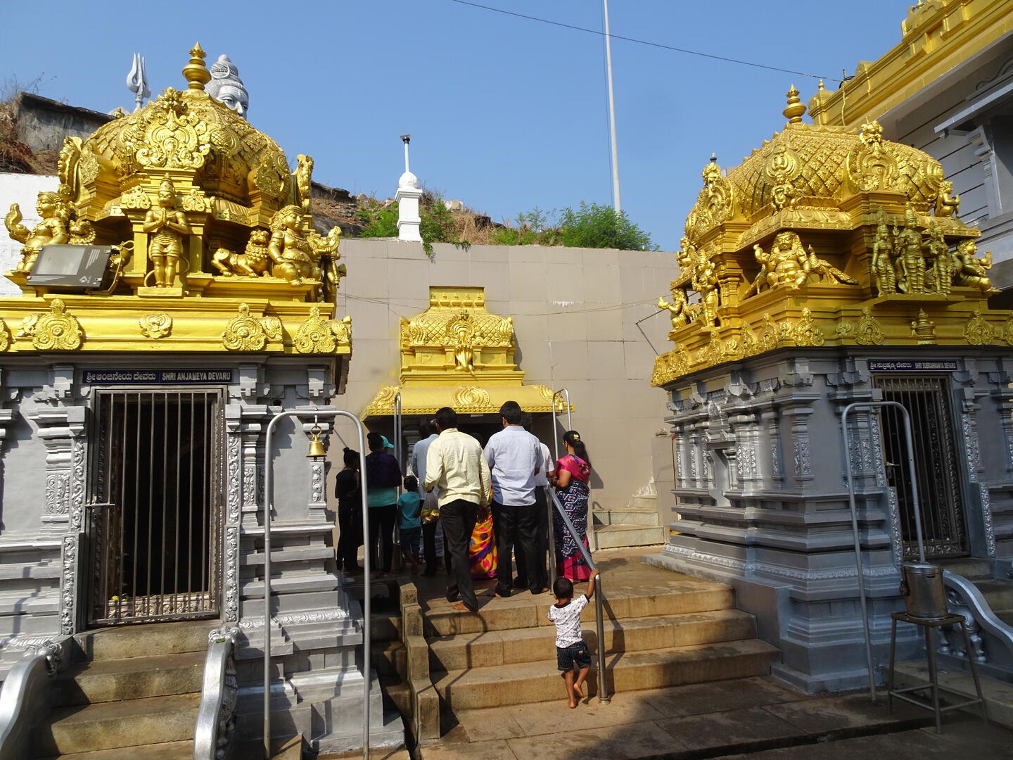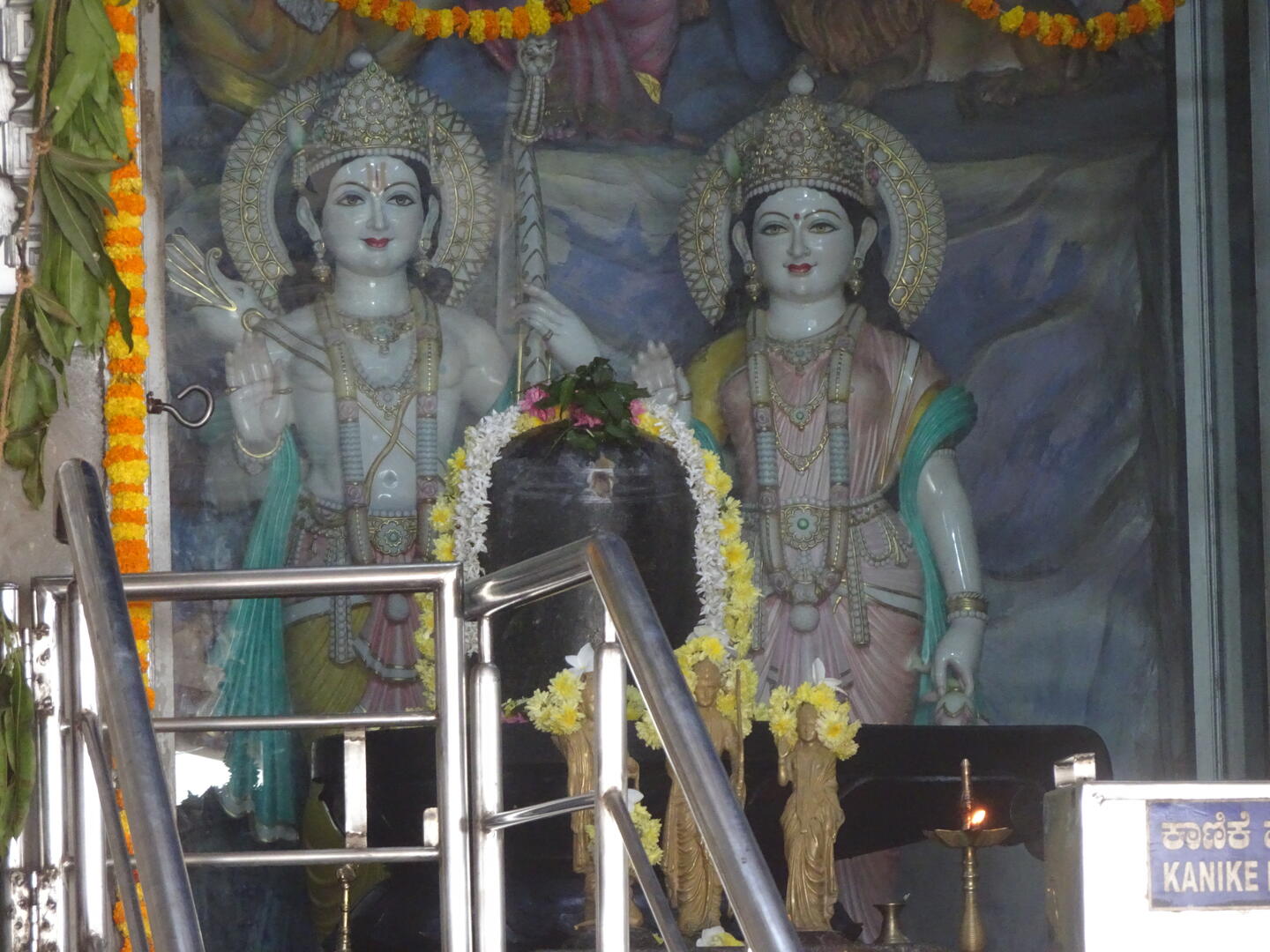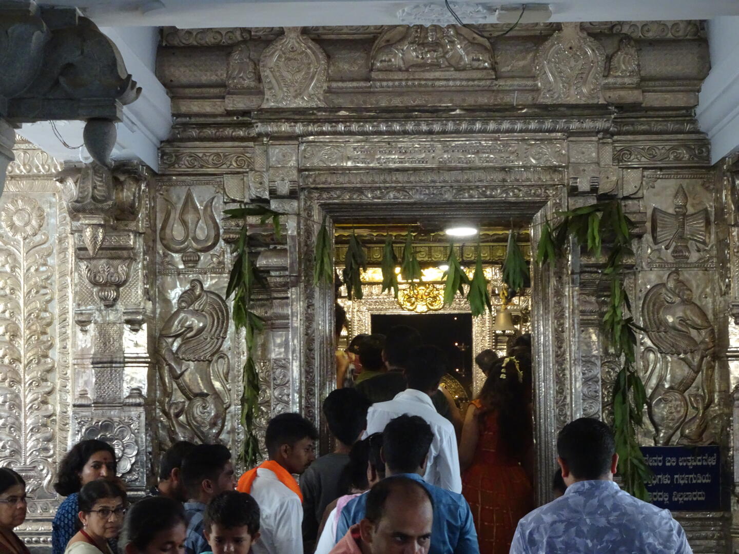 Nach dem Besuch der ca. 37 m hohen Shiva-Statue sowie des im Sockel der Statue angelegten Umgangs mit der Darstellung der Begebenheiten, die diesen Ort zu einem für Hindus heiligen machen, wollten wir den Gopuram besteigen. Noch vor fünf Jahren war dies nur über Treppen möglich und gefühlt 95 % der Inder gaben den Versuch bereits nach spätestens der dritten Etage keuchend auf. Aufgrund dieser Erfahrungen hat man jetzt wohl einen Aufzug installiert; mit der Folge, dass wir die Gopuramspitze diesmal mit anderen Besuchern teilen mussten. Der im Anschluss besuchte, in Teilen vergoldete alte Murdeshwar-Tempel hat wie alle hinduistischen Tempel diese besondere Atmosphäre, die die Gläubigen an die Anwesenheit der verehrten Gottheit glauben lässt.