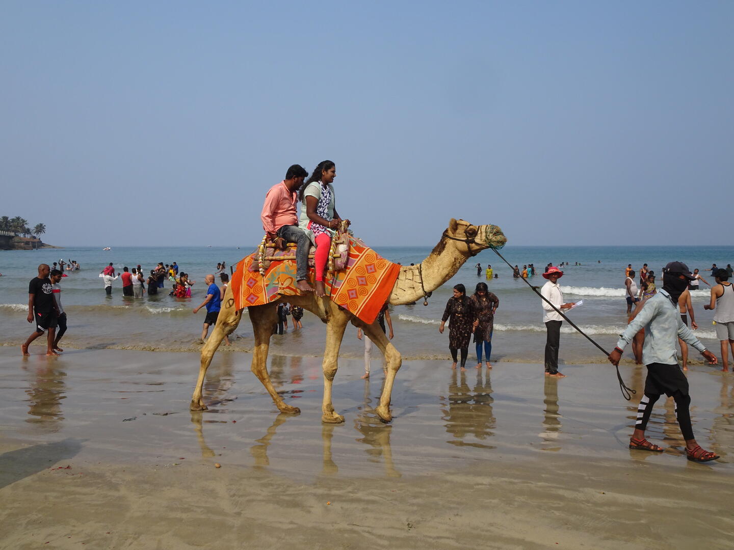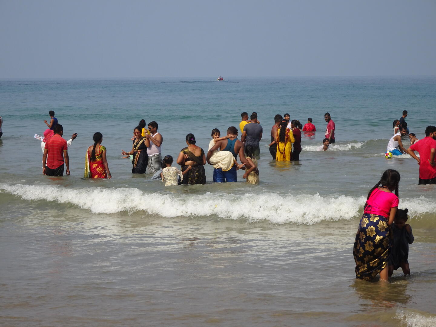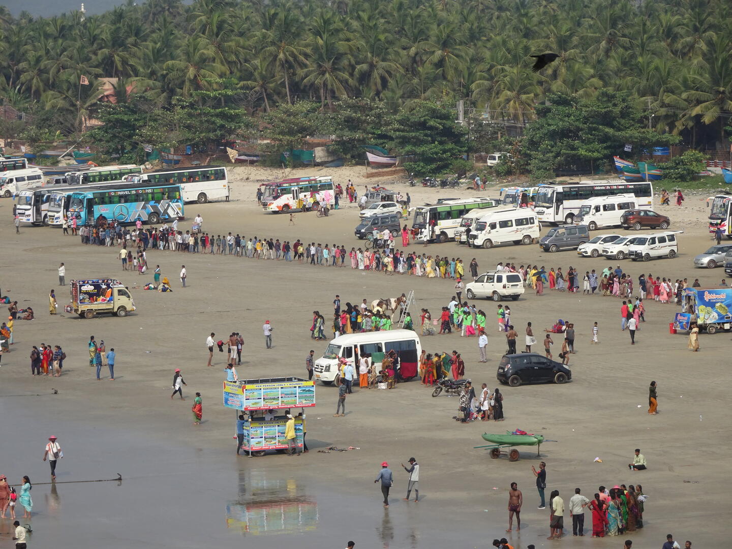Am gestrigen Sonntag war Murudeshwara mit indischen Wochenend- und Tagestouristen so gut gefüllt, dass wir den Besuch der bereits vor etwa fünf Jahren besichtigten Sehenswürdigkeiten auf heute verlegten. Die fast schon als kindlich zu bezeichnende Lebensfreude der Besucher, die sie versprühten, wenn sie in den Wellen planschten, war ansteckend. Insbesondere die indischen Frauen trauen sich oft nur hüfttief ins Wasser. Das liegt sicher nicht daran, dass nicht auch der Rest ihrer Saris mit Salzwasser getränkt werden soll. Viele Männer trauen sich immerhin bis zur Schulter ins Wasser. Wir haben keine fünf Schwimmer gesehen.