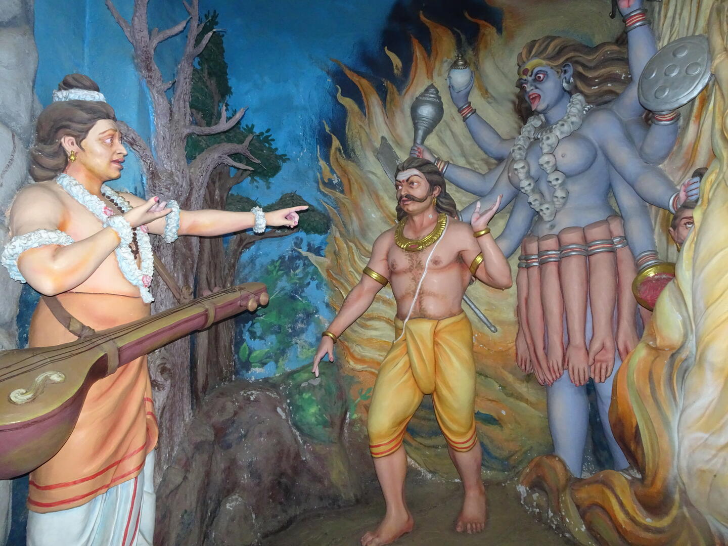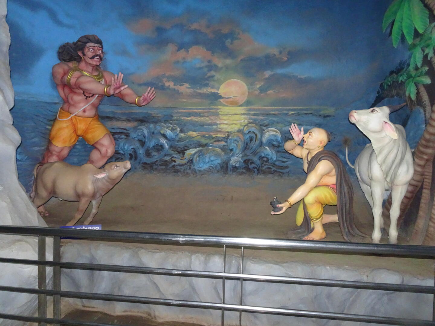 In einem Umgang im Fuß der Shiva-Statue wird dargestellt, wie dem Dämon Ravana die Unsterblichkeit verleihende Kraft eines Lingams genommen wird