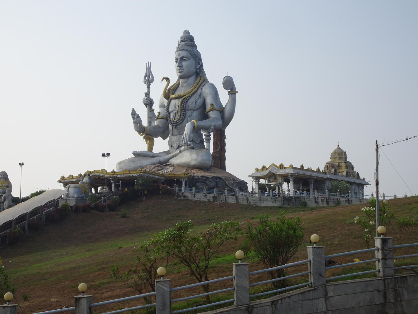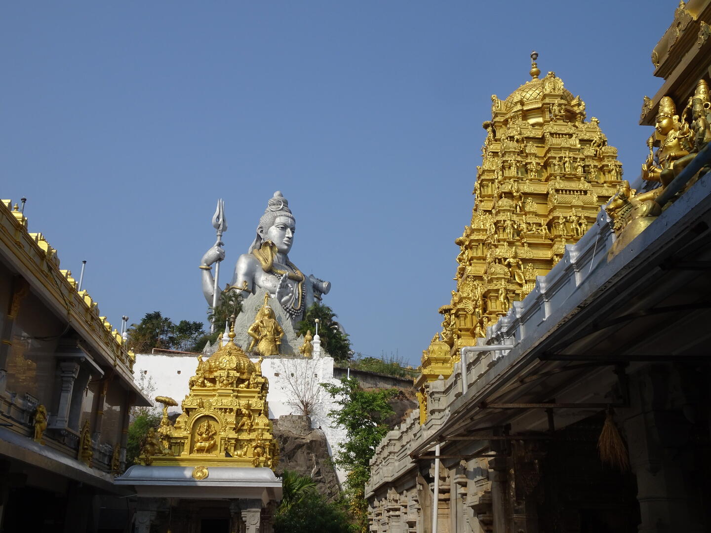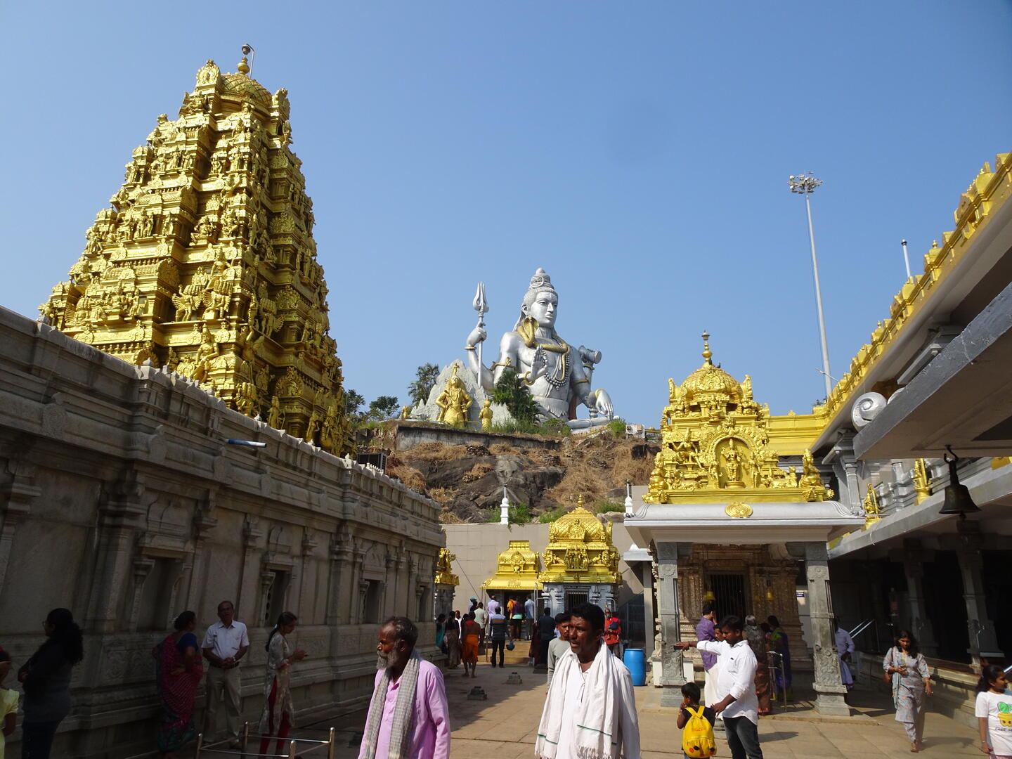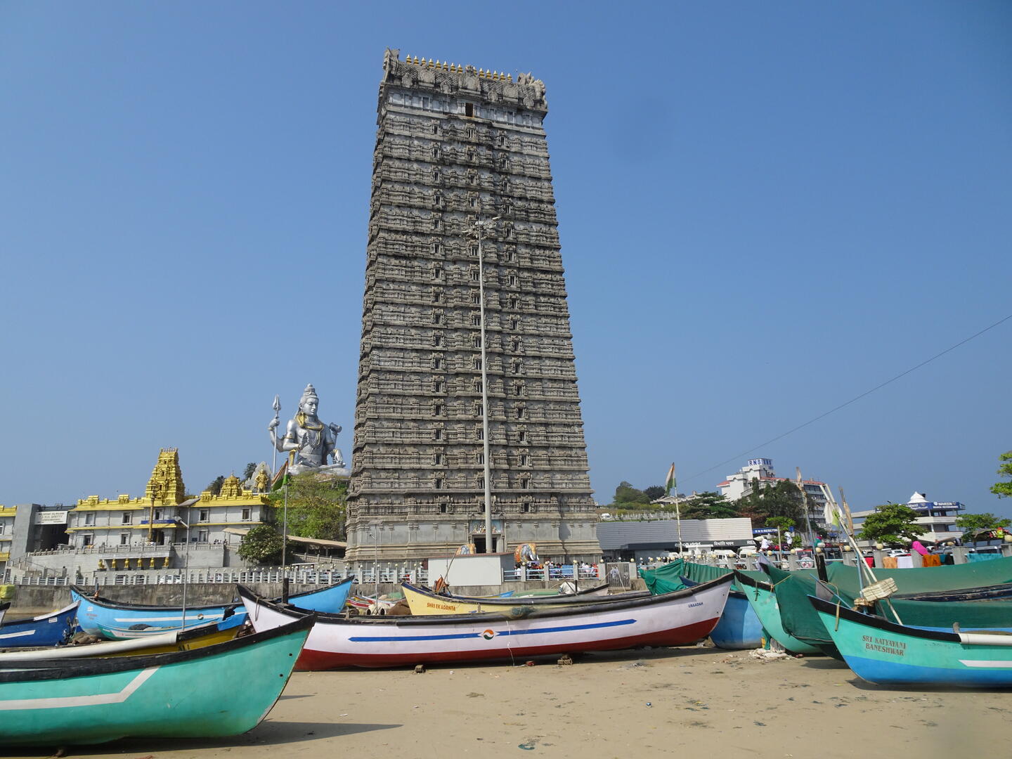 Der in Teilen vergoldete Murdeshwar-Tempel, darüber die Shiva-Statue und rechts der Gopuram Wo?Nach Rechtsklick