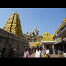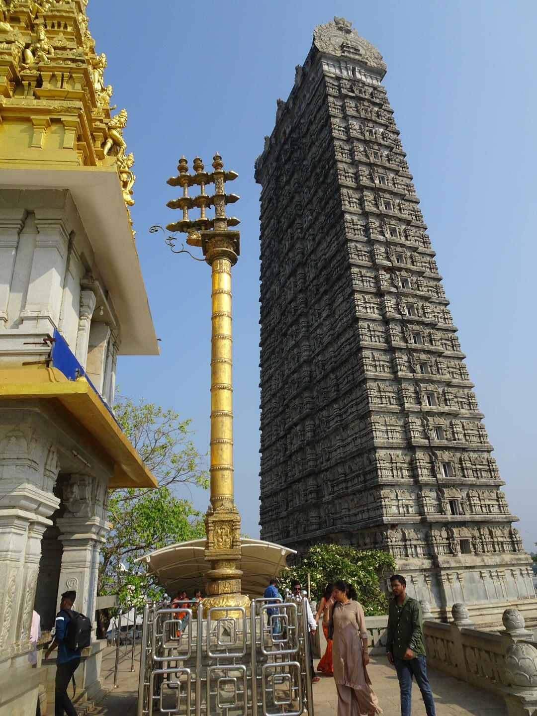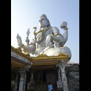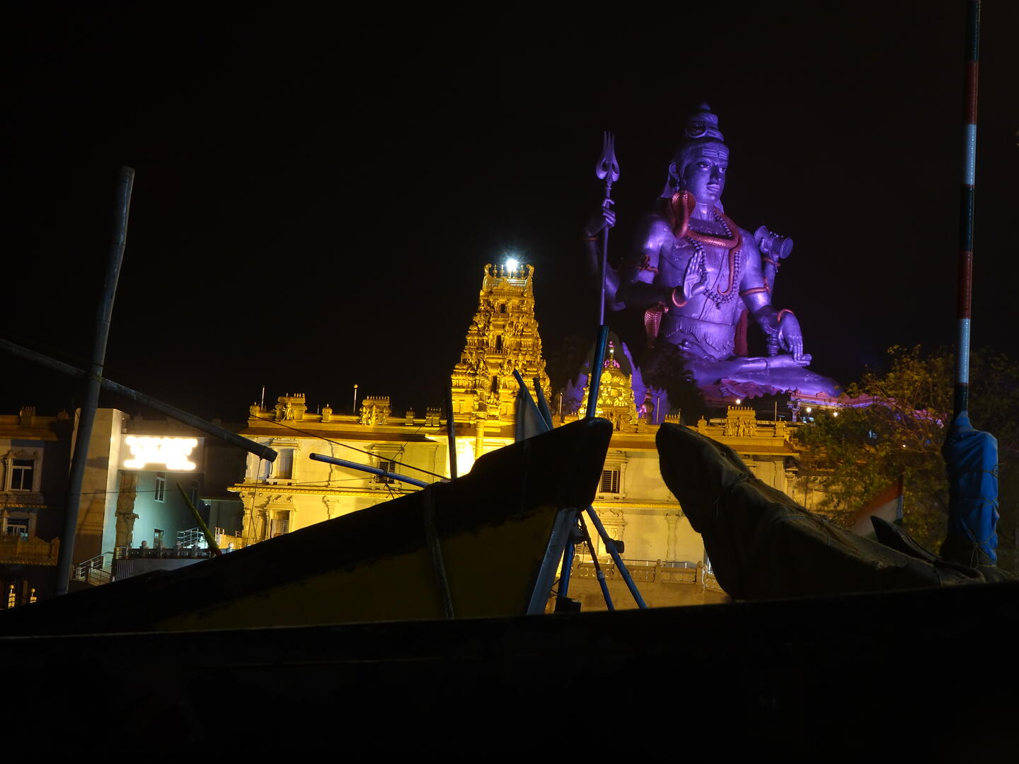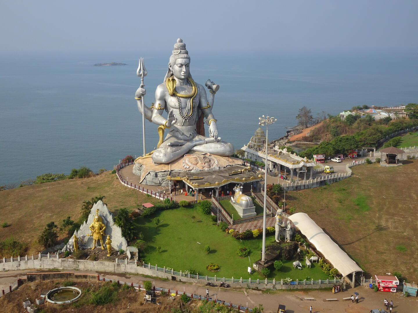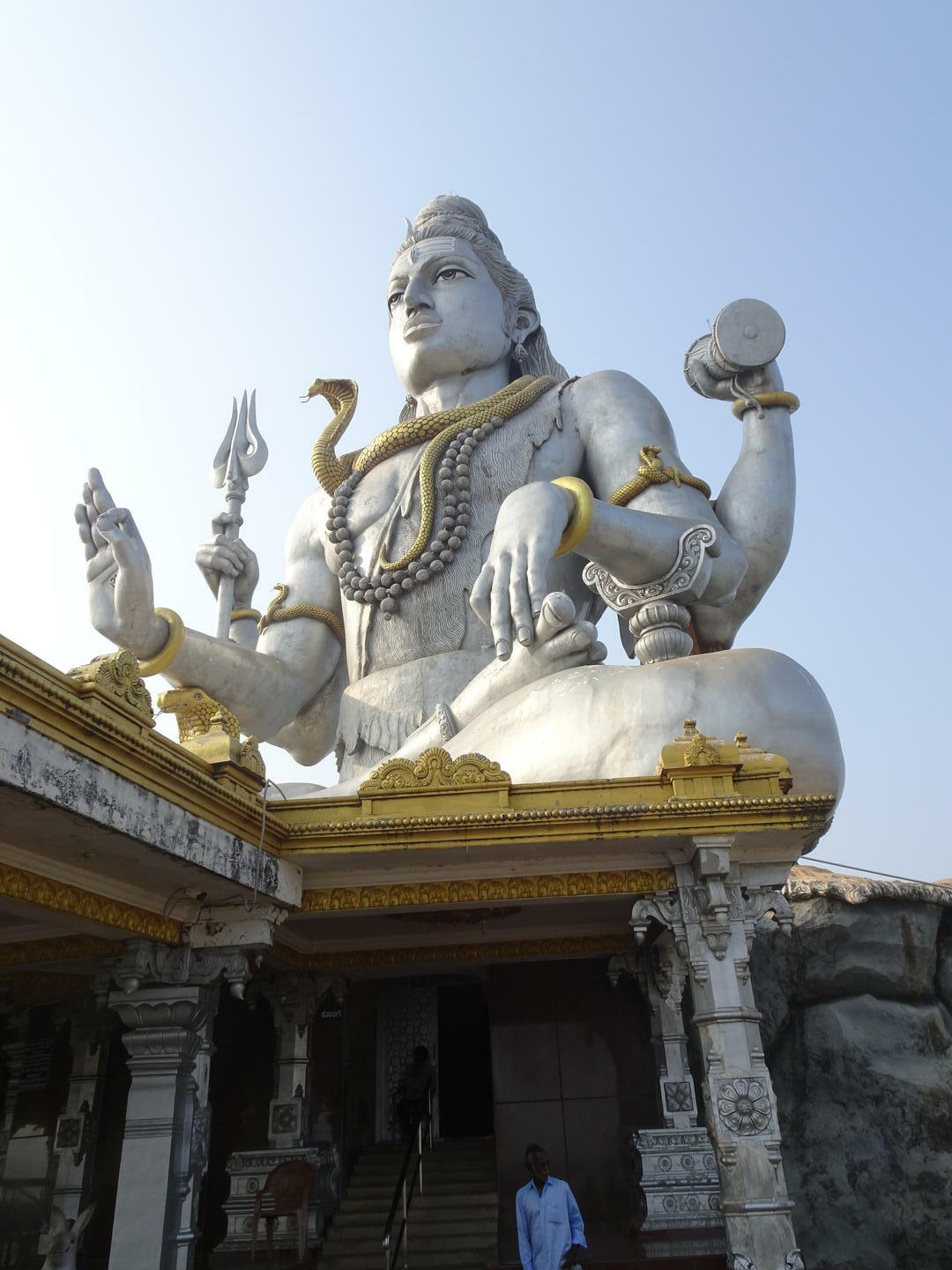 Der in Teilen vergoldete Murdeshwar-Tempel, darüber die Shiva-Statue und rechts der Gopuram Wo?Nach Rechtsklick