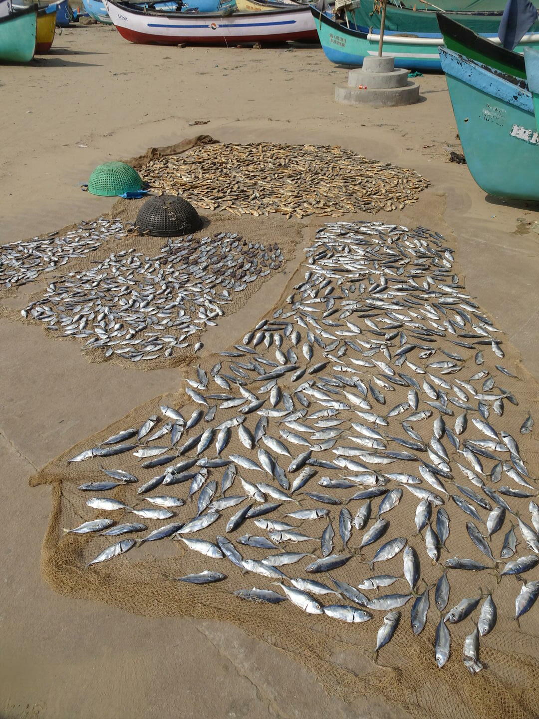 Fische werden zwischen den Fischerbooten auf dem Boden getrocknet Wo?Nach Rechtsklick