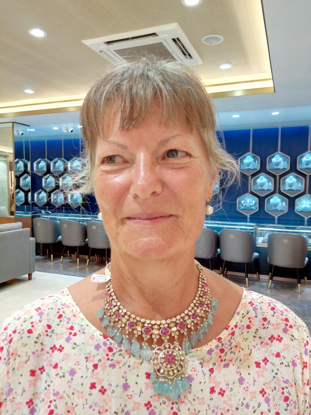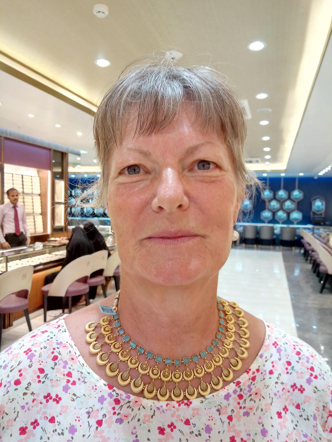 Am Sonntagmorgen gingen wir nach dem guten Hotelfrühstück noch einmal durch das Viertel. Diesmal besuchten wir u. a. ein großes Geschäft für Goldschmuck. Ein Viertel der Bevölkerung von Kerala sind Muslime und man spürt deutlich den arabischen Einfluss. Traditionell trägt die muslimische Braut bei der Hochzeit üppigen Goldschmuck. Die Modelle, die wir in diesem sehr großen, luxuriösen Geschäft auch ohne Kaufabsicht ansehen und Dagmar sogar anlegen durften, waren für unsere Verhältnisse opulent und in Optik und Verarbeitung atemberaubend. Auch in diesem Geschäft wurden wir ausgesprochen freundlich und höflich beraten und wir erfuhren wieder eine Menge Neues über Land und Leute.