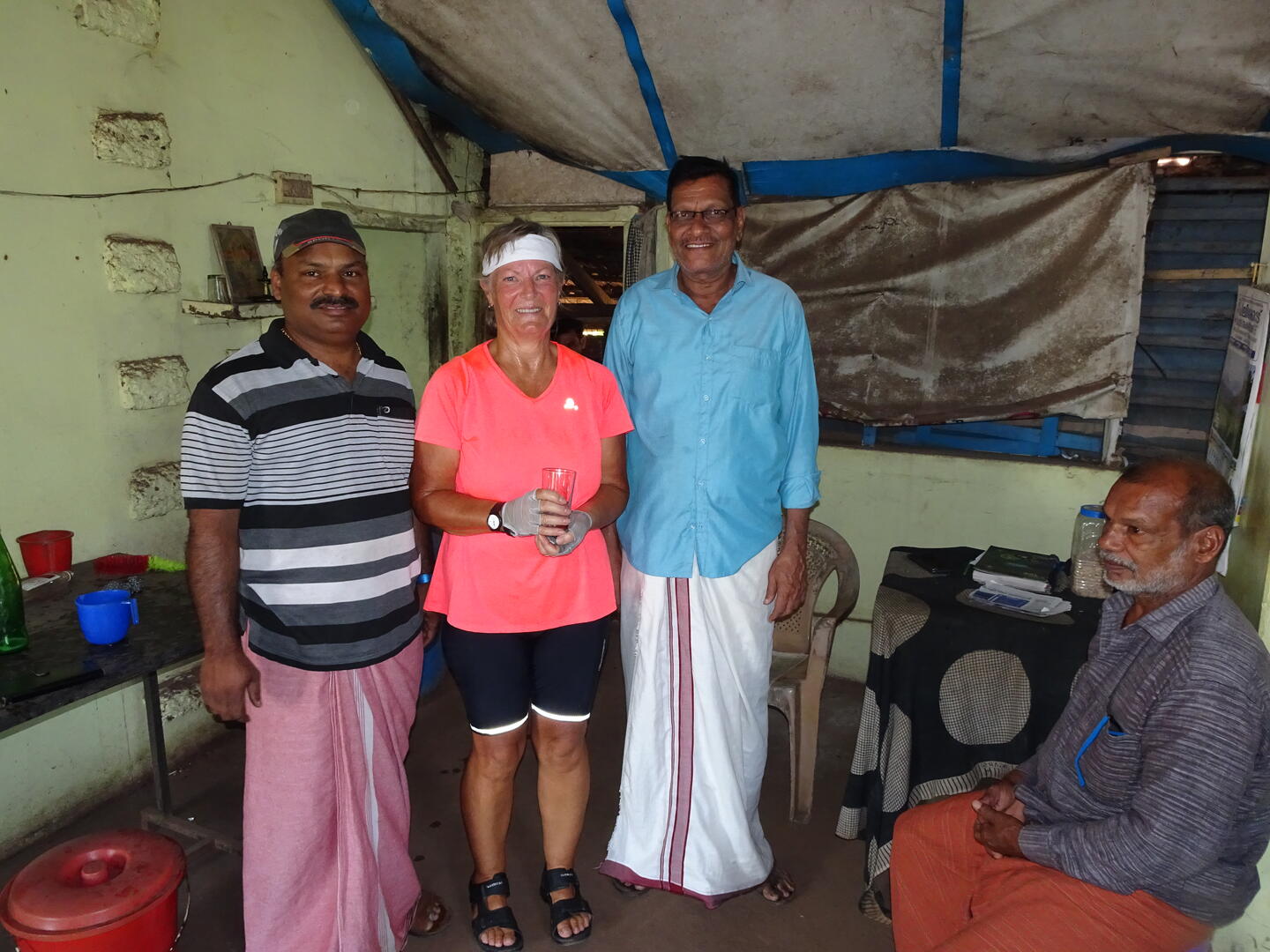 Das üppige Hotelfrühstück haben wir uns auch heute nicht entgehen lassen, denn wiederum ließ die Etappenlänge eine frühe Ankunft erwarten. Der Ausbau des NH 66 geht auch hier weiter, sodass wir etliche Kilometer durch Baustellen fuhren. Versüßt wurde uns der Weg durch frischen Zuckerrohrsaft und endlich auch durch Toddy in einen der typischen Toddy-Shops. Es ist immer wieder erfreulich, wie nett und aufgeschlossen die Betreiber und Gäste solcher Läden sind. Jedes Mal kommt es zu netten Gesprächen und man fährt beschwingt die nächsten Kilometer – was nicht nur am geringen Alkoholgehalt des Getränks liegt.