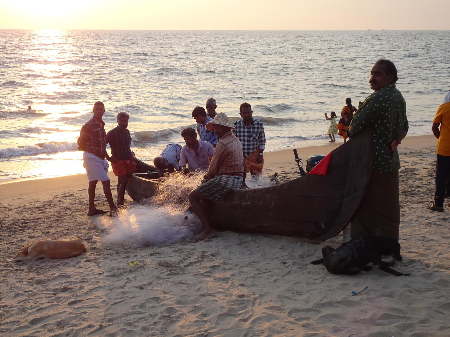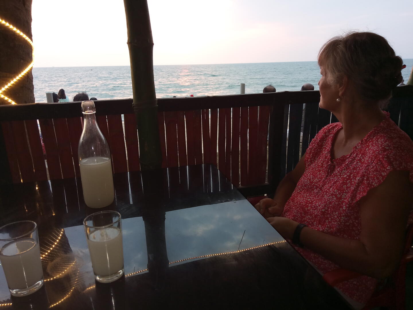 Am Tag unserer Ankunft in Cherai Beach hatten wir uns in unserem kleinen Bungalow etwas eingerichtet und unsere Wäsche eingeweicht. Am Abend fanden wir ein Restaurant in schöner Lage direkt am Strand. Mit Toddy, dem unvergleichlichen, teilgegorenen Palmblütensaft fand der Tag einen perfekten Abschluss.