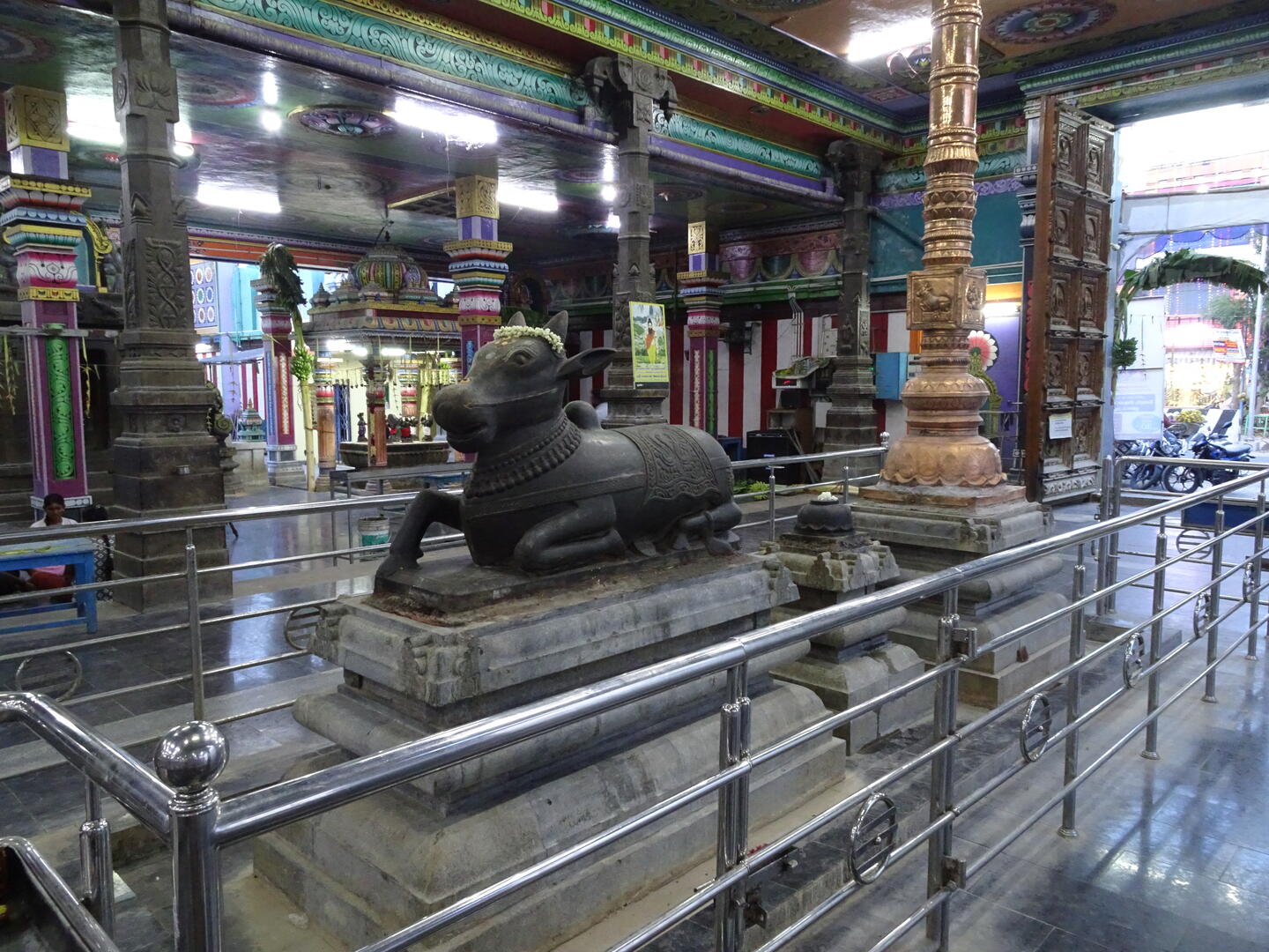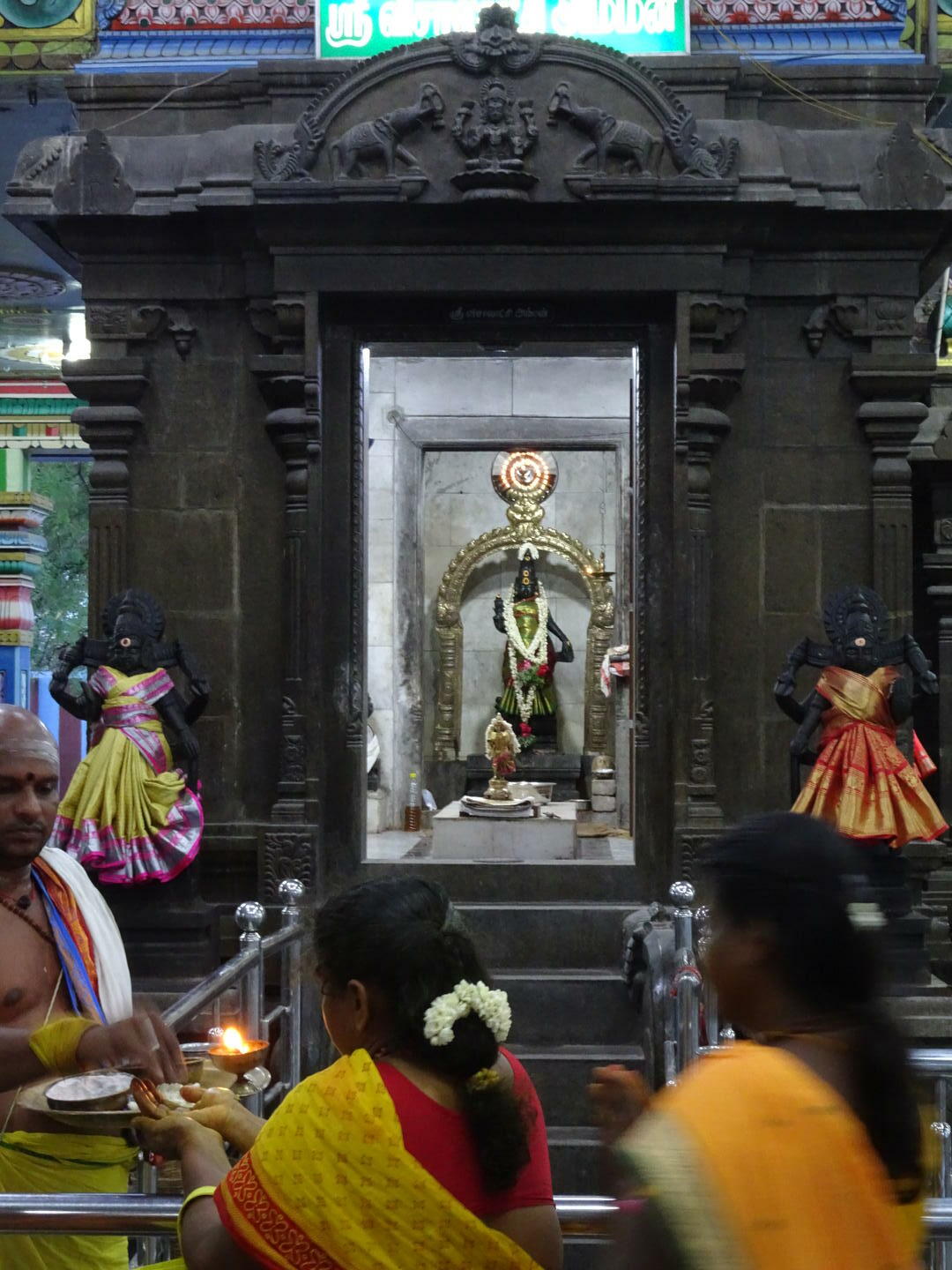 Ein Nachtrag zum gestrigen Tag: Auf dem Weg zum Abendessen wurden wir, als wir uns den Gopuram eines Hindutempels ansahen, von einem Mönch sehr freundlich hereingebeten. Ohne diese Aufforderung hätten wir den Tempel nicht betreten, denn den Hinweisschildern, die vermutlich in Tamil und der tamilischen Schrift verfasst sind, konnten wir nicht entnehmen ob Nichthindus Zutritt haben und wir adäquat gekleidet waren. Die sehr aufgeschlossenen Mönche erklärten gerne ihre Rituale und welche Gottheiten im Tempel verehrt werden. Nachdem für uns ein Mönch im Allerheiligsten des Tempels vor der Statue Shivas ein Ritual zelebriert hatte, bedankten wir uns mit einer kleinen Spende und bekamen als Segenszeichen einen weißen Strich und einen dunkelroten Punkt auf die Stirn. Dagmar wurde ein kleiner Blumenkranz gereicht, den sie ins Haar stecken sollte. In dieser touristisch unbedeutenden Stadt sind ausländische Besucher des Tempels wohl sehr selten, sodass man uns erst nach zahlreichen Selfies und nachdem wir über unsere Reise berichtet hatten, gehen ließ. Obwohl wir schon öfter solchen Ritualen beigewohnt haben, beeindruckt uns jedes Mal die trotz der entspannten Stimmung spürbare Ernsthaftigkeit der Handlungen.