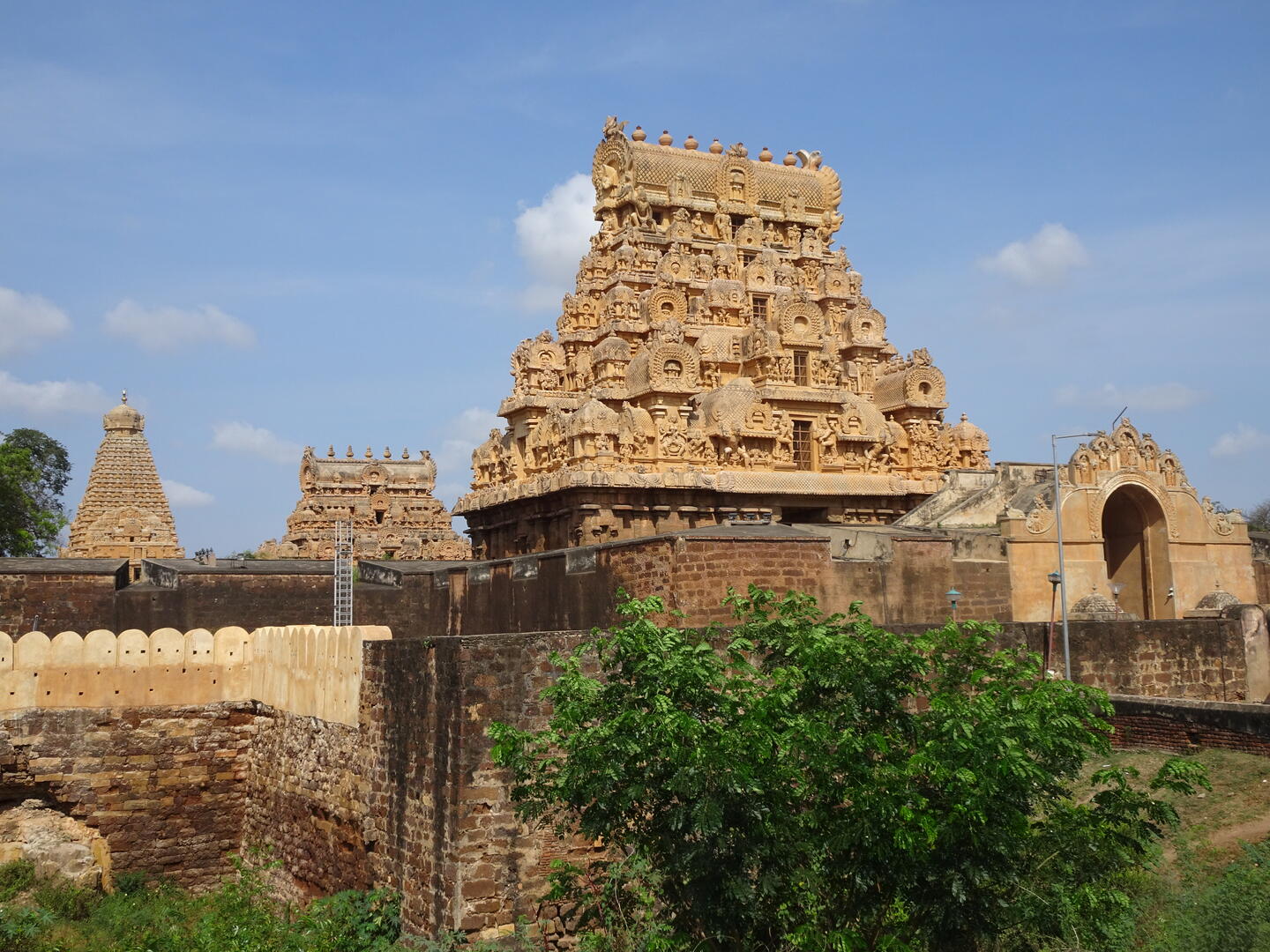 Der Blick von außen auf den Brihadishvara-Tempel. Von rechts nach links: Das Nayak-Tor, zwei Gopurams und schließlich das Vimana, der Turm über dem zentralen Schrein Wo?Nach Rechtsklick