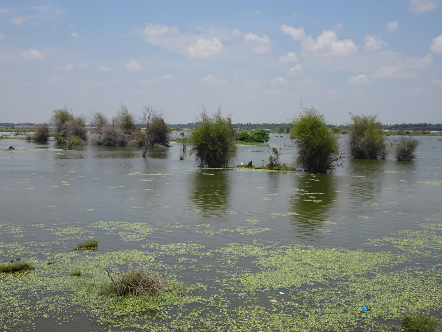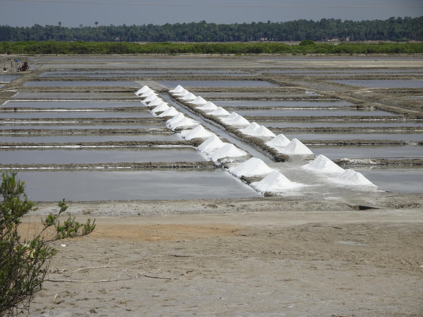 Im ersten Teil unseres Reiseberichts lasen wir zur Vorbereitung auf unsere heutige Etappe im Beitrag, in dem wir über die auch heute gefahrene Strecke berichtet hatten, dass uns damals Gegenwind zu schaffen machte. Das scheint an der Gegend zu liegen, denn nach langer Zeit während der Wind unser Vorankommen weder in positiver noch negativer Weise beeinflusst hatte, herrschte heute auf der zweiten Hälfte der Strecke erstmals wieder mäßiger Gegenwind. Ihm wird in der flachen Landschaft mit ihren Lagunen und großen Salzgewinnungsgebieten kein Widerstand geboten. Neben der Straße liegen zwischen den zahlreichen Reisfeldern teils große Feuchtgebiete, auf deren Wasserflächenanteilen Lotos und Seerosen wachsen. Das ist ein Paradies für Wasservögel und wir wundern uns, dass es für die unzähligen Vögel ausreichend Nahrung gibt.