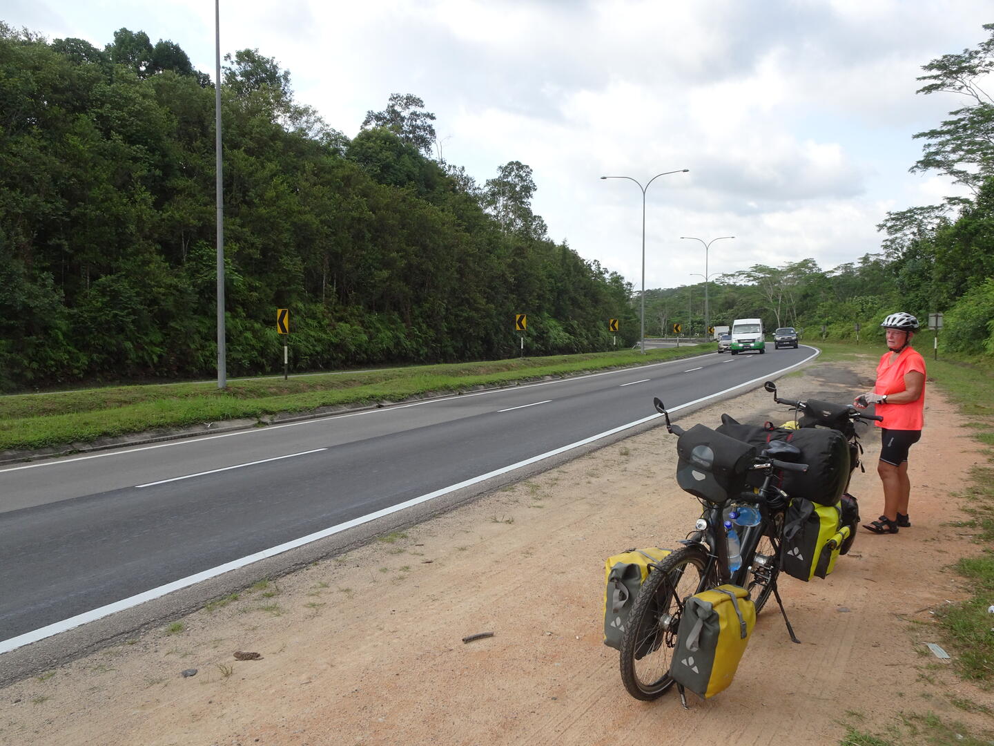 Der Wetterbericht für den heutigen Tag hatte nur eine geringe Regenwahrscheinlichkeit angekündigt, was in Singapur und dieser Region nicht selbstverständlich ist, denn es heißt, hier würde es nur mal mehr und mal weniger regnen. Da nur eine kurze Strecke bis zu unserem Ziel, Kota Tinggi, zurückzulegen war und wir bei zu früher Ankunft ggf. mit dem Einchecken hätten warten müssen, bis das Zimmer frei und wieder hergerichtet ist, gönnten wir es uns, erst um 7:30 Uhr loszufahren. Es war ungewohnt, nach mehr als drei Monaten wieder auf den Rädern zu sitzen.