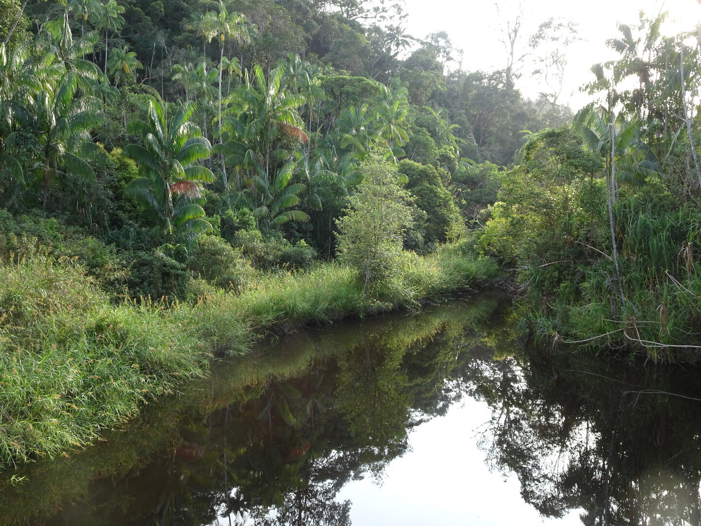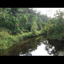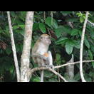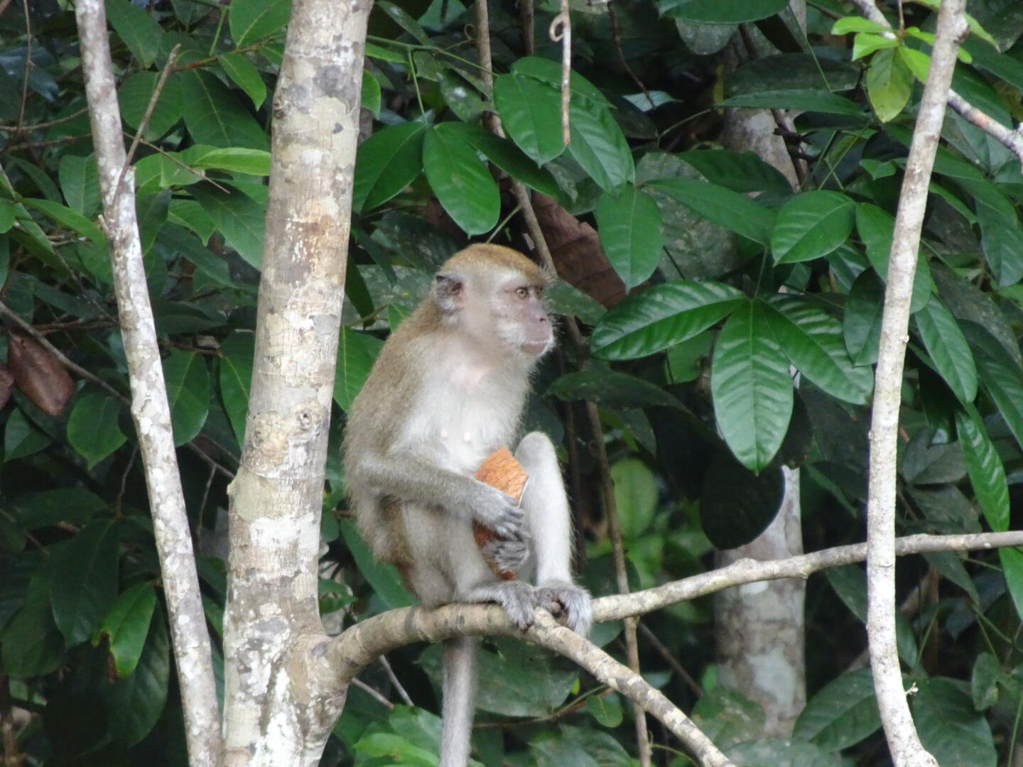 Heute verließen wir die Hauptverkehrsstraße und fuhren die näher an der Küste verlaufende, sehr viel ruhigere und landschaftlich schönere Route durch eine Landschaft, die noch sehr ursprünglich wirkt. Nach der Ölpalmen-Monokultur freuten wir uns an der sehr abwechslungsreichen Fauna und Flora. Wir sahen und hörten zahlreichen exotische Vögel und bewunderten die undurchdringlich erscheinende Vegetation neben der Straße. Wir begegneten einigen Affenhorden. Selbstbewusst bleiben ältere männlichen Tiere am Straßenrand sitzen, selbst wenn sie von einem Auto passiert werden. Offensichtlich sind sie bereit, die übrigen Mitglieder der Gruppe und insbesondere die vielen Jungtiere zu verteidigen, denn wenn sie meinten, dass wir keinen gebührenden Abstand einhielten, knurrten sie bedrohlich – eine Geste, die wir verstanden und die uns veranlasste, jeweils auf die andere Straßenseite zu wechseln. Wenn wir zu Fuß unterwegs sind und in der Ferne Affen sehen, bewaffnen wir uns stets mit Astruten, eine Geste, die wiederum von Affen verstanden wird. So sind wir bisher gut miteinander ausgekommen.