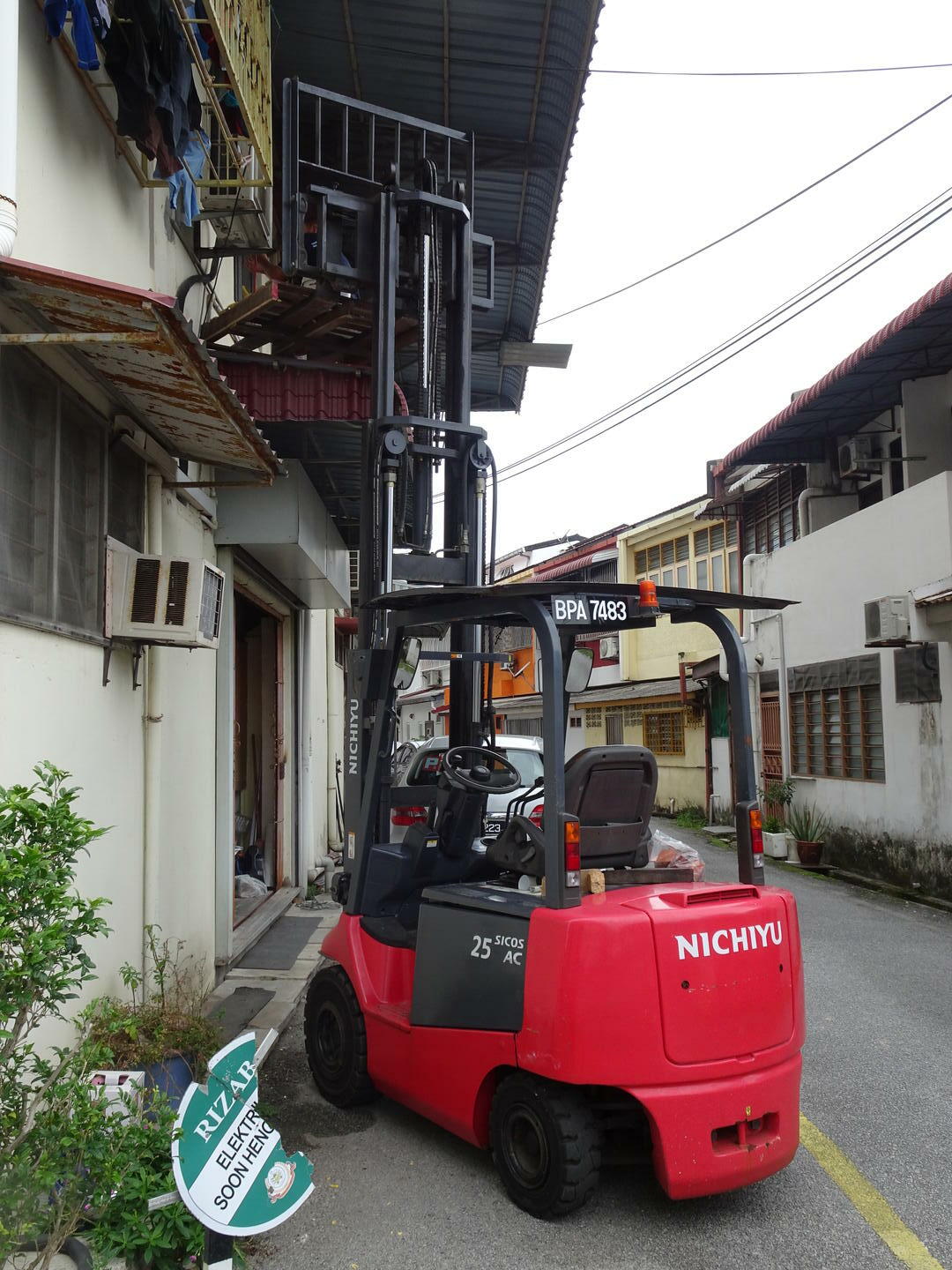 Eine Palette und ein Gabelstapler ersetzen den Hubsteiger beim Reparieren eines Wärmetauschers Wo?Nach Rechtsklick
