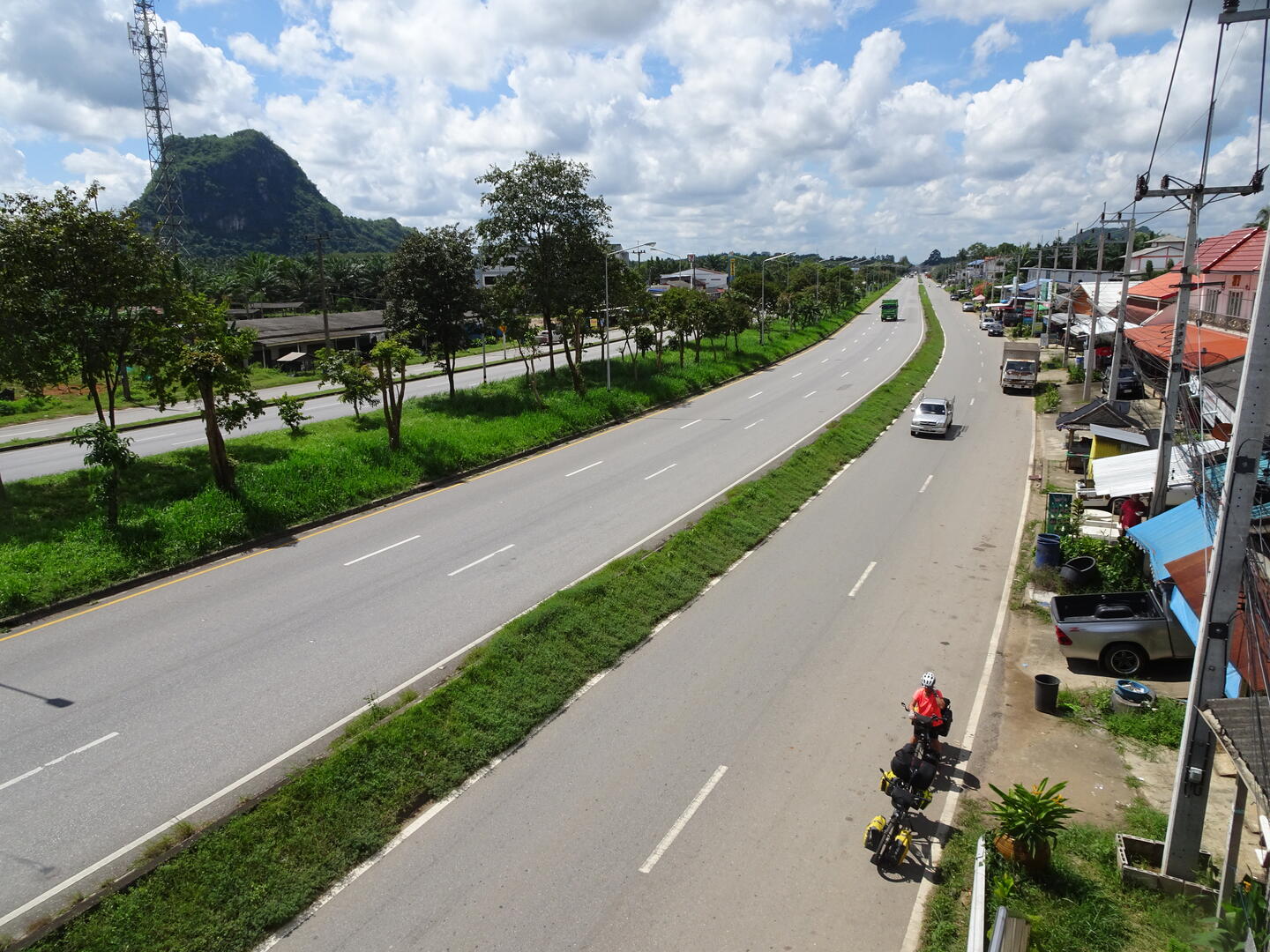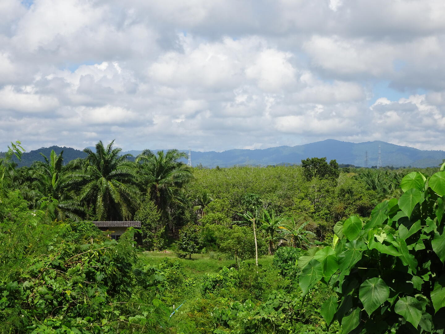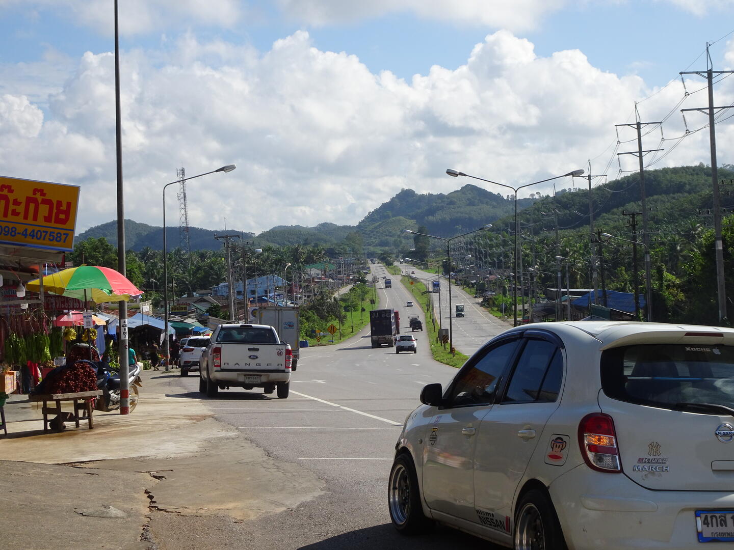 In Chumphon hatten wir beobachtet, dass sich die Wolken entlang der Gebirgskette zu Myanmar aufhängen. Der Himmel über Chumphon war, anders als wir ihn zuletzt weiter südlich erlebt hatten, entweder blau oder zeigte Schönwetterwolken. Es blieb trocken. Möglicherweise setzt der Monsun gegenüber dem tiefen Süden hier etwas verzögert ein. Heute blieb es jedenfalls ebenfalls trocken. Die Landschaft ist von üppigem Grün überzogen. Wo etwas angebaut wird, wechseln sich Kautschukplantagen mit Ölpalmenwäldern sowie Ananasfeldern ab.