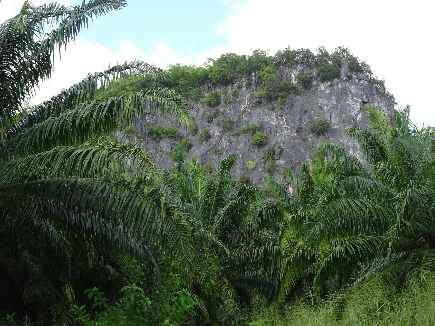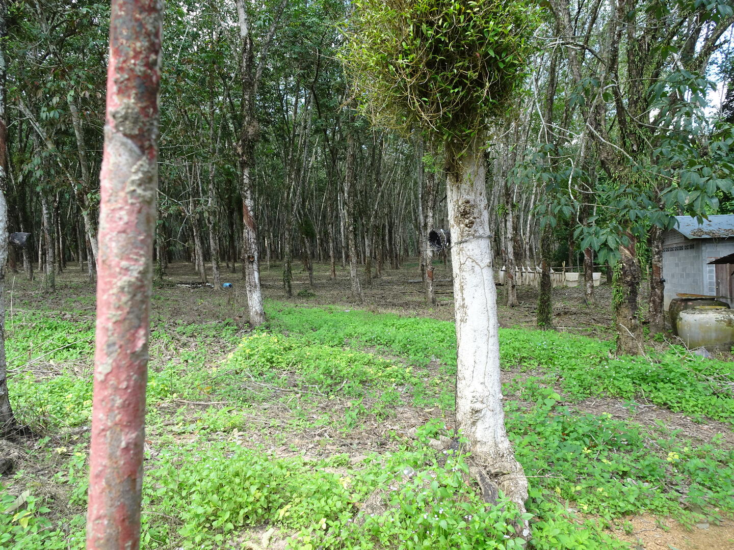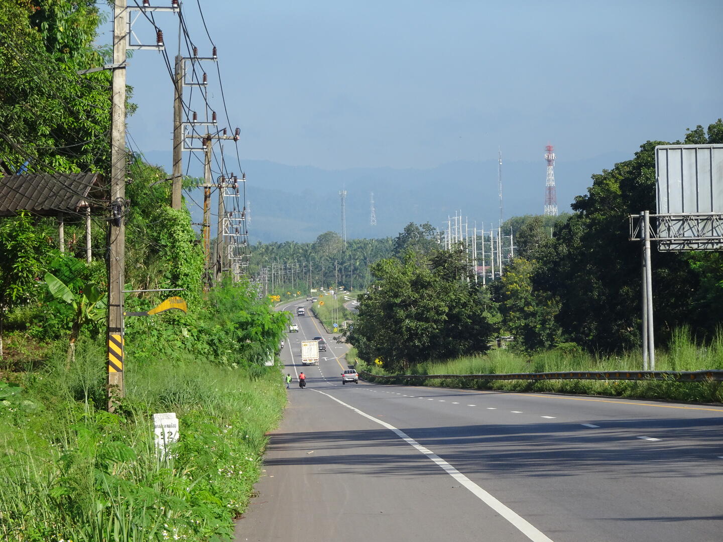 In Chumphon hatten wir beobachtet, dass sich die Wolken entlang der Gebirgskette zu Myanmar aufhängen. Der Himmel über Chumphon war, anders als wir ihn zuletzt weiter südlich erlebt hatten, entweder blau oder zeigte Schönwetterwolken. Es blieb trocken. Möglicherweise setzt der Monsun gegenüber dem tiefen Süden hier etwas verzögert ein. Heute blieb es jedenfalls ebenfalls trocken. Die Landschaft ist von üppigem Grün überzogen. Wo etwas angebaut wird, wechseln sich Kautschukplantagen mit Ölpalmenwäldern sowie Ananasfeldern ab.