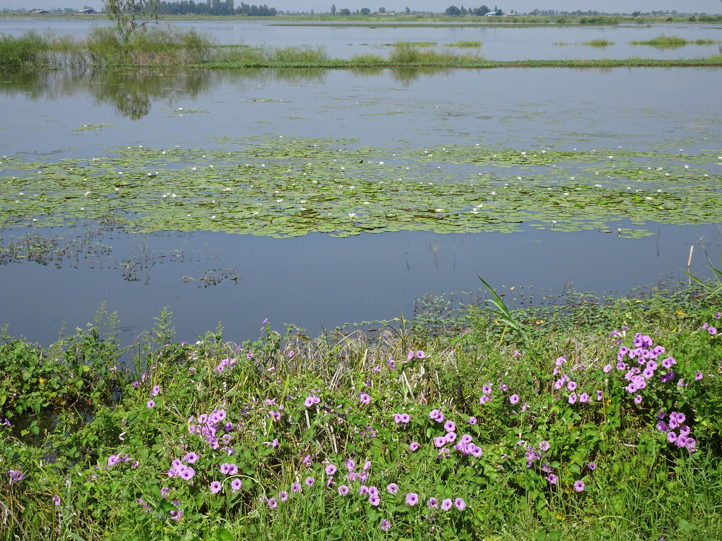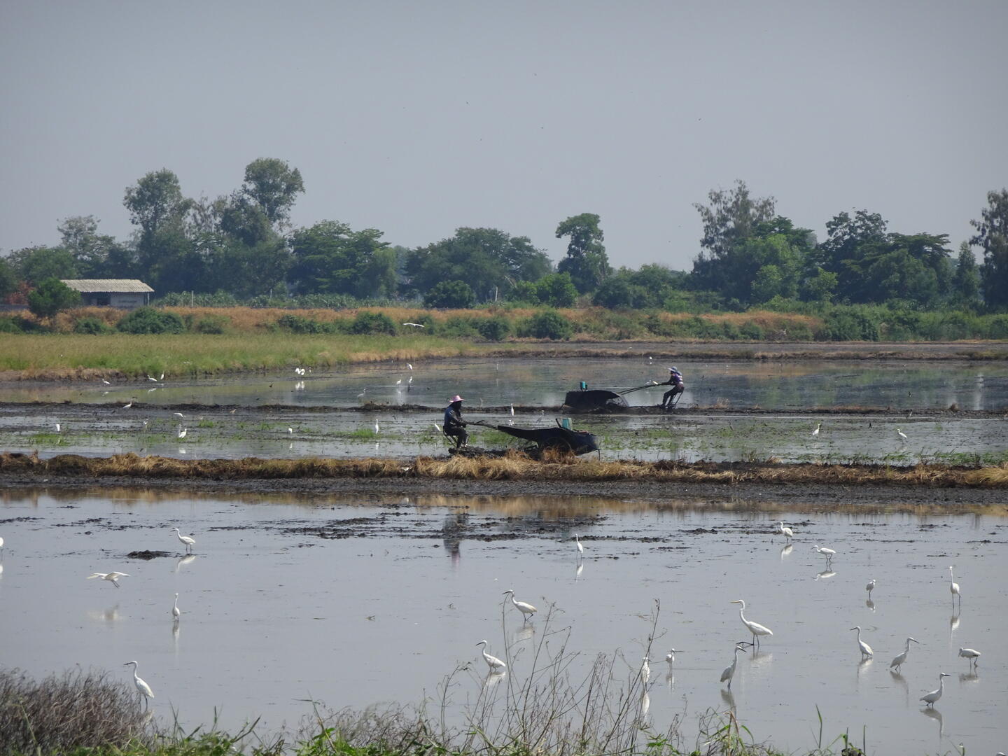 Unterwegs sahen wir einige beeindruckende buddhistische und chinesische Tempel. Wir durchfuhren die sog. Reisschüssel Thailands: Ein großes Gebiet mit vielen Reisfeldern und entsprechend vielen Wasservögeln. Die Felder werden für die nächste Anpflanzung vorbereitet und wir sahen Reisbauern, die hinter ihren kleinen Allzweck-Fahrzeugen wie auf einem überbreiten Monoski den schlammigen Boden pflügten.