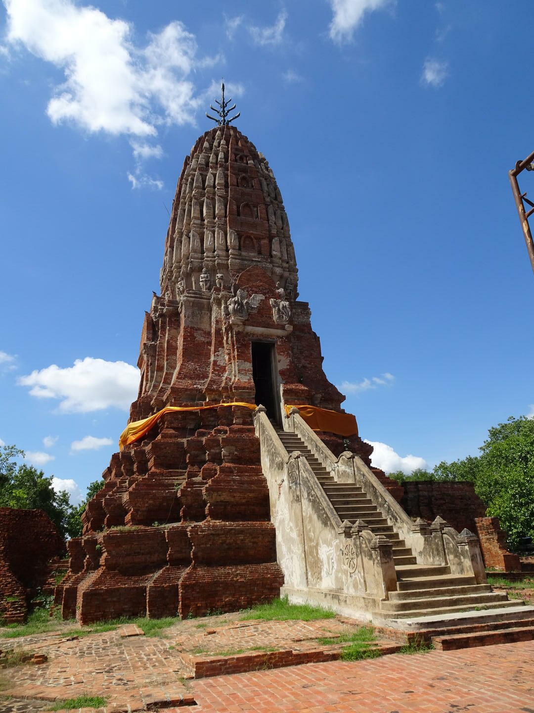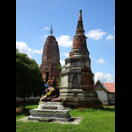 Auf dem Weg nach Chiang Mai wollen wir einige ehemalige Königsstädte besuchen. Die meisten haben ihre ehemalige Bedeutung verloren und sind daher nicht durch große Highways miteinander verbunden. Lop Buri erreichten wir heute teilweise auf kleinen Straßen mit wenig Verkehr. Etwa 30 km vor unserem Ziel bemerkte Diez das für einen Platten typische schwammige Fahrgefühl. Wir befuhren eine kleine Straße und konnten die Reparatur in einer Einfahrt im Schatten neben einem kleinen Stand durchführen, an dem Getränke von einer äußerst hilfsbereiten jungen Dame angeboten wurden. Wir entschlossen uns direkt zum Ausbau des betroffenen Hinterrades, da der langsame Druckverlust ohnehin eine intensive Suche unvermeidlich erschienen ließ. Das stellte sich als richtige Entscheidung heraus, denn wenn wir nur ein Leck gefunden und geflickt hätten, wären uns die beiden anderen, die wir bei der Analyse des Schlauches fanden, verborgen geblieben – zumindest bis zur Weiterfahrt. Das vermeintlich zeitsparende Vorgehen, bei der der Schlauch lediglich partiell an der Stelle eines die Defektstelle verratenden Fremdkörpers in der Decke unter dieser hervorgezogen und geflickt worden wäre, hätte uns heute noch zwei weitere Mal zur Reparatur gezwungen. Durch die bereits in der Vergangenheit detailliert beschriebene Methode konnten anhand der im Schlauch gefundenen Defekte schnell die Verursacher in der Decke lokalisiert und entfernt werden.