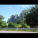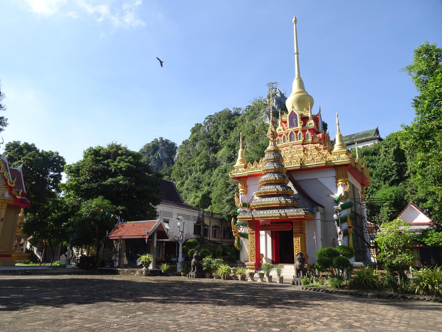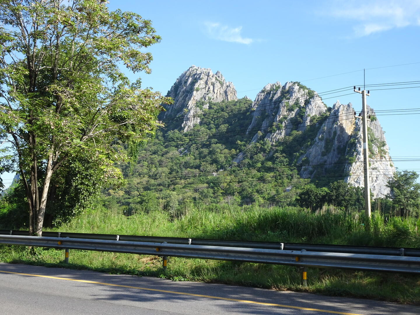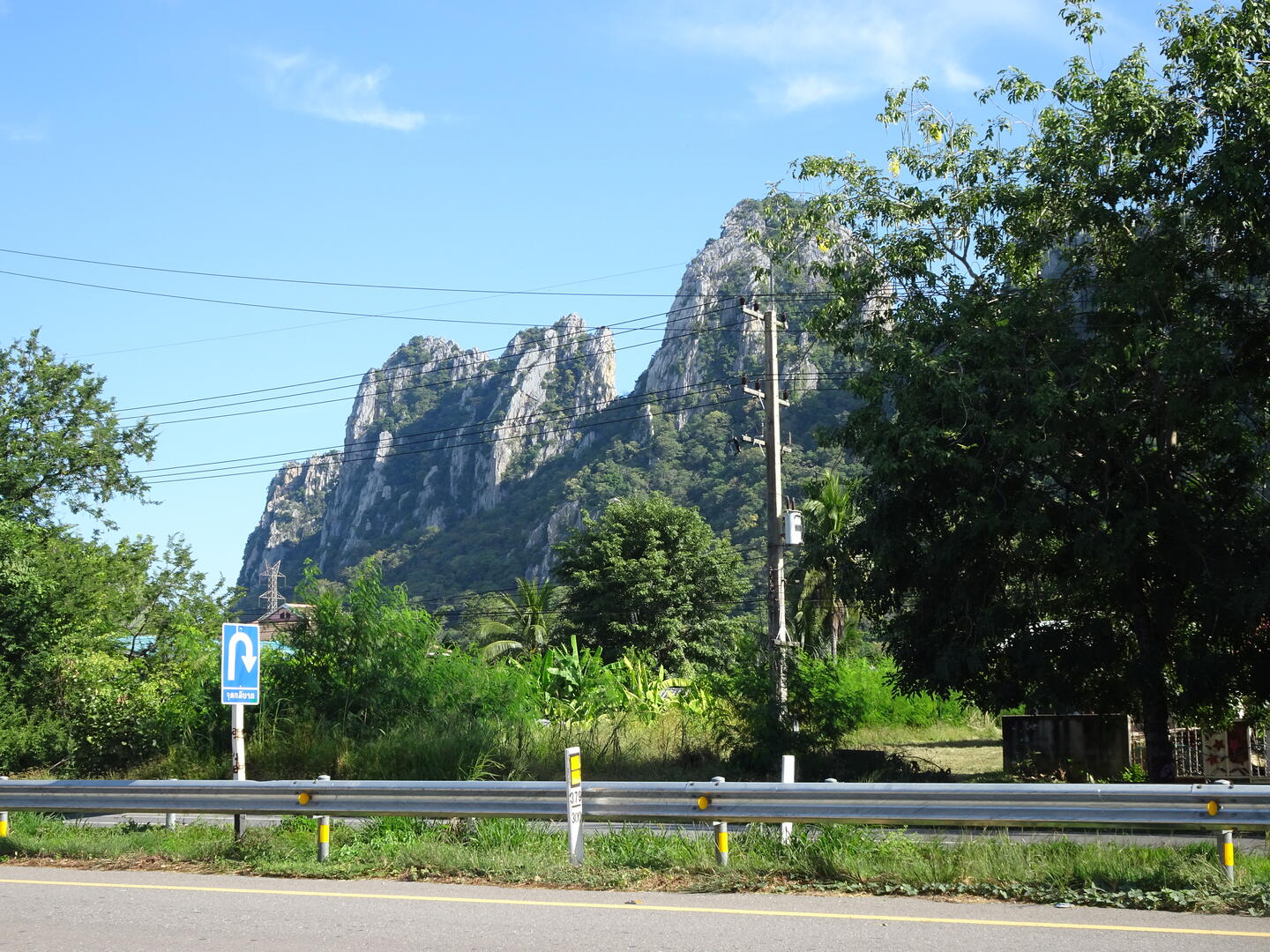 Immer wieder laden Tempel neben der Straße zum Fotografieren ein. Aus der Ebene, durch die wir weiterhin fahren, ragen steile Kalkfelsen empor.