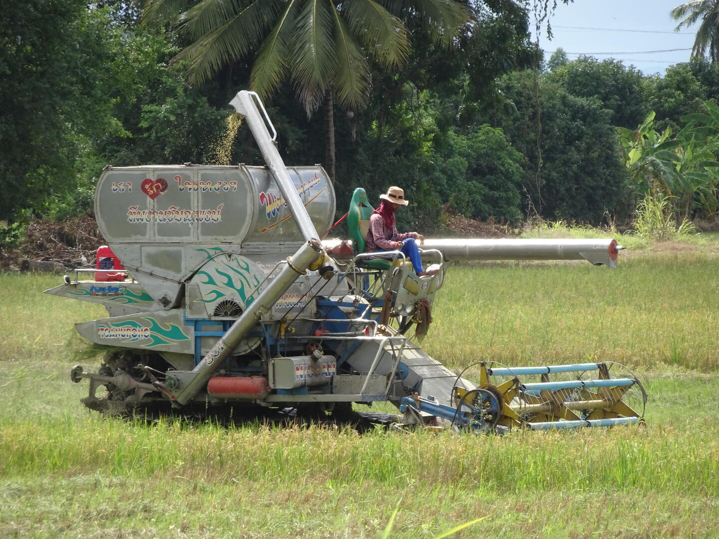 Heute Morgen wurden um 6 Uhr auf einer Anzeigentafel als Temperatur 26 Grad angezeigt. Eine für uns durchaus angenehme Temperatur. Unsere Fahrt führte uns bei schönem Wetter ohne drohende Regenwolken wieder durch große Reisfelder mit vielen Wasservögeln. Der Reisanbau unterliegt offensichtlich keiner strengen jahreszeitlichen Abfolge, denn nachdem wir vorgestern eine maschinelle Pflanzung beobachten konnten, sahen wir heute den Einsatz eines Mähdreschers.