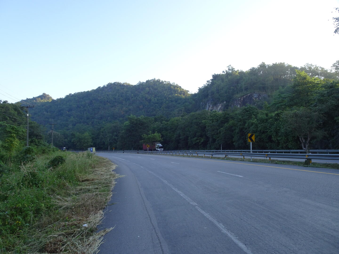 Inzwischen haben wir uns so weit nach Norden bewegt, dass der im Winter mit zunehmender geographischer Breite spätere Sonnenaufgang bemerkbar ist. Daher fuhren wir noch eine halbe Stunde im Dunkeln, bis es zu dämmern begann. Es war so frisch, dass sich Dagmar ein zweites T-Shirt überzog. Bereits seit einigen Tagen nutzten wir die Klimaanlage allenfalls noch über die Mittagsstunden. Heute war es nebelig. Das wird an den größeren Temperaturunterschieden zwischen Tag und Nacht sowie der Nähe zum Wang, durch dessen Tal wir fuhren, liegen. Die fahle Sonne konnten wir erst gegen halb neun durch den Hochnebel sehen. Eine Stunde später wurde der Nebel so dicht, dass wir wieder mit Licht fuhren.