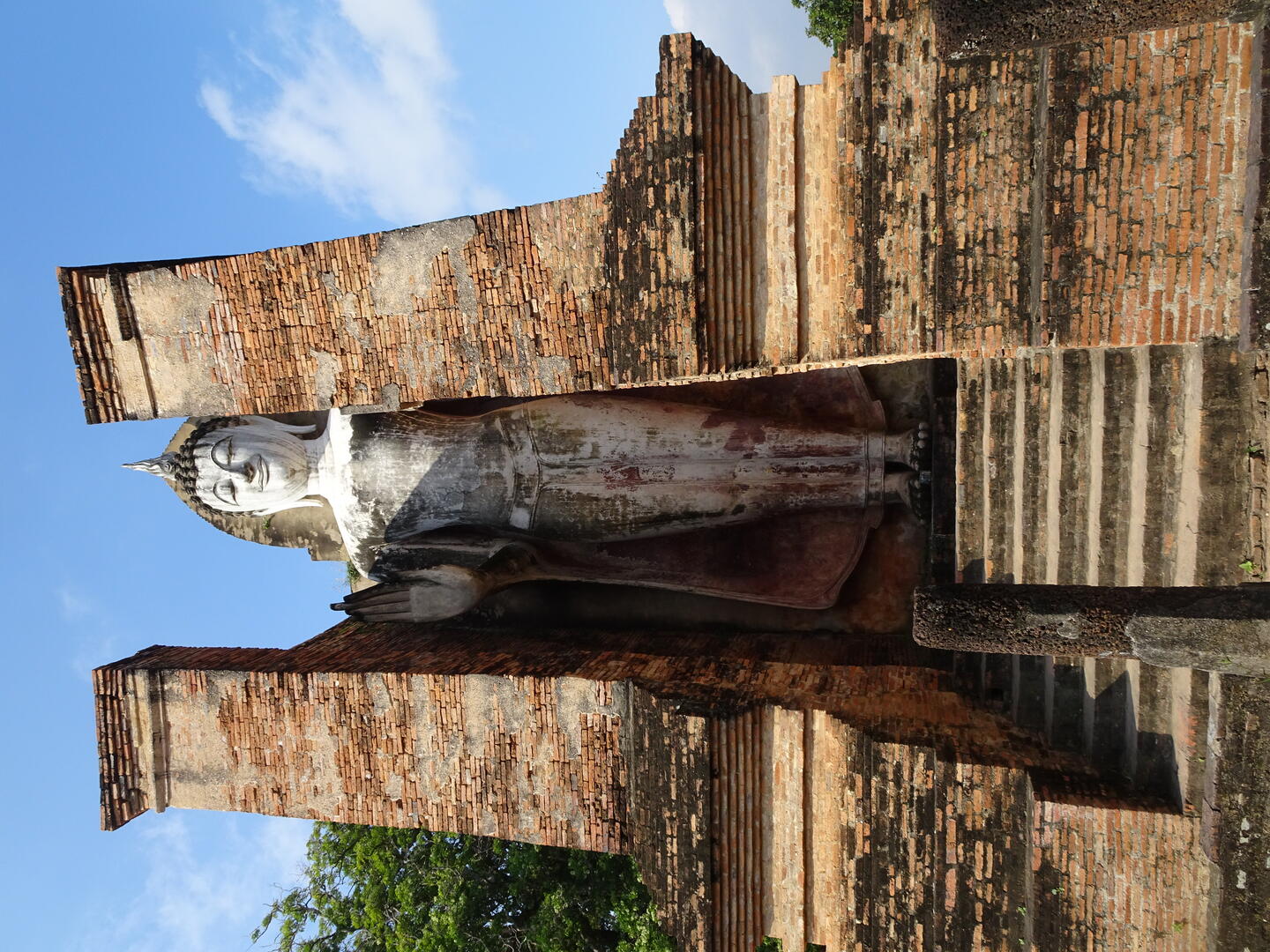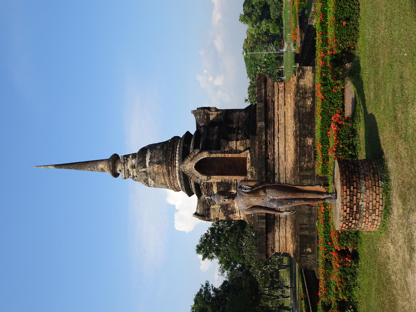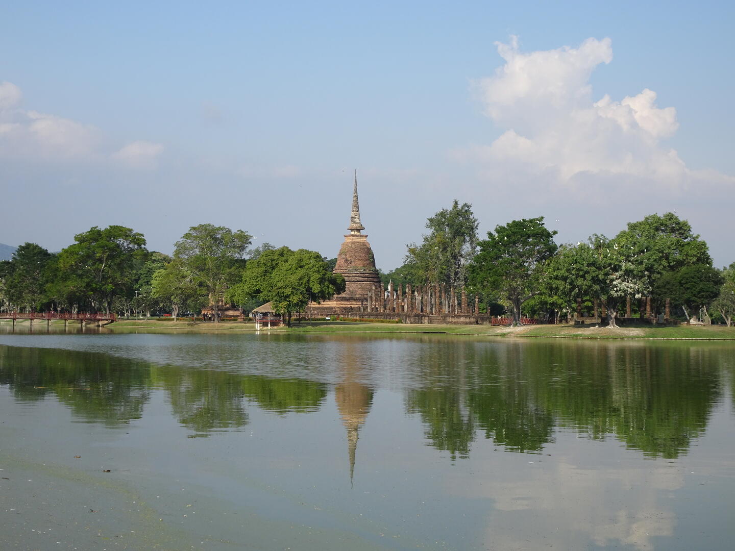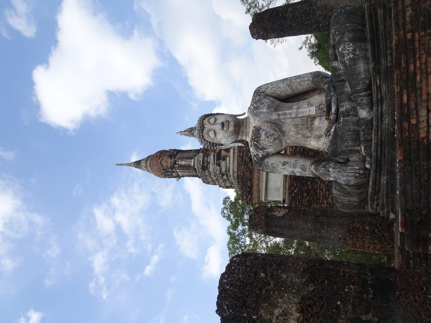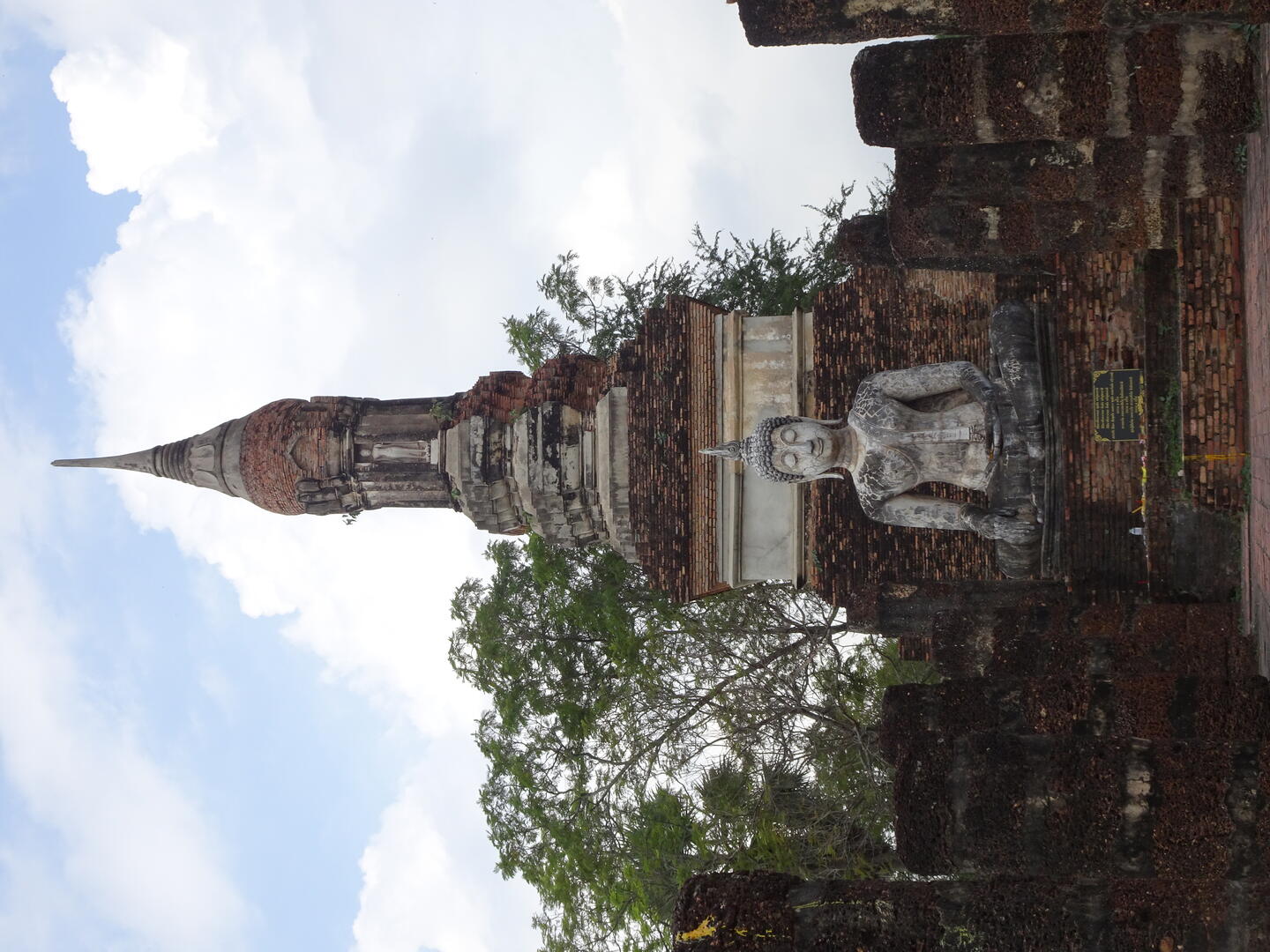 Vorgestern besuchten wir, nachdem wir uns einen Ruhetag gegönnt hatten, den Geschichtspark Sukhothai. Der große Park umfasst zusätzlich zum früher innerhalb von Dreifachstadtmauer- und -grabensystem gelegen Teil Sehenswürdigkeiten in der näheren Umgebung. Die teilweise restaurierten Klosteranlagen lassen die ehemalige Pracht dieser Stadt erahnen. Sukhothai war im 13. und 14. Jahrhundert Hauptstadt des ersten großräumigeren Königreichs der Thai. Im weiträumigen Areal legten wir mit unseren Fahrrädern etwa 15 km zurück.