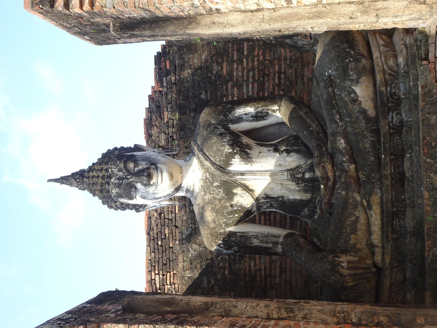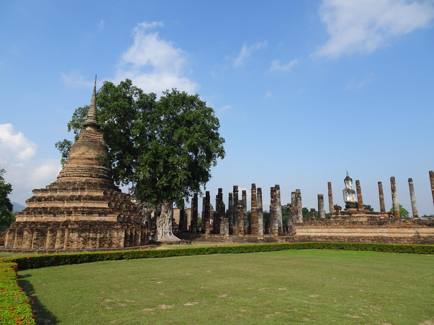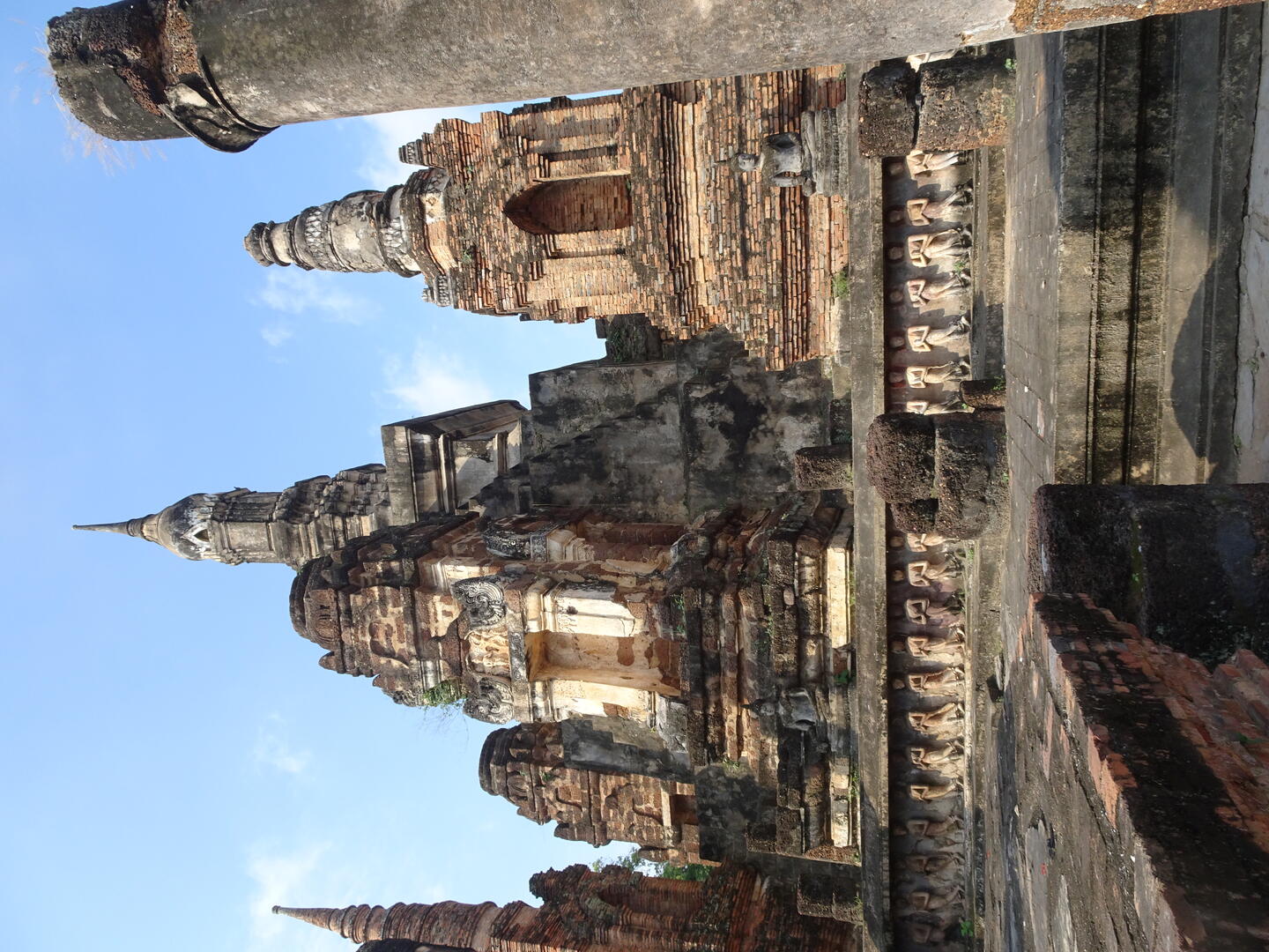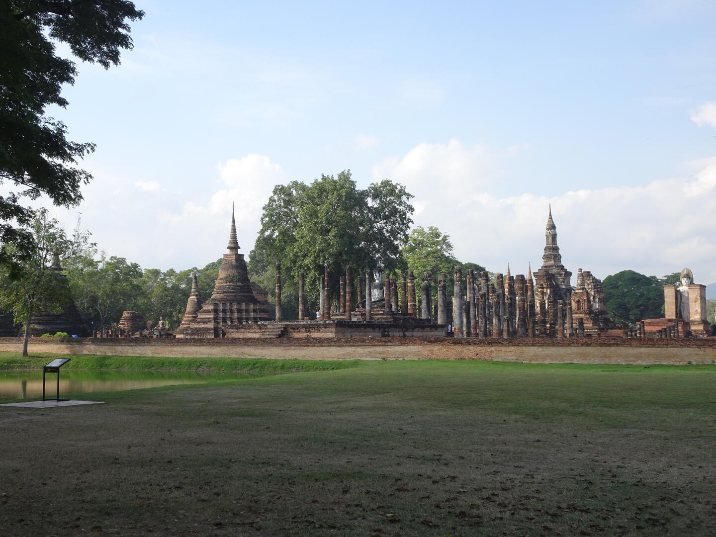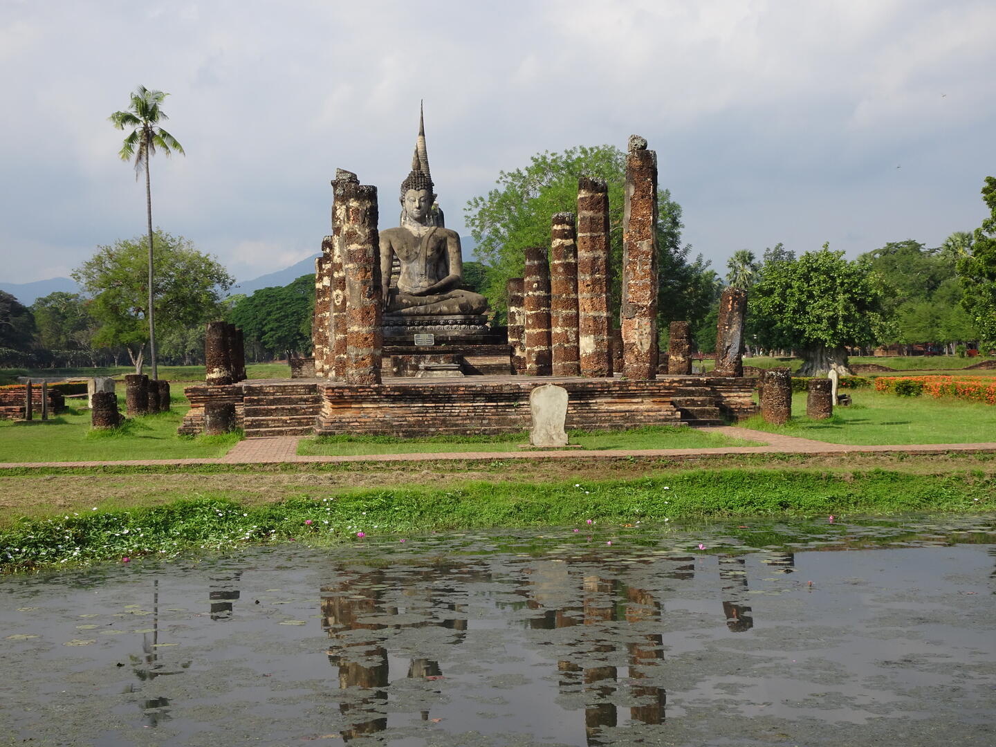 Vorgestern besuchten wir, nachdem wir uns einen Ruhetag gegönnt hatten, den Geschichtspark Sukhothai. Der große Park umfasst zusätzlich zum früher innerhalb von Dreifachstadtmauer- und -grabensystem gelegen Teil Sehenswürdigkeiten in der näheren Umgebung. Die teilweise restaurierten Klosteranlagen lassen die ehemalige Pracht dieser Stadt erahnen. Sukhothai war im 13. und 14. Jahrhundert Hauptstadt des ersten großräumigeren Königreichs der Thai. Im weiträumigen Areal legten wir mit unseren Fahrrädern etwa 15 km zurück.