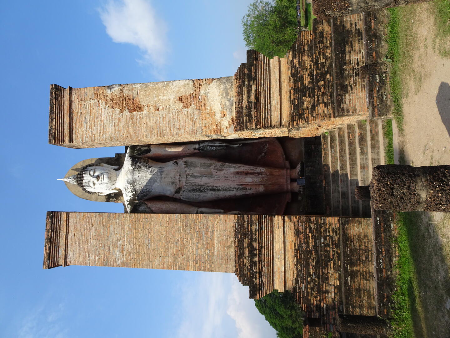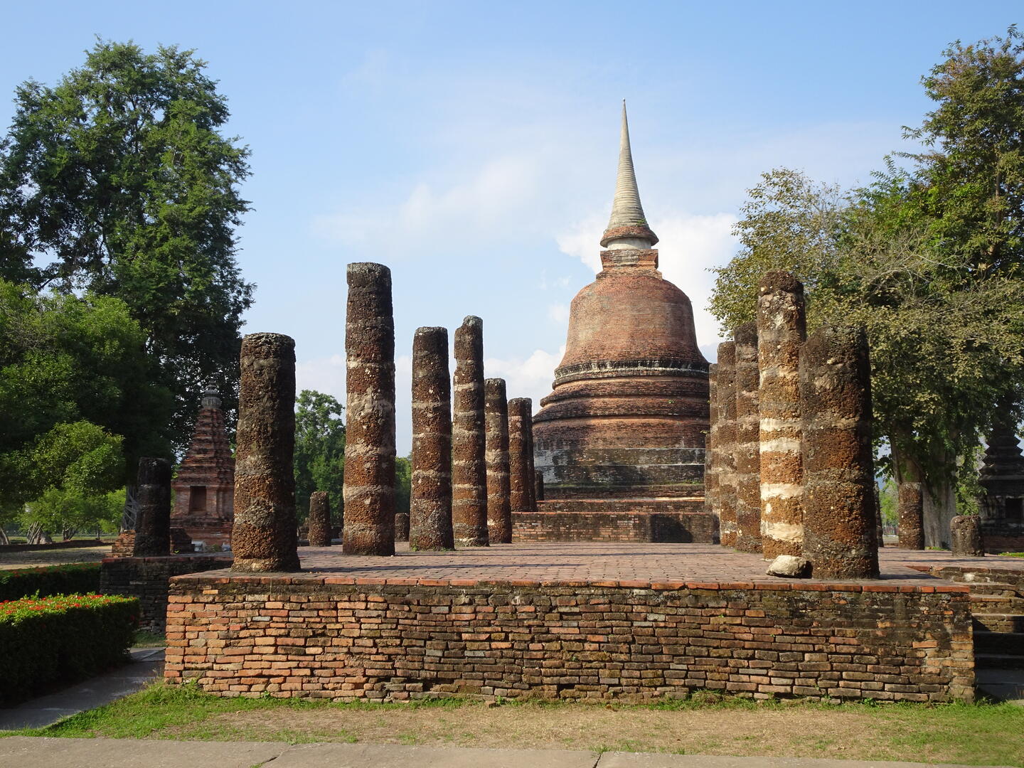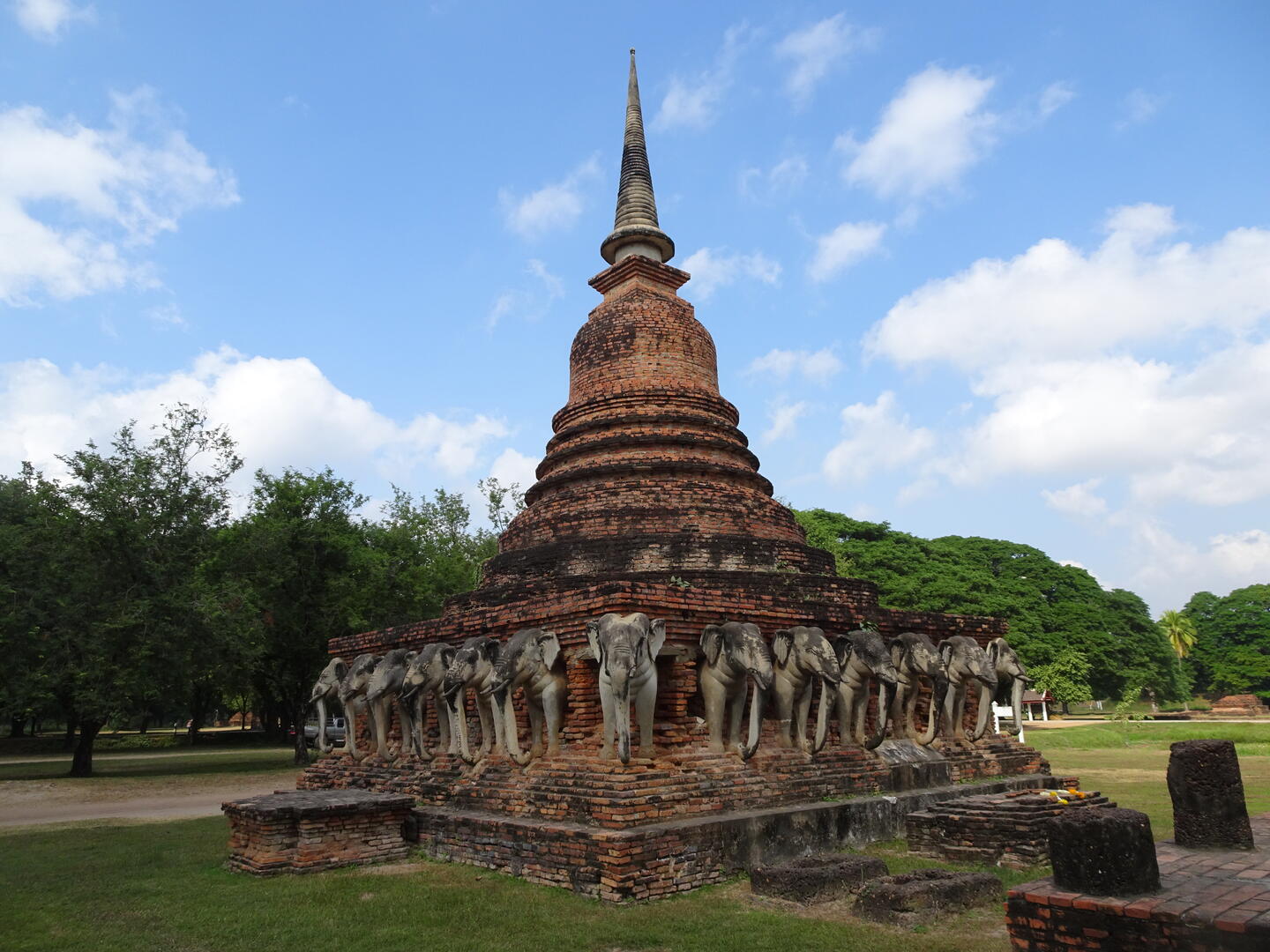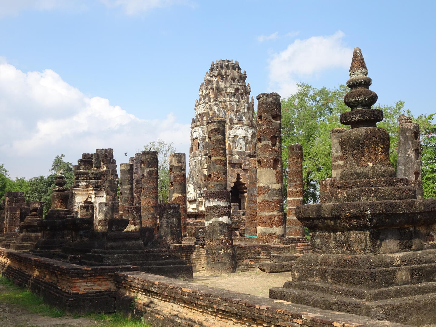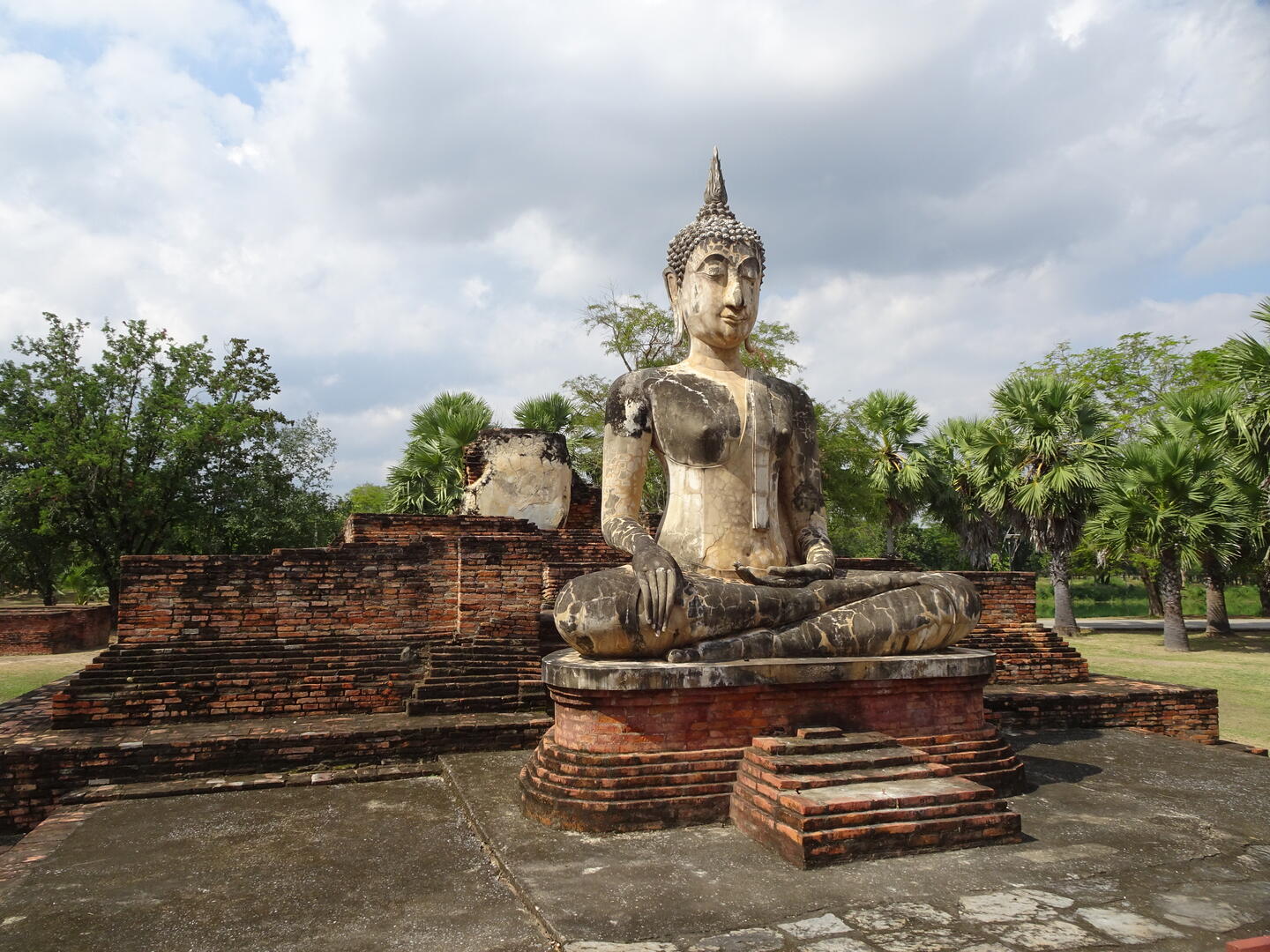 Vorgestern besuchten wir, nachdem wir uns einen Ruhetag gegönnt hatten, den Geschichtspark Sukhothai. Der große Park umfasst zusätzlich zum früher innerhalb von Dreifachstadtmauer- und -grabensystem gelegen Teil Sehenswürdigkeiten in der näheren Umgebung. Die teilweise restaurierten Klosteranlagen lassen die ehemalige Pracht dieser Stadt erahnen. Sukhothai war im 13. und 14. Jahrhundert Hauptstadt des ersten großräumigeren Königreichs der Thai. Im weiträumigen Areal legten wir mit unseren Fahrrädern etwa 15 km zurück.