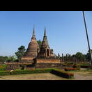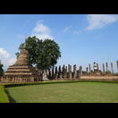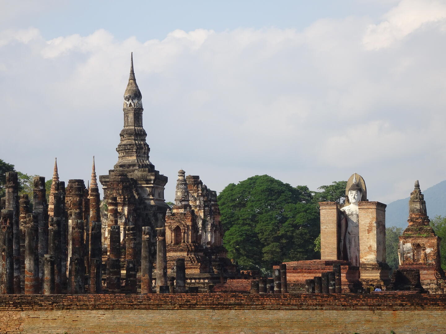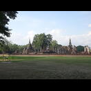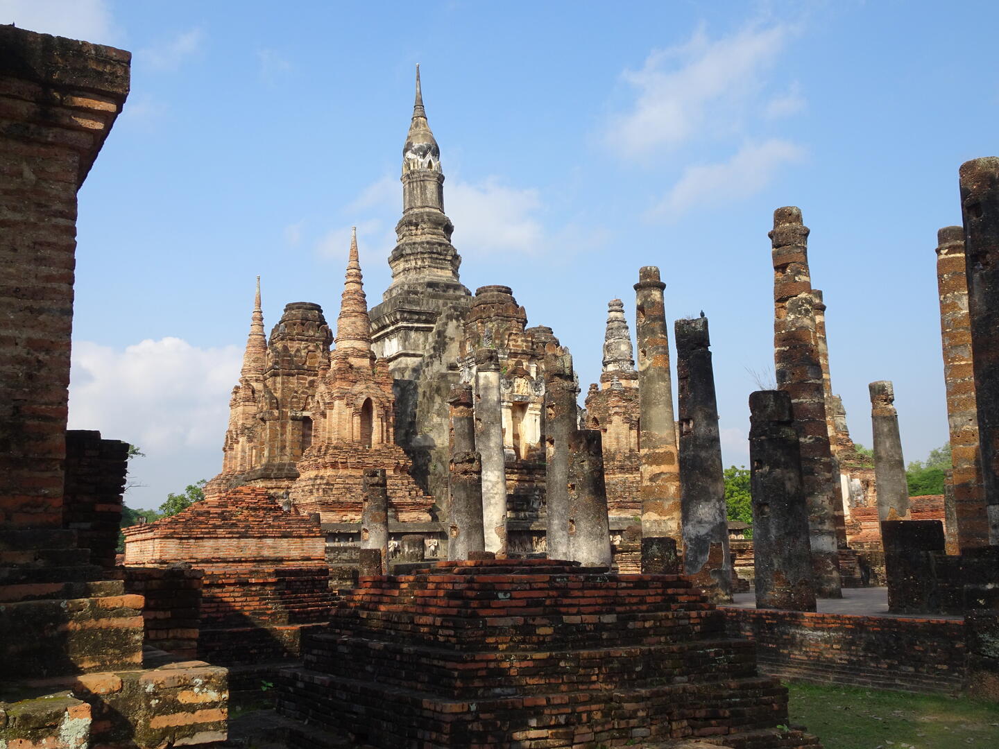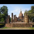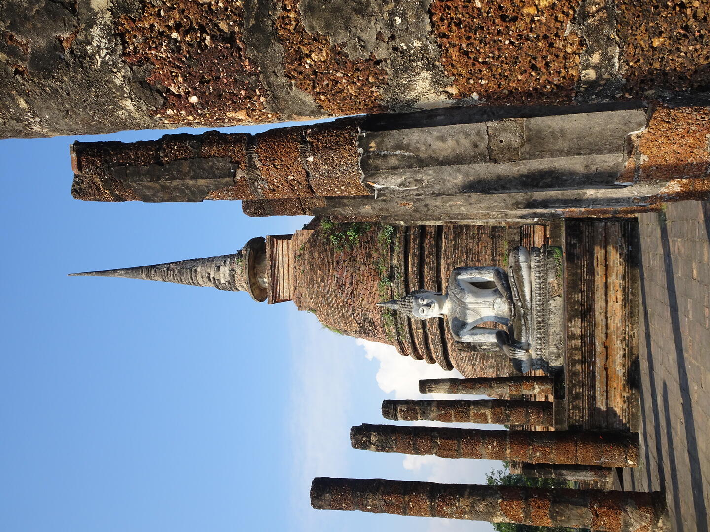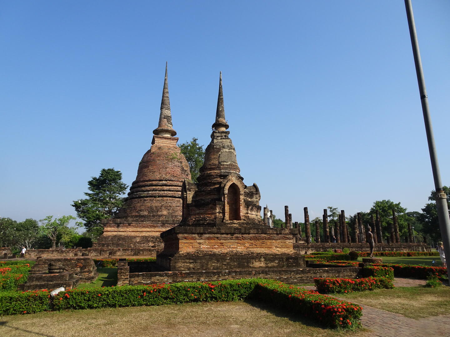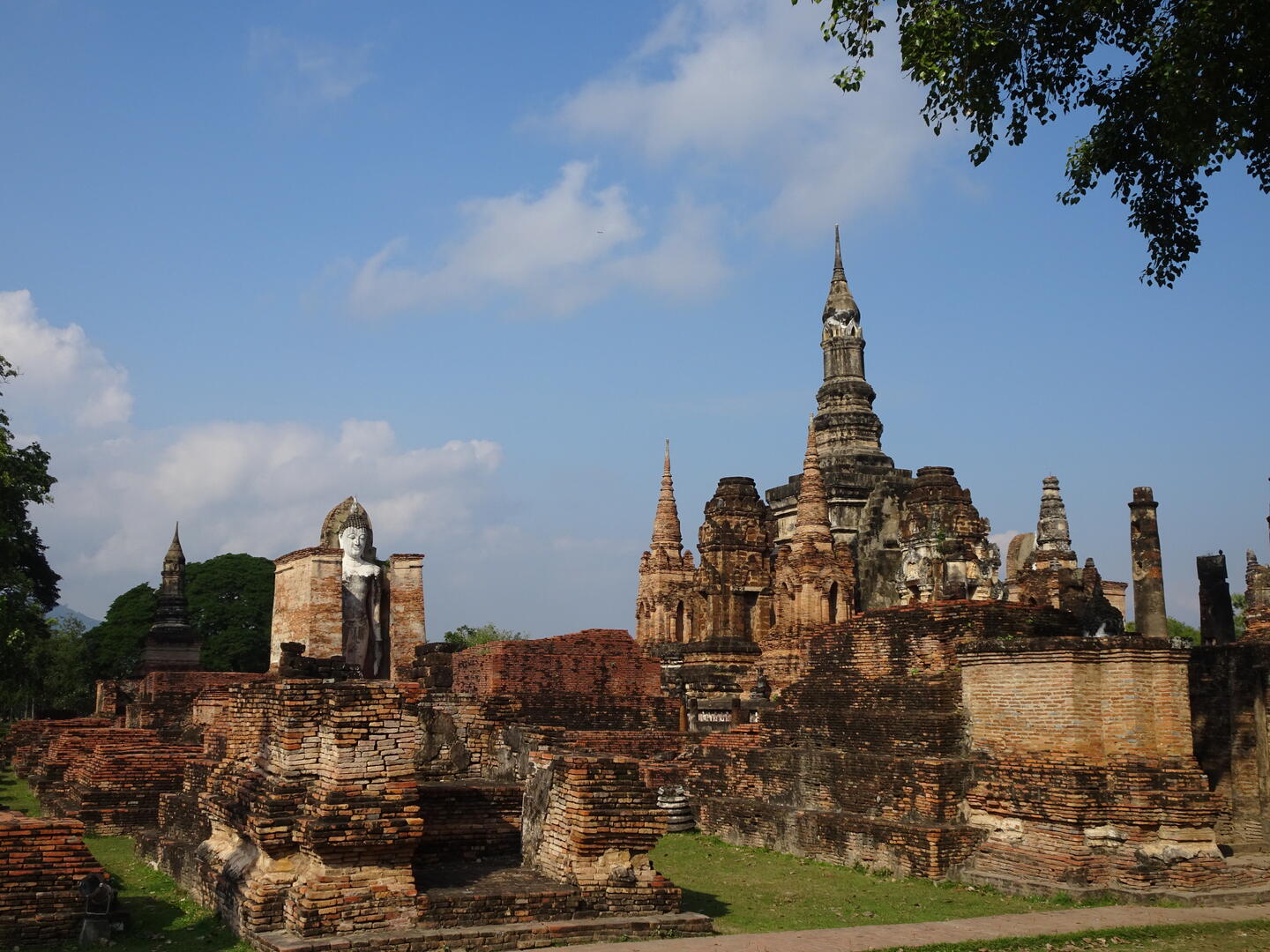 Vorgestern besuchten wir, nachdem wir uns einen Ruhetag gegönnt hatten, den Geschichtspark Sukhothai. Der große Park umfasst zusätzlich zum früher innerhalb von Dreifachstadtmauer- und -grabensystem gelegen Teil Sehenswürdigkeiten in der näheren Umgebung. Die teilweise restaurierten Klosteranlagen lassen die ehemalige Pracht dieser Stadt erahnen. Sukhothai war im 13. und 14. Jahrhundert Hauptstadt des ersten großräumigeren Königreichs der Thai. Im weiträumigen Areal legten wir mit unseren Fahrrädern etwa 15 km zurück.