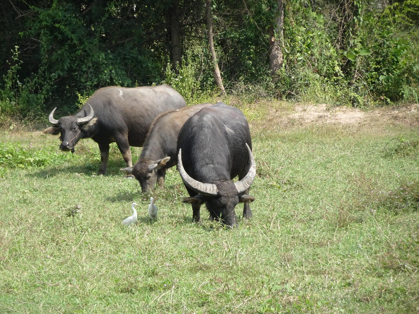 Die kurze heutige Etappe nach Phitsanulok mit nur wenigen Höhenmetern führte uns wieder durch viele Reisfelder. Wir sahen Reisfelder in allen Stadien: Frisch angepflanzte Felder, reifen Reis, abgeerntete Felder sowie eben gepflügte. Auf fußballfeldgroßen Flächen wird Reis getrocknet.