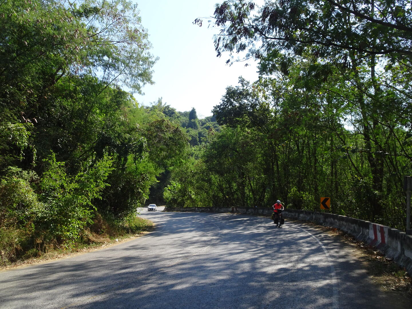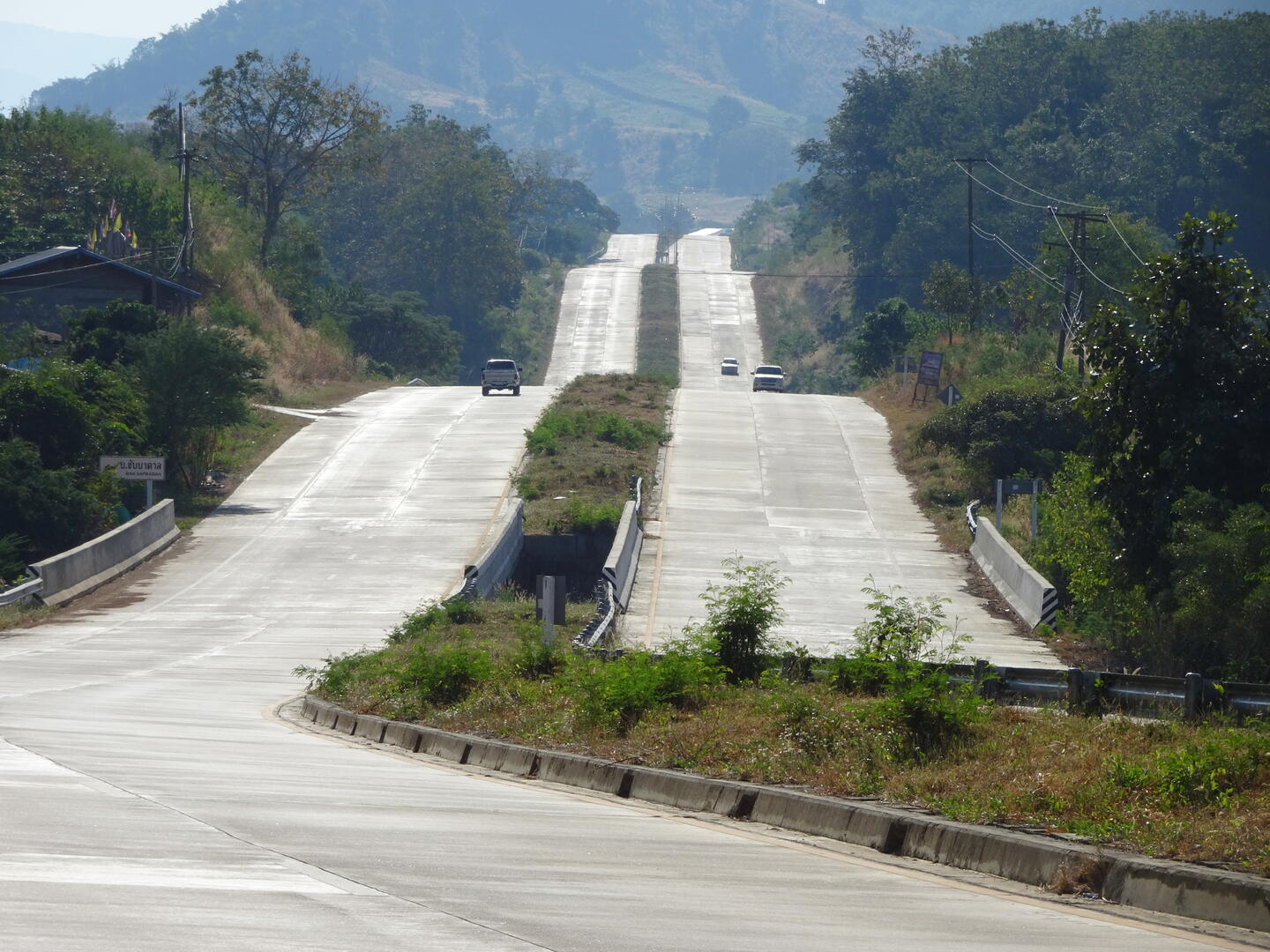 In Phetchabun ist der Highway vierspurig, in gutem Zustand und mit breitem Seitenstreifen. Das änderte sich, als wir in die Provinz Chaiyaphum kamen: Die Straße ist dort nur zweispurig, mit deutlich schlechterem Belag und ohne erkennbaren Seitenstreifen. Hätte mehr Verkehr geherrscht, wäre das auf der kurvenreichen und relativ steilen Strecke unangenehm gewesen.