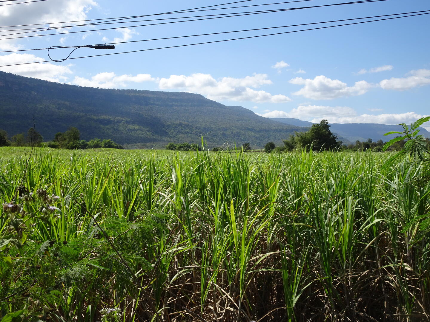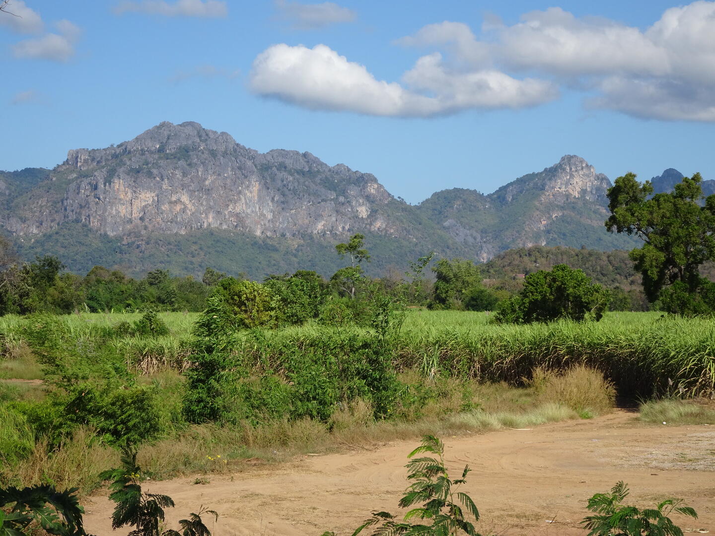 Gestern hatten wir noch gehofft, die heutige Etappe ausdehnen zu können, um die Chance zu wahren, in nur zwei langen Etappen das Zwischenziel Khon Kaen zu erreichen. Das wäre vielleicht noch möglich gewesen, hätte nicht ein kräftiger Gegenwind und ein die Durchschnittsgeschwindigkeit merklich drückendes ständiges Auf-und-Ab der Straße das Erreichen unseres Ziels bei Tageslicht infrage gestellt. Entschädigt wurden wir für die Mühe mit einer abwechslungsreichen, von zwei Höhenzügen flankierten Strecke.