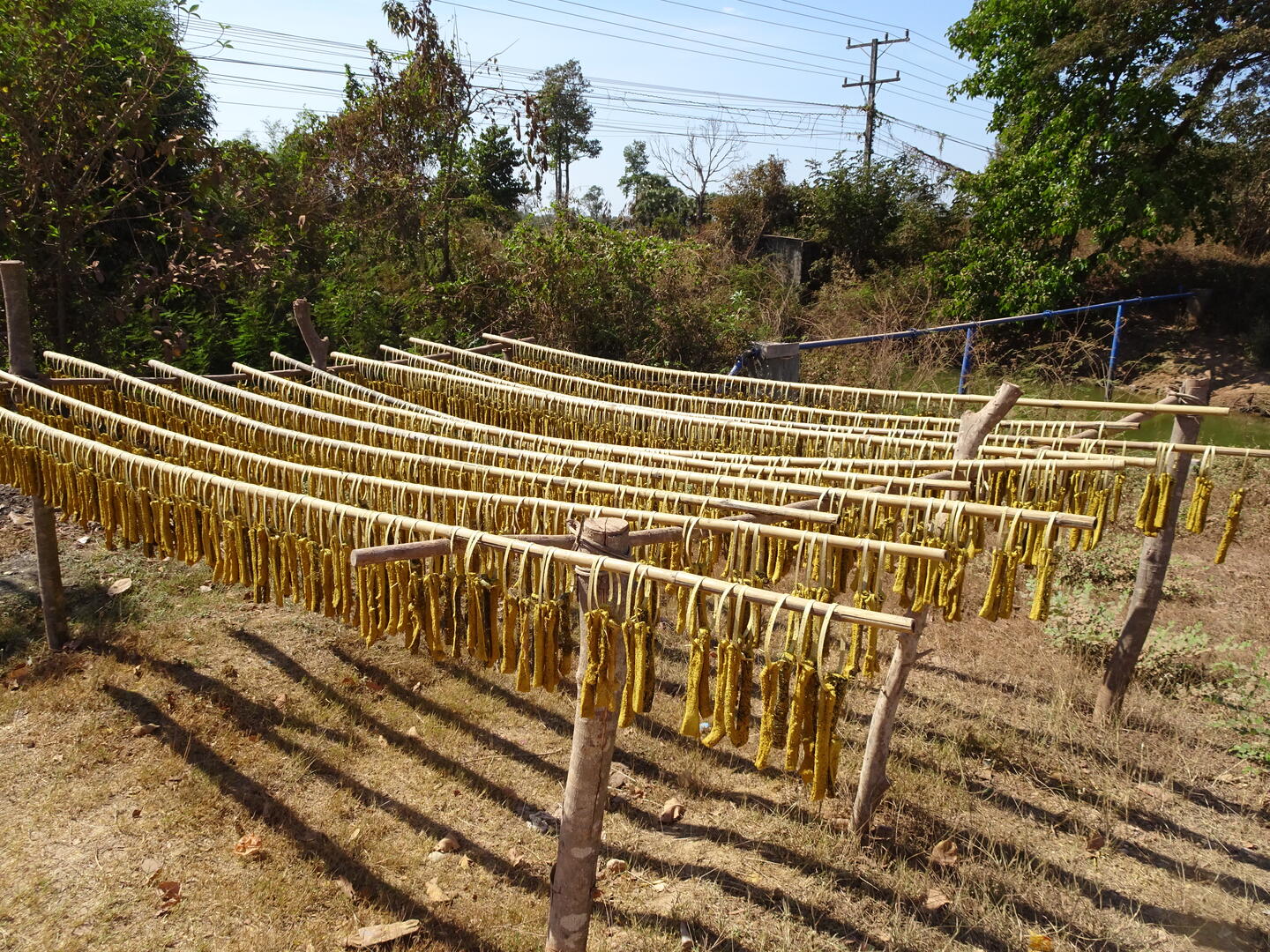 Am Vorabend besorgte Baguettes, belegt mit Fleischwurst und einer ungewohnt süßen Hartwurst, frühstückten wir heute in unserem Zimmer. Wie sich zeigte, hätten wir andernfalls recht lange mit nüchternem Magen fahren müssen, da die Garküchen im Ort noch geschlossen hatten und sich auch im Anschluss lange keine Gelegenheit ergeben hätte.