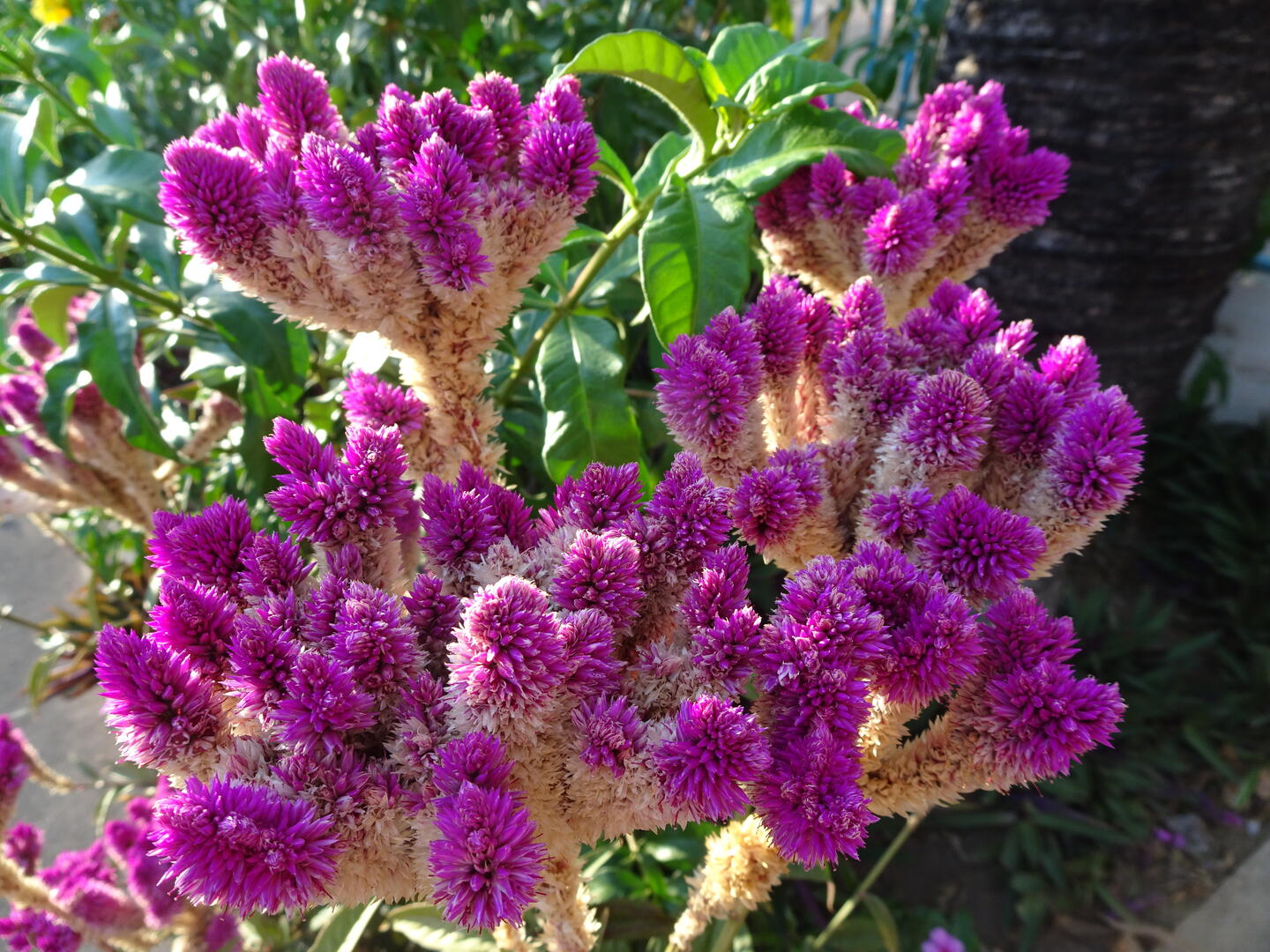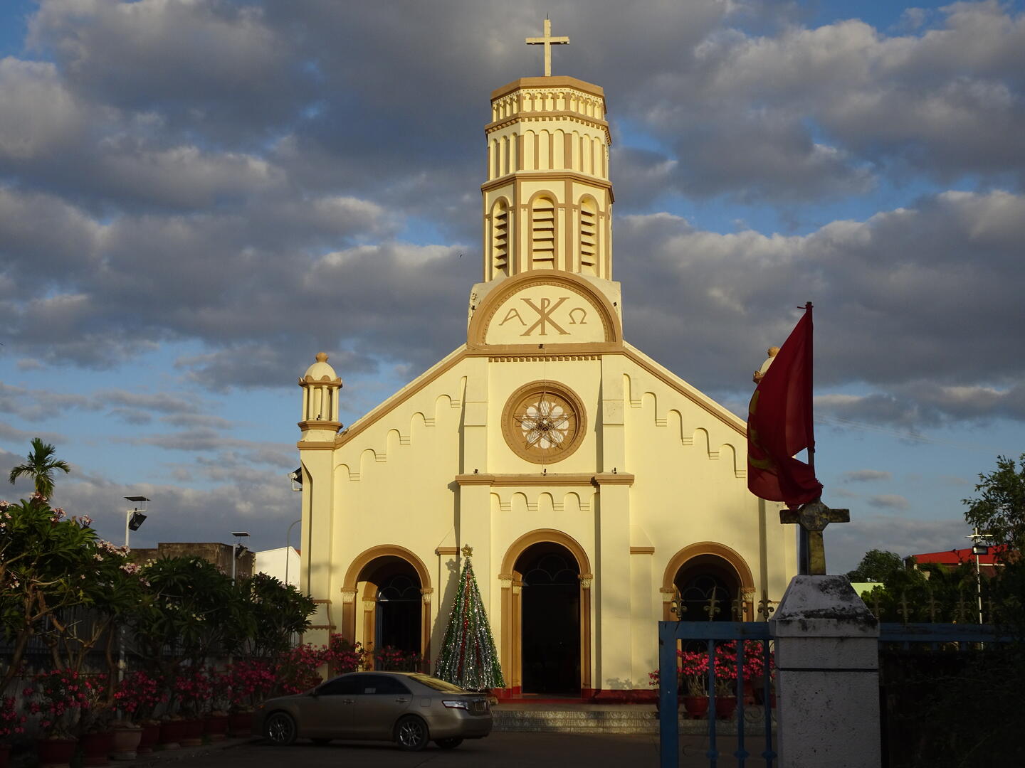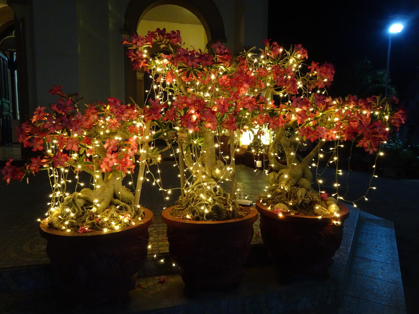 Illuminierte Wüstenrosen vor der katholischen Kirche