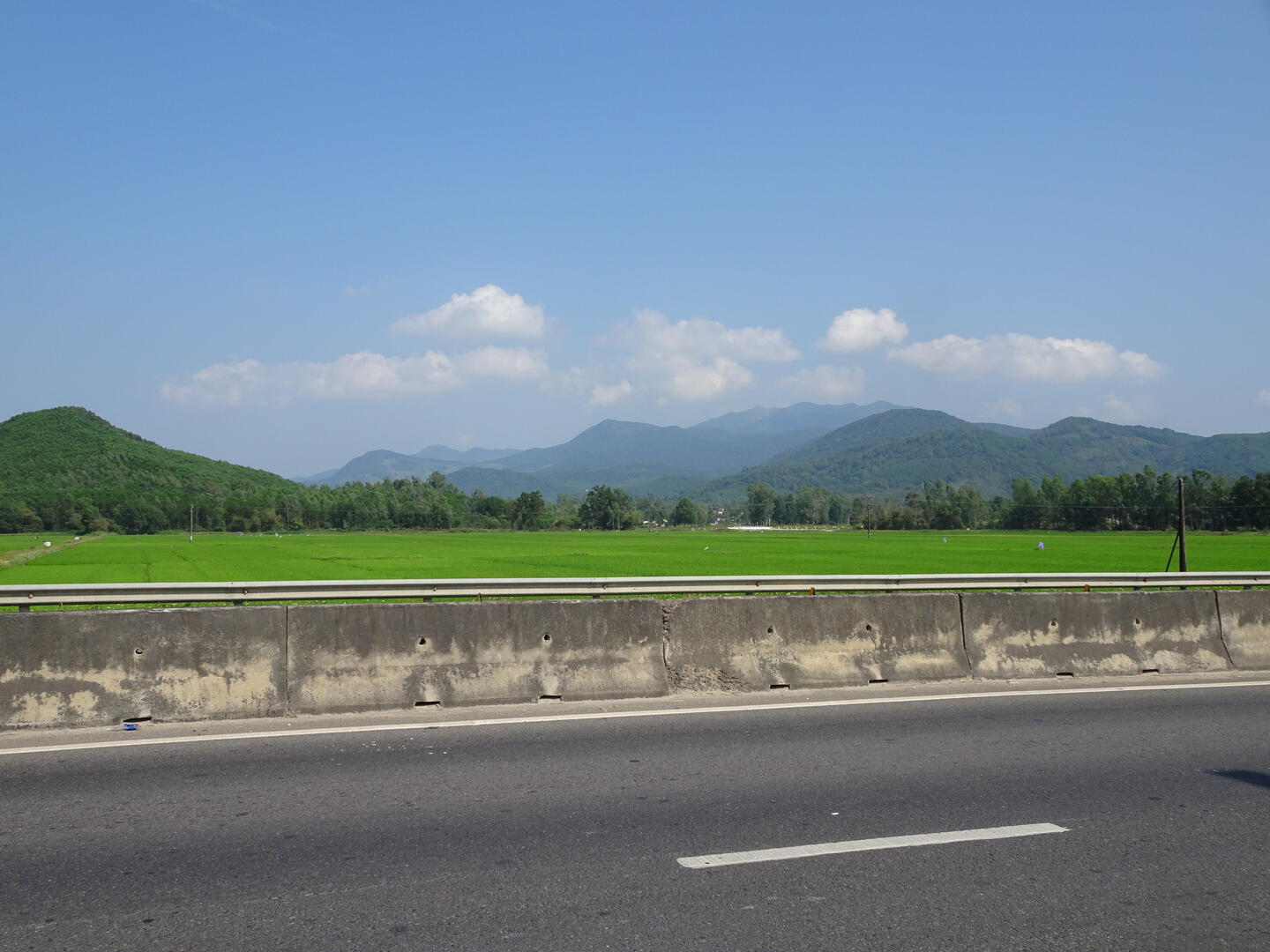 Es herrschte noch immer Gegenwind, jedoch nicht mehr so stark wie gestern. Die Straße verläuft etwas landeinwärts zwischen Bergketten. Kurz nach unserem Start kehrten wir in einem gut besuchten Imbiss ein. Dem Standardgericht, einer sehr guten und reichhaltigen Nudelsuppe trauten wir nicht zu, uns für die anstehende Etappe mit ausreichend Energie zu versorgen. Daher orderten wir im Anschluss an die Suppen jeweils noch ein Nudelgericht. So gestärkt schafften wir es bis zum ebenfalls sehr guten Mittagessen. Da die Etappe relativ kurz war, nahmen wir uns Zeit für Kaffeepausen nach dem Frühstück und Mittagessen. Frisch gepresstem Zuckerrohrsaft konnten wir ebenfalls nicht widerstehen. Trotz der Pausen erreichten wir unser Ziel noch vor 15 Uhr. Nach dem Check-in und dem Duschen blieb noch genug Zeit für die nach zwei Etappen anstehende Wäsche, die wir noch kurz vor der Dunkelheit auf dem Dach unseres Hotels zum Trocknen aufgehängt haben.