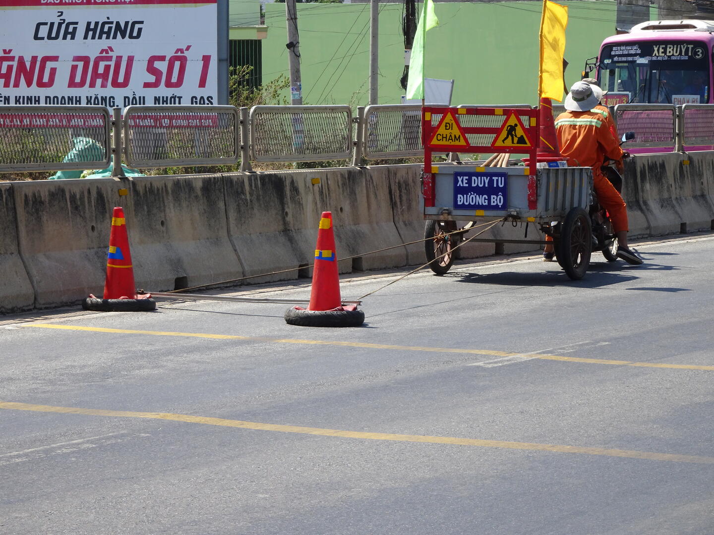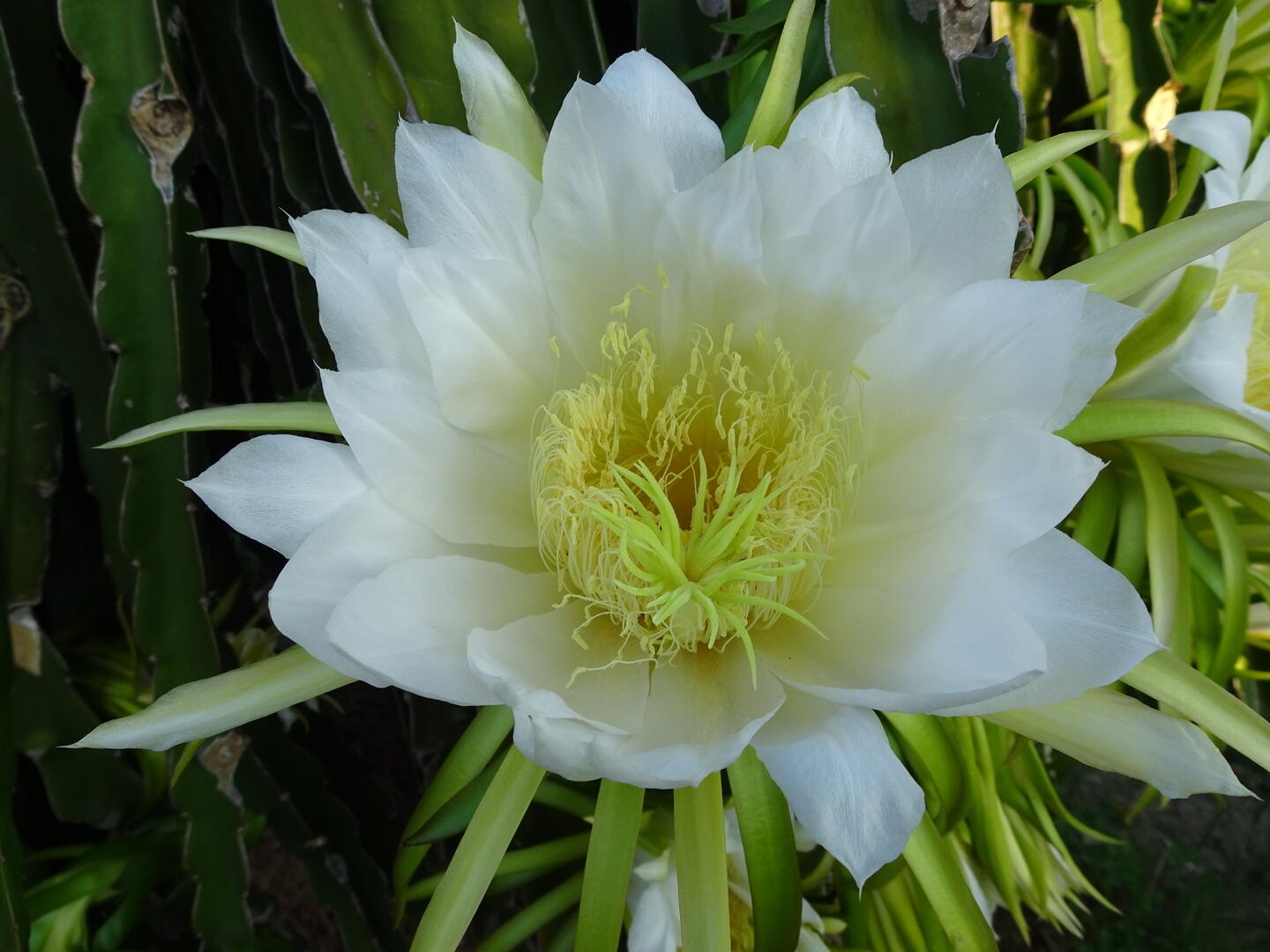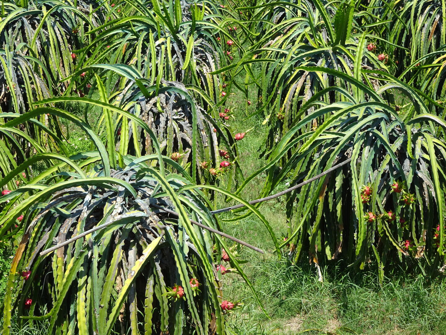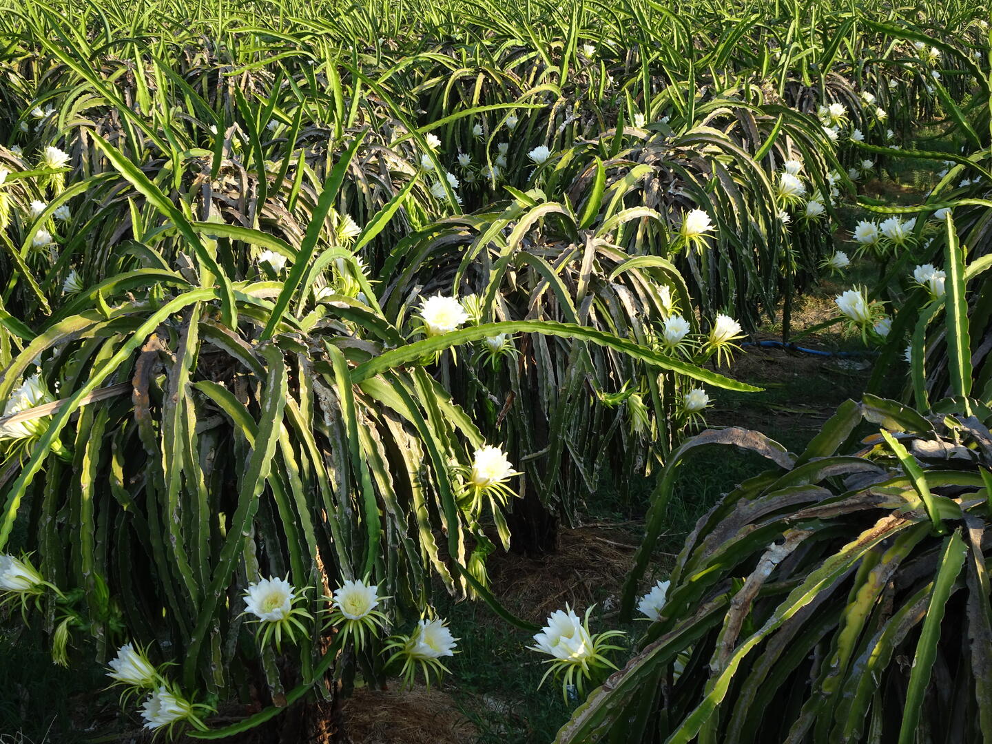 Heute war kein Reifen platt, wir fanden nach etwa 300 m eine Gelegenheit zum Frühstücken und konnten anschließend gegen 6:30 Uhr losfahren. Die Stadtmitte mit ihren vielen unberechenbaren Mopedfahrern hatten wir schnell hinter uns gelassen. Die ersten etwa 40 km ging es fast unmerklich bergauf. Auch heute herrschte meist Rückenwind. Wir stärkten uns mit Eiskaffee und Zuckerrohrsaft und durchfuhren große Plantagen mit Drachenfruchtpflanzen. Auf einem großen Feld waren in der vergangenen Nacht die Blüten aufgegangen. Sie schließen sich am Morgen, doch wir waren früh genug, um die ungewöhnlich großen Blüten offen zu sehen. Auf einem anderen Feld sahen wir Pflanzen mit noch nicht ausgewachsenen Früchten. Anscheinend kann man die Wachstumsphasen der Pflanzen so steuern, dass man über das ganze Jahr Früchte ernten kann.