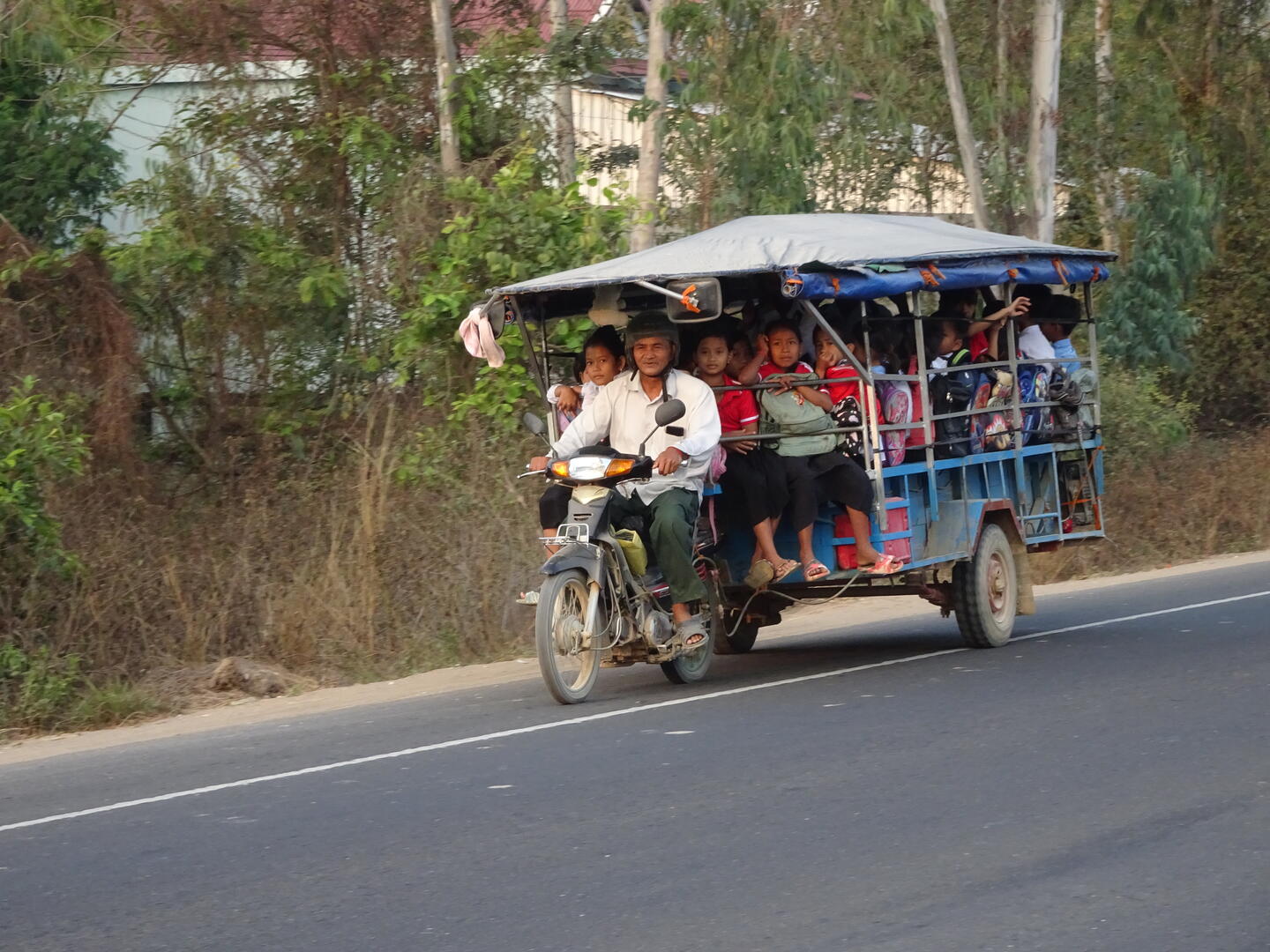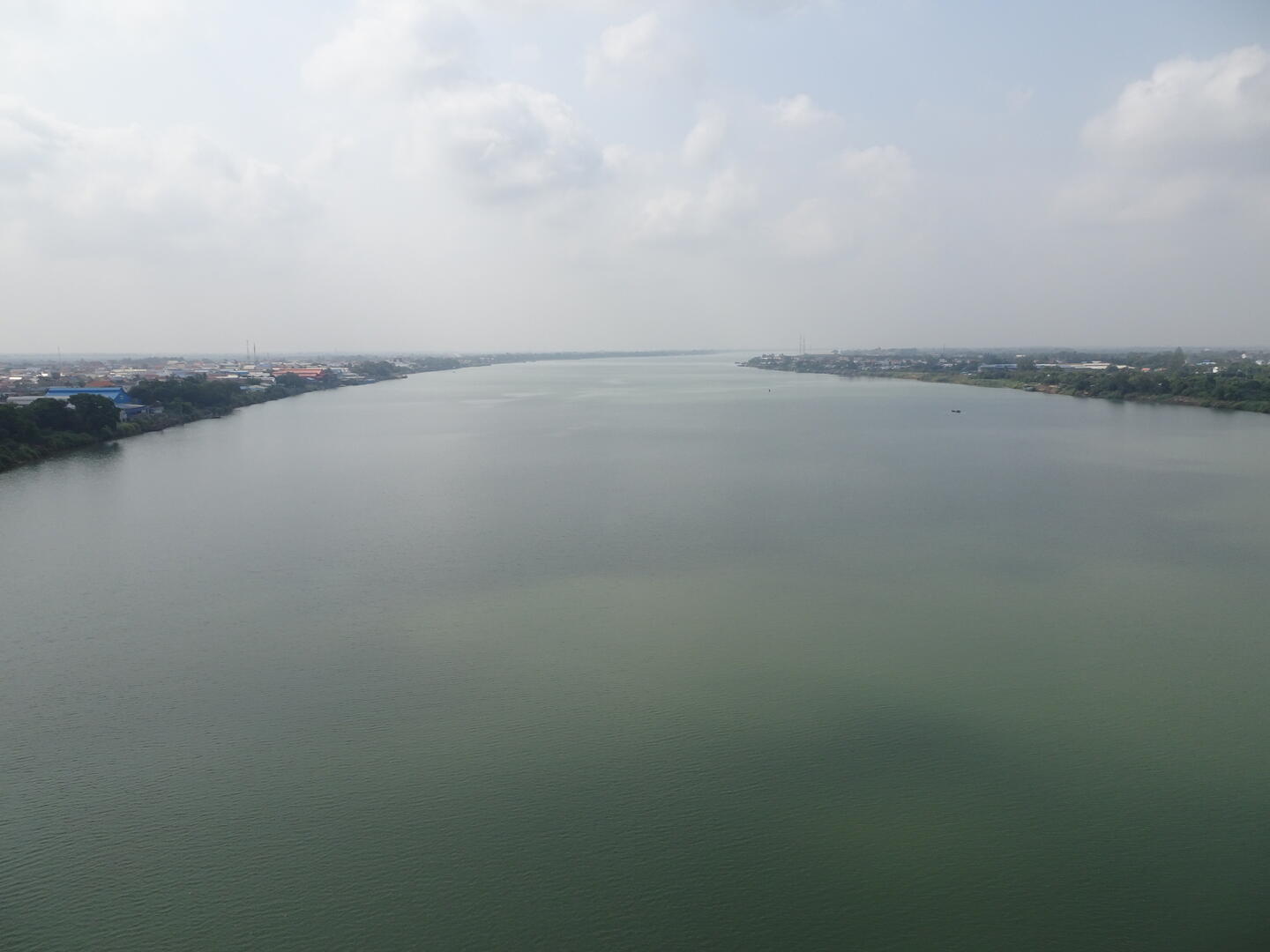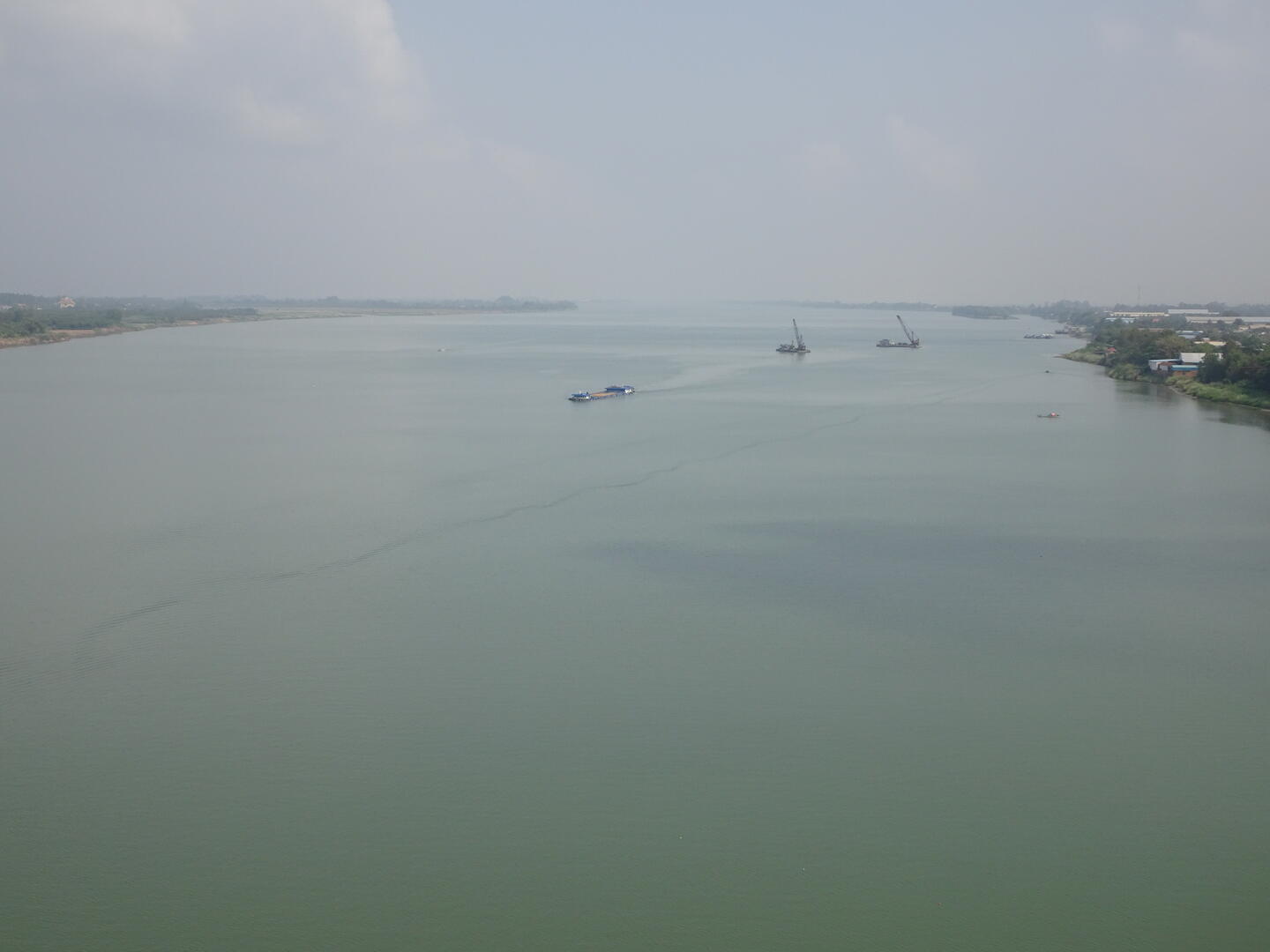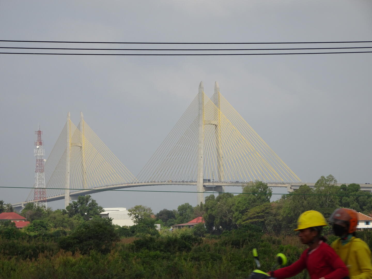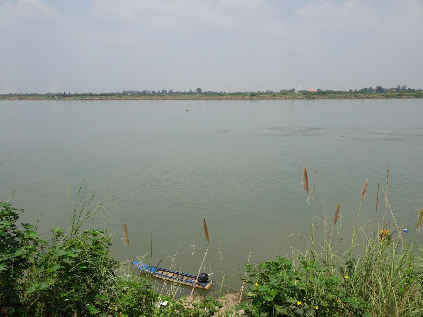 Bereits etwa 30 km vor der kambodschanischen Hauptstadt, Phnom Penh, nahm der Verkehr zu. Die Zahl der Mopeds erhöhte sich und es wurde großstadttypisch schneller, aggressiver und mit geringem Sicherheitsabstand gefahren. Den Mekong, dessen Verlauf wir anschließend bis Phnom Penh folgten, überquerten wir auf der beeindruckenden, 2,2 km langen Tsubasa-Brücke. Von der hohen Brücke hatten wir gute Sicht auf die flache und breite Mekongebene sowie auf den majestätischen Strom. Die Einheimischen scheinen weniger Wert auf die Aussicht auf den Fluss zu legen. An einer Stelle, an der der AH1 dem Mekong sehr nahe kommt, gibt es zwar viele einfache Lokale, doch alle hatten zwischen dem Bereich für die Gäste und dem Fluss entweder die Küche oder hohe Wellblechzäune gesetzt. Von keinem der Plätze ist der Mekong zu sehen. Um einen Blick auf den Fluss zu werfen, mussten wir erst die Küche eines Lokals passieren.
