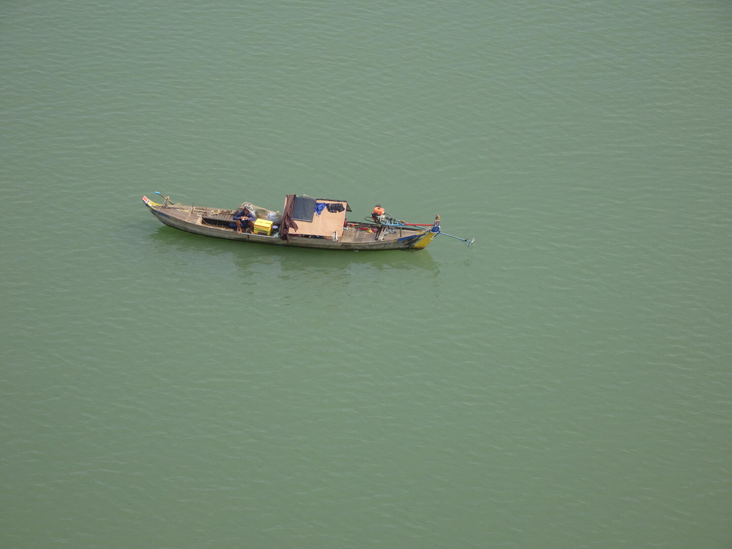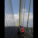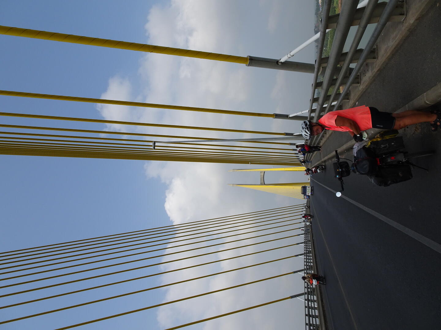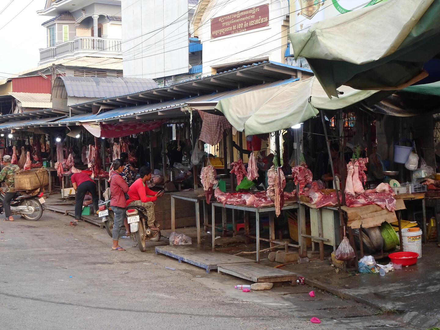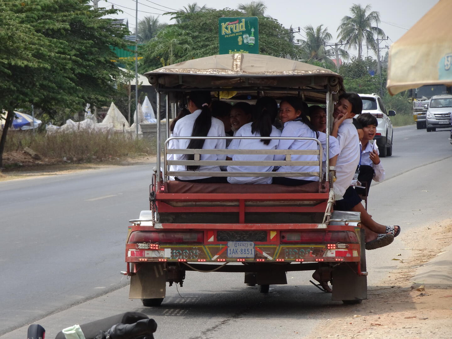 Bereits etwa 30 km vor der kambodschanischen Hauptstadt, Phnom Penh, nahm der Verkehr zu. Die Zahl der Mopeds erhöhte sich und es wurde großstadttypisch schneller, aggressiver und mit geringem Sicherheitsabstand gefahren. Den Mekong, dessen Verlauf wir anschließend bis Phnom Penh folgten, überquerten wir auf der beeindruckenden, 2,2 km langen Tsubasa-Brücke. Von der hohen Brücke hatten wir gute Sicht auf die flache und breite Mekongebene sowie auf den majestätischen Strom. Die Einheimischen scheinen weniger Wert auf die Aussicht auf den Fluss zu legen. An einer Stelle, an der der AH1 dem Mekong sehr nahe kommt, gibt es zwar viele einfache Lokale, doch alle hatten zwischen dem Bereich für die Gäste und dem Fluss entweder die Küche oder hohe Wellblechzäune gesetzt. Von keinem der Plätze ist der Mekong zu sehen. Um einen Blick auf den Fluss zu werfen, mussten wir erst die Küche eines Lokals passieren.