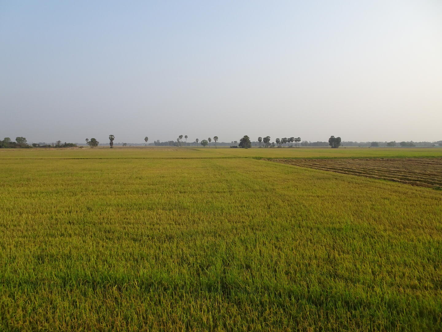 Bei unserem Aufbruch war die Luftfeuchte heute niedriger als an den vergangenen Tagen. Die Nachtemperaturen sind weiterhin hoch, sodass es am Morgen noch etwa 26 Grad warm war. Es herrschte anfangs noch immer der leichte Gegenwind, der uns gestern veranlasst hatte, die Etappe nicht auszudehnen. Dagmar fuhr so gut es ging im Windschatten. Später schwächte sich der Wind ab und das Fahren wurde entspannter. Wir durchfuhren bei mäßigem Verkehr ein sehr flaches, überwiegend landwirtschaftlich genutztes Gebiet.